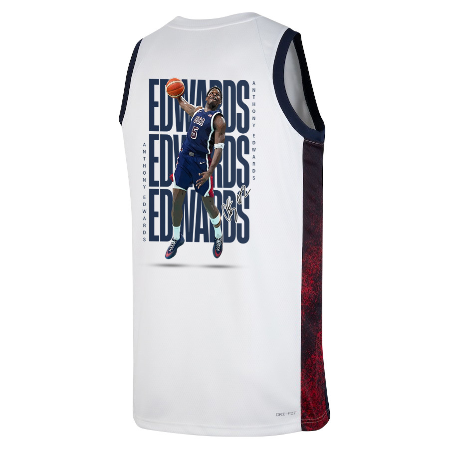 Elevate your game-day look or daily style with the Anthony Edwards 5 Key Player USA Basketball 2024 Swingman Jersey in white multicolor. This lightweight, breathable sports jersey is crafted from 100% polyester for superior comfort, moisture-wicking performance, and durability during workouts, training sessions, or casual outings. The classic fit offers unrestricted movement, making it perfect for basketball enthusiasts, fans, or anyone seeking versatile athletic wear. Featuring a clean design with player-inspired details, it’s ideal for pairing with shorts, jeans, or athleisure. Available in adult sizes S-3XL, this new unisex jersey ensures a comfortable fit for all. Not affiliated with any professional teams or leagues.