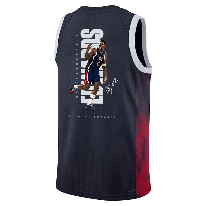 Elevate your fan gear with the Anthony Edwards 5 Olympic Paris 2024 Men’s USA Basketball Unisex Swingman Player Jersey in navy multicolor. Crafted from 100% polyester, this lightweight and breathable fabric ensures maximum comfort and airflow, keeping you cool during workouts, games, or casual outings. The classic fit offers versatility for training sessions, daily wear, or showing USA pride in fan-inspired outfits. Featuring the iconic Anthony Edwards #5 design from the Paris 2024 Olympics, this new adult jersey is available in sizes S to 3XL. Durable construction stands up to everyday use while maintaining a clean, stylish look that pairs easily with shorts, jeans, or athletic wear. Perfect for basketball enthusiasts, Olympic supporters, or anyone seeking high-quality athletic apparel. Note: This is a generic sports jersey not affiliated with professional teams or leagues.