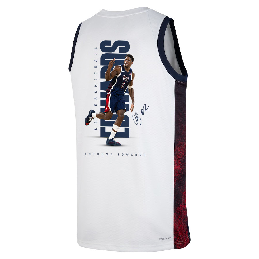 Elevate your fan style with the Anthony Edwards 5 Olympic Paris 2024 Men’s USA Basketball Unisex Swingman Player Jersey in white multicolor. Crafted from 100% polyester, this lightweight and breathable fabric ensures maximum comfort and ventilation during workouts, training sessions, or casual everyday wear. The classic fit offers a versatile silhouette that pairs effortlessly with shorts, jeans, or athletic gear for fan-inspired outfits.