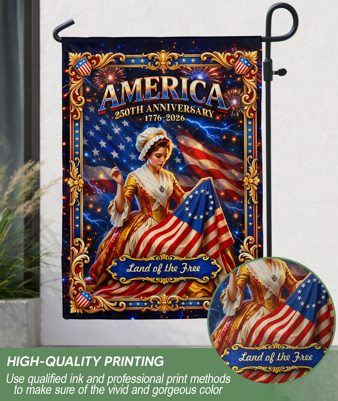 Celebrate America’s 250th anniversary with this Betsy Ross-inspired garden flag. Featuring vintage patriotic artwork from 1776 and the ‘Land of the Free’ theme, this elegant outdoor flag honors timeless American heritage and pride. Perfect for garden, yard, porch, or patio decoration, it adds a classic, meaningful touch to any outdoor space. Durable design withstands weather elements while showcasing historical charm for Independence Day, Memorial Day, or everyday patriotism.