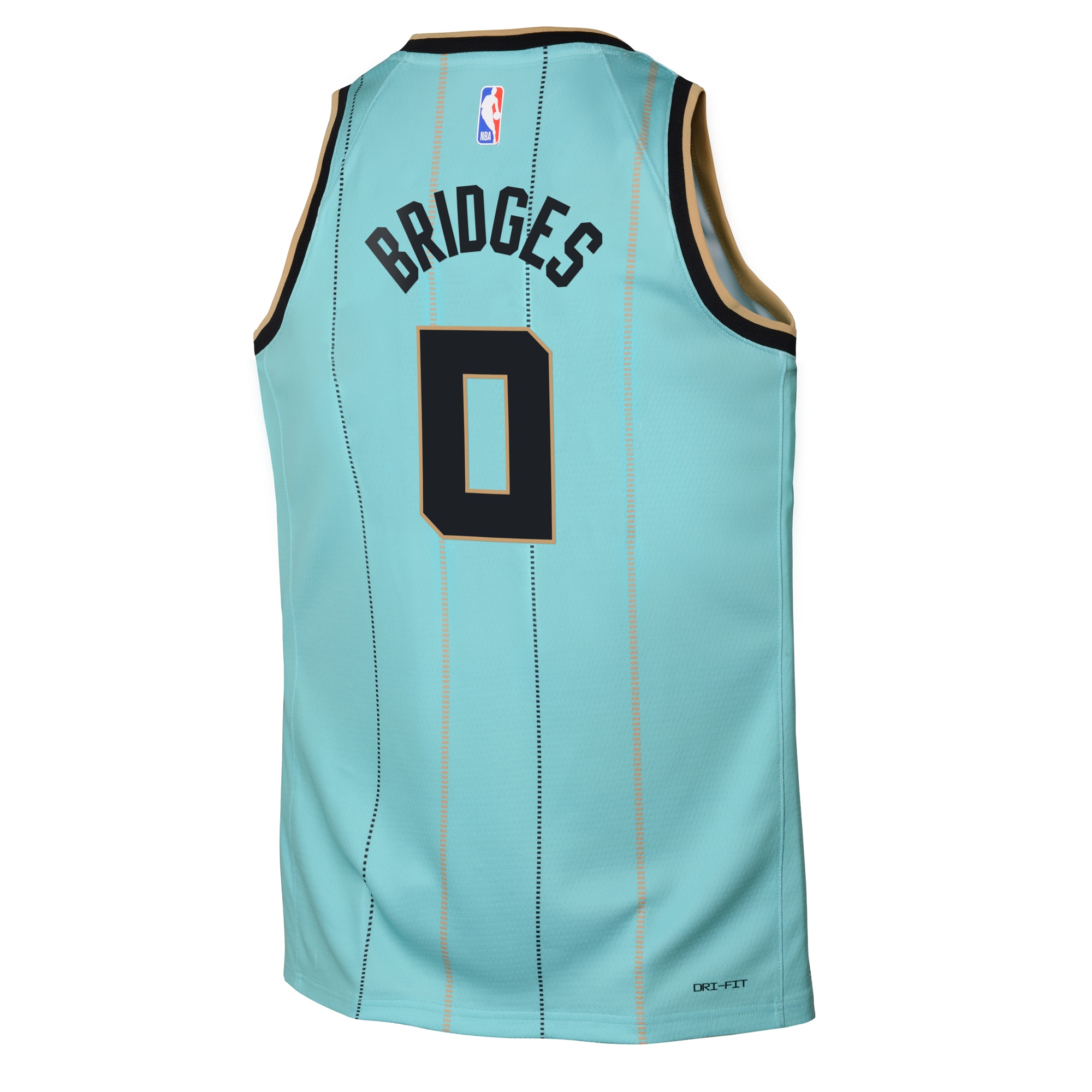 Replica the official Jordan Brand City Edition Swingman jersey of the Charlotte Hornets 2024, featuring player Miles Bridges in teal verde azulado color. Designed for youth fans, this lightweight 100% polyester jersey offers superior breathability and comfort for game days, training sessions, or casual streetwear. The Swingman construction mimics authentic NBA jerseys with durable stitching, classic fit, and vibrant team graphics including the Hornets logo and Bridges name/number. Perfect for young basketball enthusiasts showing team pride. Machine washable, available in sizes S to 3XL. Not affiliated with NBA.
