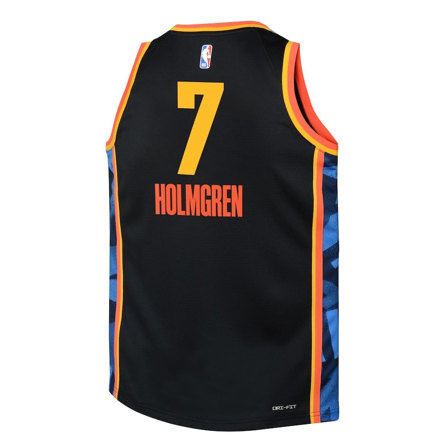The Chet Holmgren 7 Oklahoma City Thunder 2024/25 Swingman Player Youth Jersey in City Edition Black is a lightweight, breathable sports jersey perfect for young fans. Crafted from 100% polyester, it offers superior comfort, durability, and moisture-wicking performance to keep kids cool during games, practices, or casual wear. The classic fit and clean design feature the iconic player name, number 7, and Thunder City Edition graphics, making it ideal for fan-inspired outfits or everyday style. Suitable for training, school events, or cheering on the Thunder. Available in youth sizes S to 3XL. New condition, multicolor accents on black base. Note: This is a generic sports apparel item, not affiliated with professional teams or leagues.