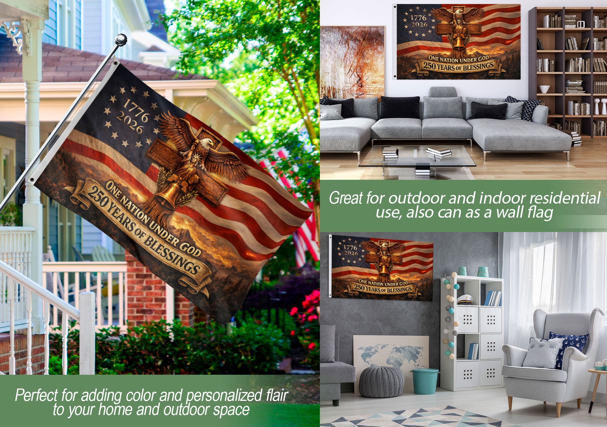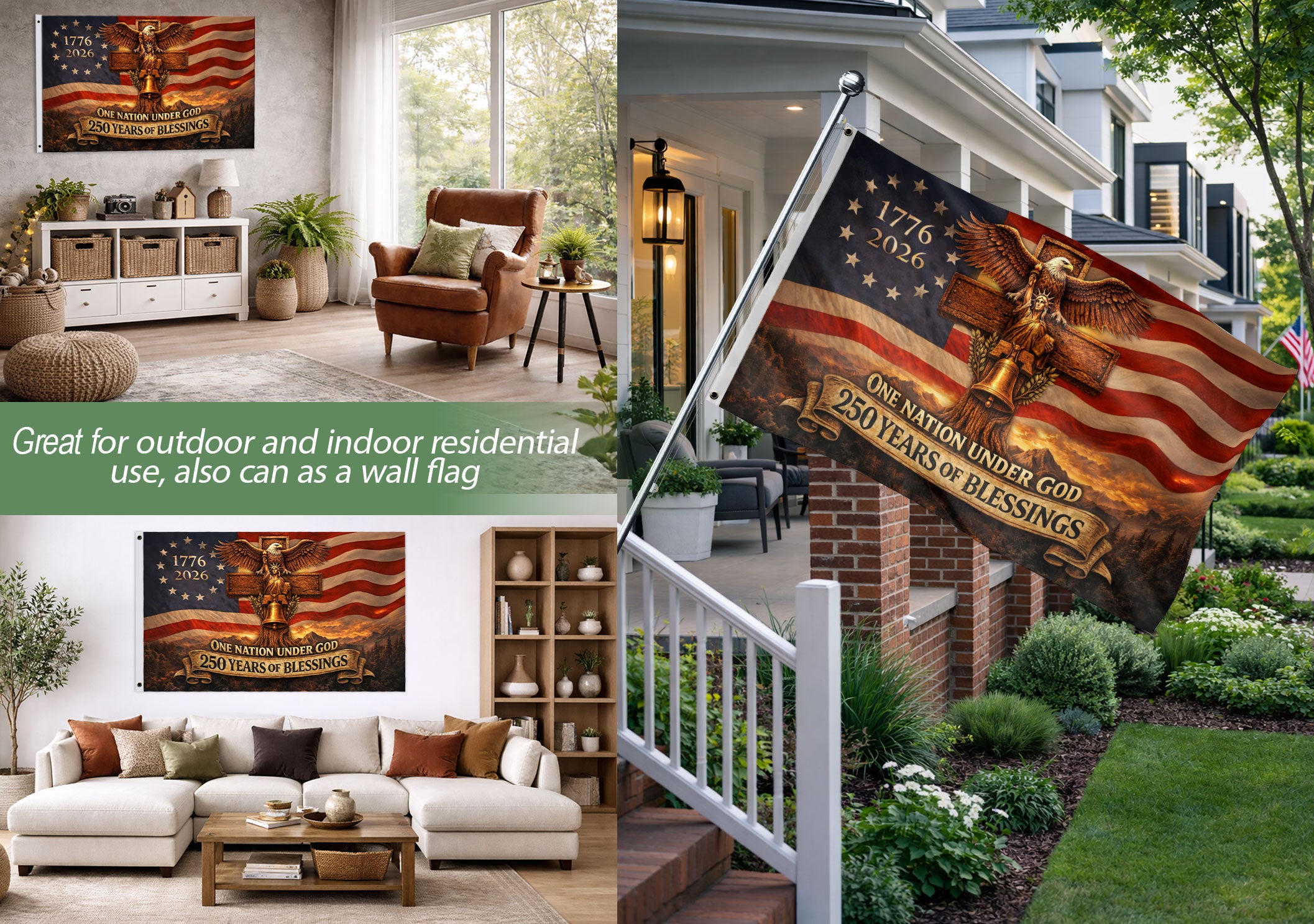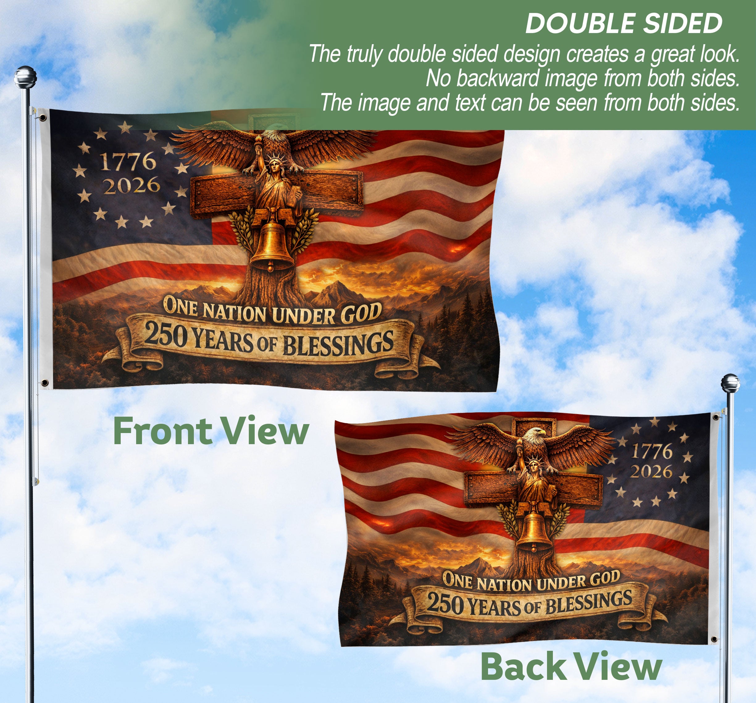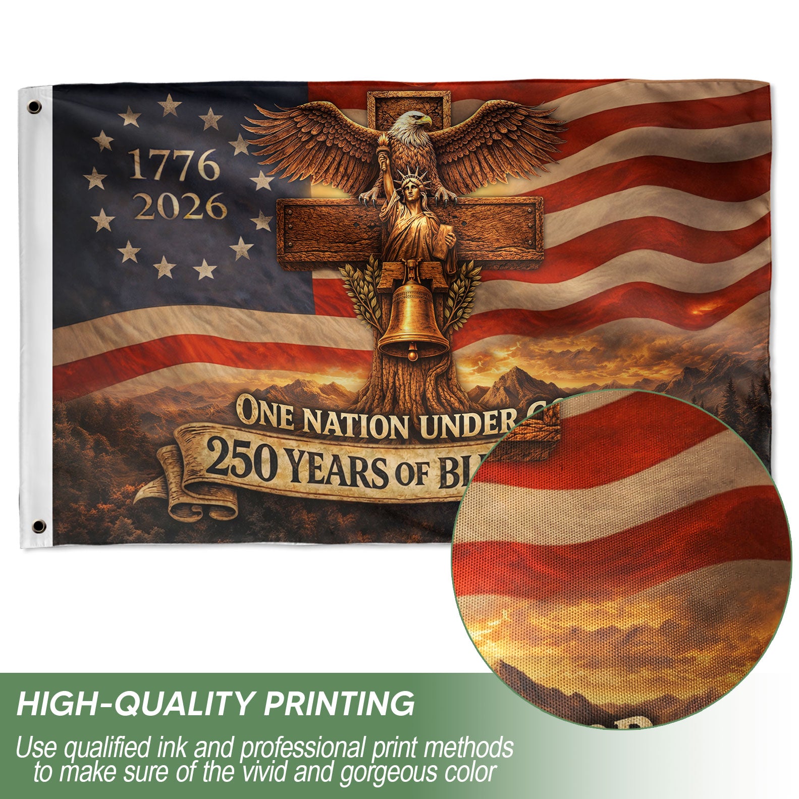 Celebrate 250 years of American heritage with this striking Christian Cross Eagle House Flag. The design centers on a rugged wooden cross intertwined with iconic symbols: the majestic Bald Eagle, the historic Liberty Bell, and the Statue of Liberty. Featuring the bold text ‘1776-2026 One Nation Under God 250 Years of Blessings,’ this flag honors the nation’s providential journey and enduring faith. Perfect for displaying outside your home, garden, or porch during patriotic holidays like the 4th of July, Independence Day, or the upcoming 250th anniversary. Crafted from durable, weather-resistant polyester fabric, it measures standard house flag size for easy attachment to flag poles or brackets. Fade-resistant colors ensure long-lasting vibrancy. Ideal for patriots, Christians, and history enthusiasts seeking a meaningful way to express national pride and spiritual gratitude.