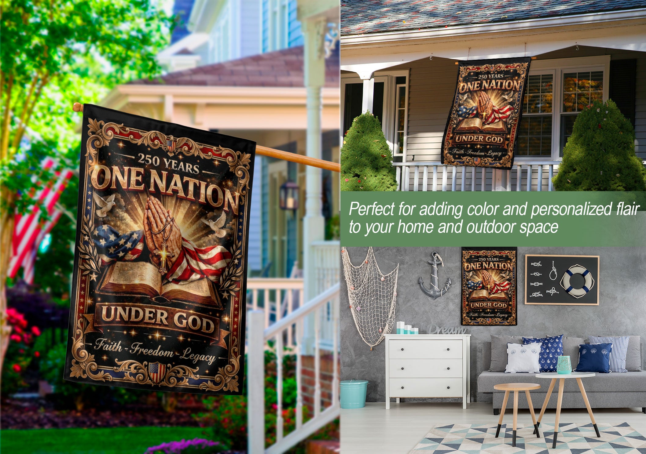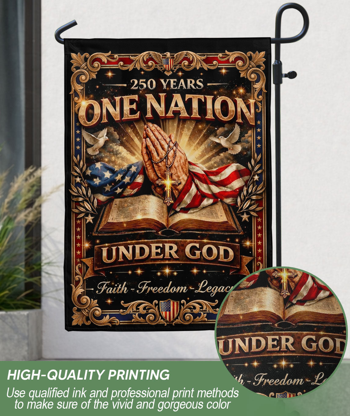 Elevate your outdoor space with this inspiring Christian garden flag commemorating the 250th anniversary of American independence from 1776 to 2026. Featuring a powerful ‘One Nation Under God’ message, an open Bible, prayer elements, and patriotic motifs, this flag beautifully blends faith and freedom. Crafted for durability to withstand outdoor conditions, it’s perfect for gardens, porches, yards, or patios. Show your pride in American heritage, Christian values, unity, and liberty. Double-sided printing ensures visibility from all angles, making it an uplifting addition to homes that honor both country and belief. Easy to hang with a standard garden flag bracket (sold separately). Ideal for patriots, churches, veterans, and families celebrating Semiquincentennial.
