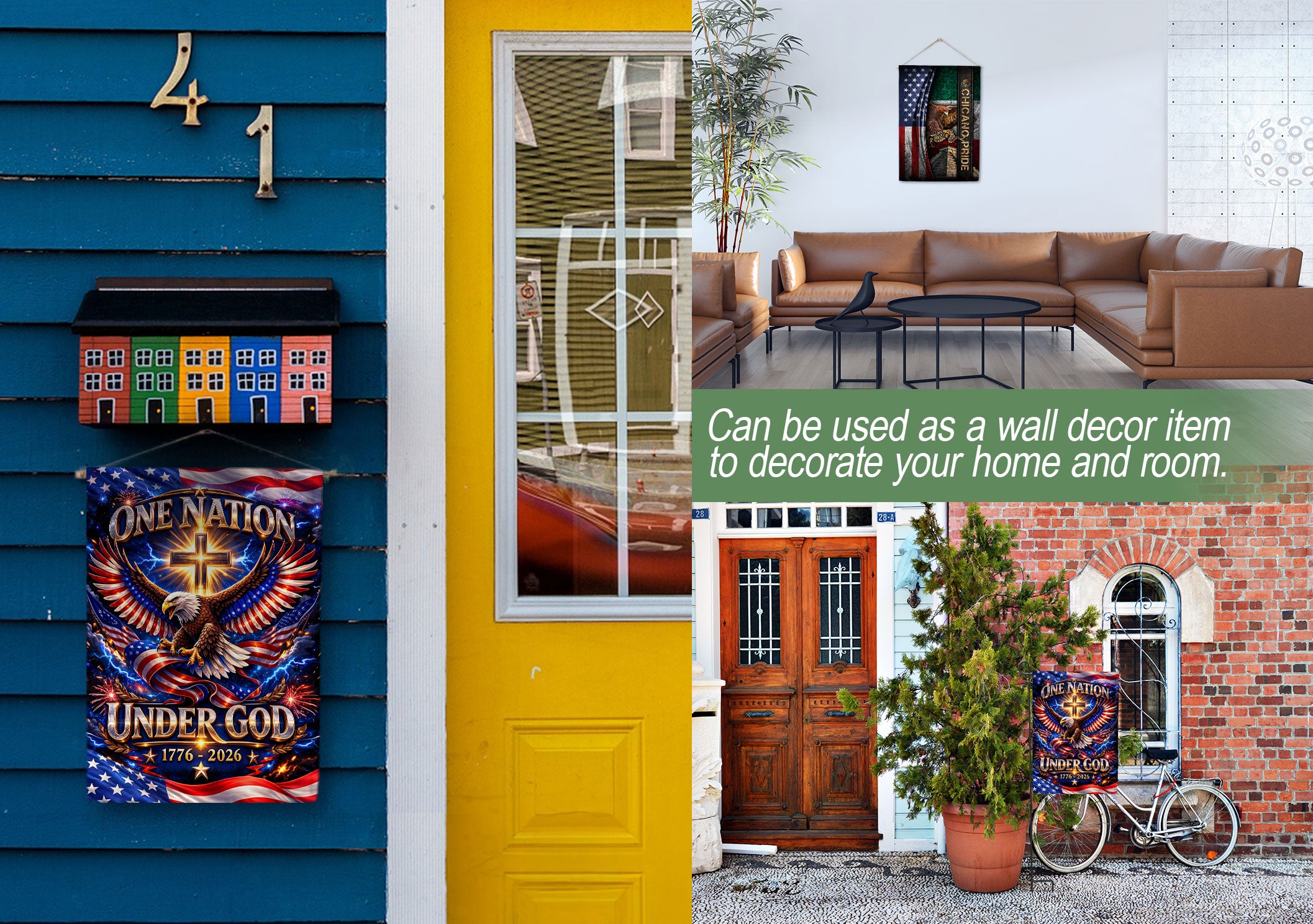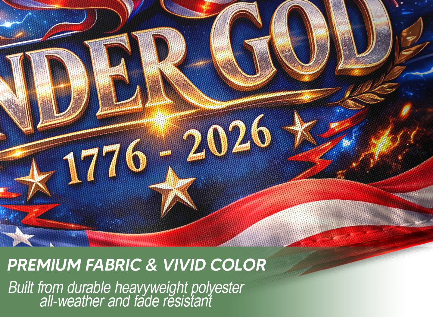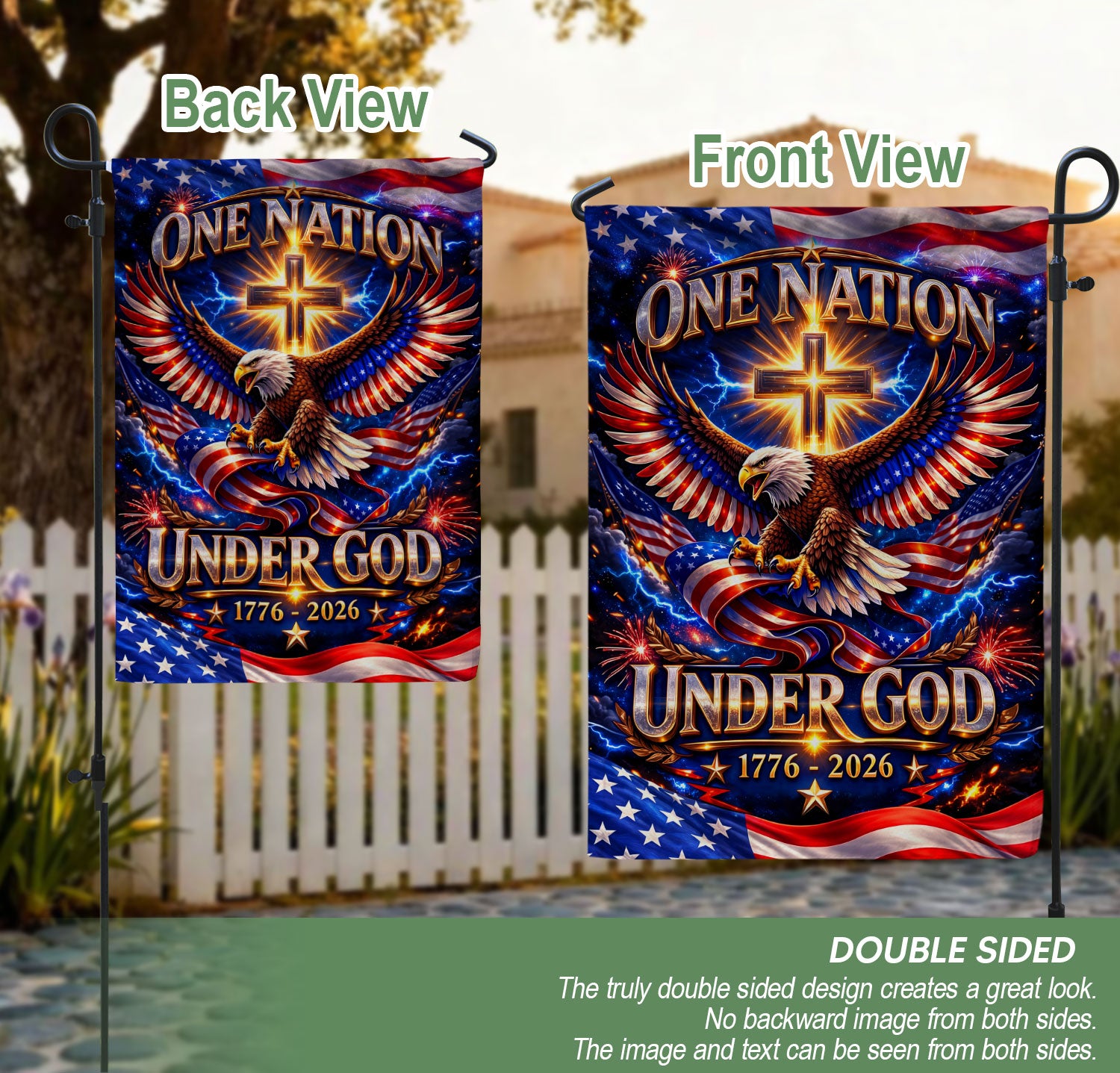Celebrate America’s 250th anniversary with this striking Christian house flag. Featuring a majestic eagle and radiant cross, it proudly displays the ‘One Nation Under God’ message alongside the historic timeline from 1776 to 2026. Crafted for durability and vibrant outdoor display, this patriotic faith banner is perfect for porches, patios, or gardens. Made from high-quality polyester fabric that withstands weather elements, ensuring long-lasting color and clarity. Ideal for patriots, Christians, and history enthusiasts wanting to honor American independence and faith. Easy to hang with a standard flagpole sleeve, measuring standard house flag size for optimal visibility. Show your pride in the USA’s semiquincentennial milestone with this meaningful, double-sided design.