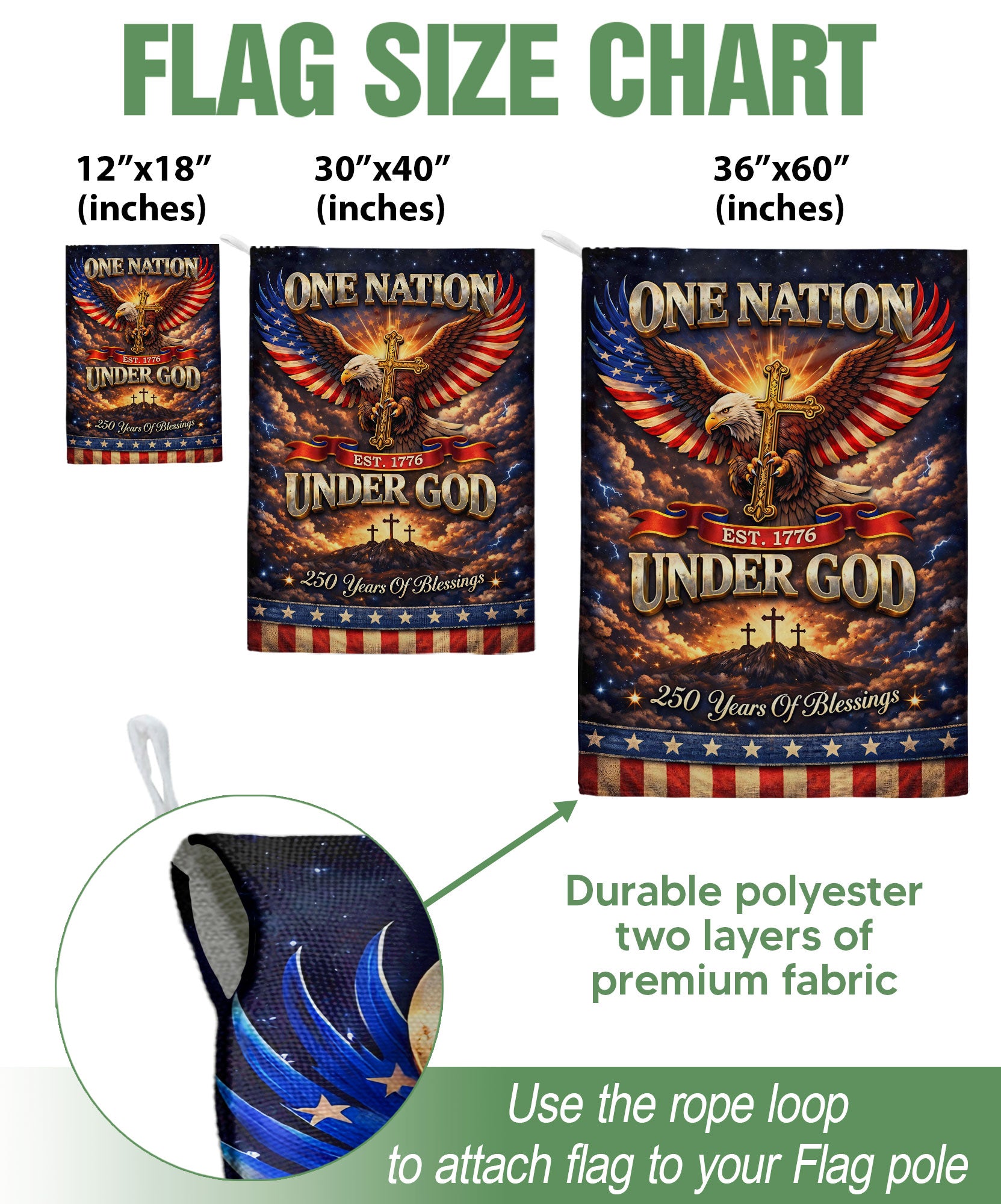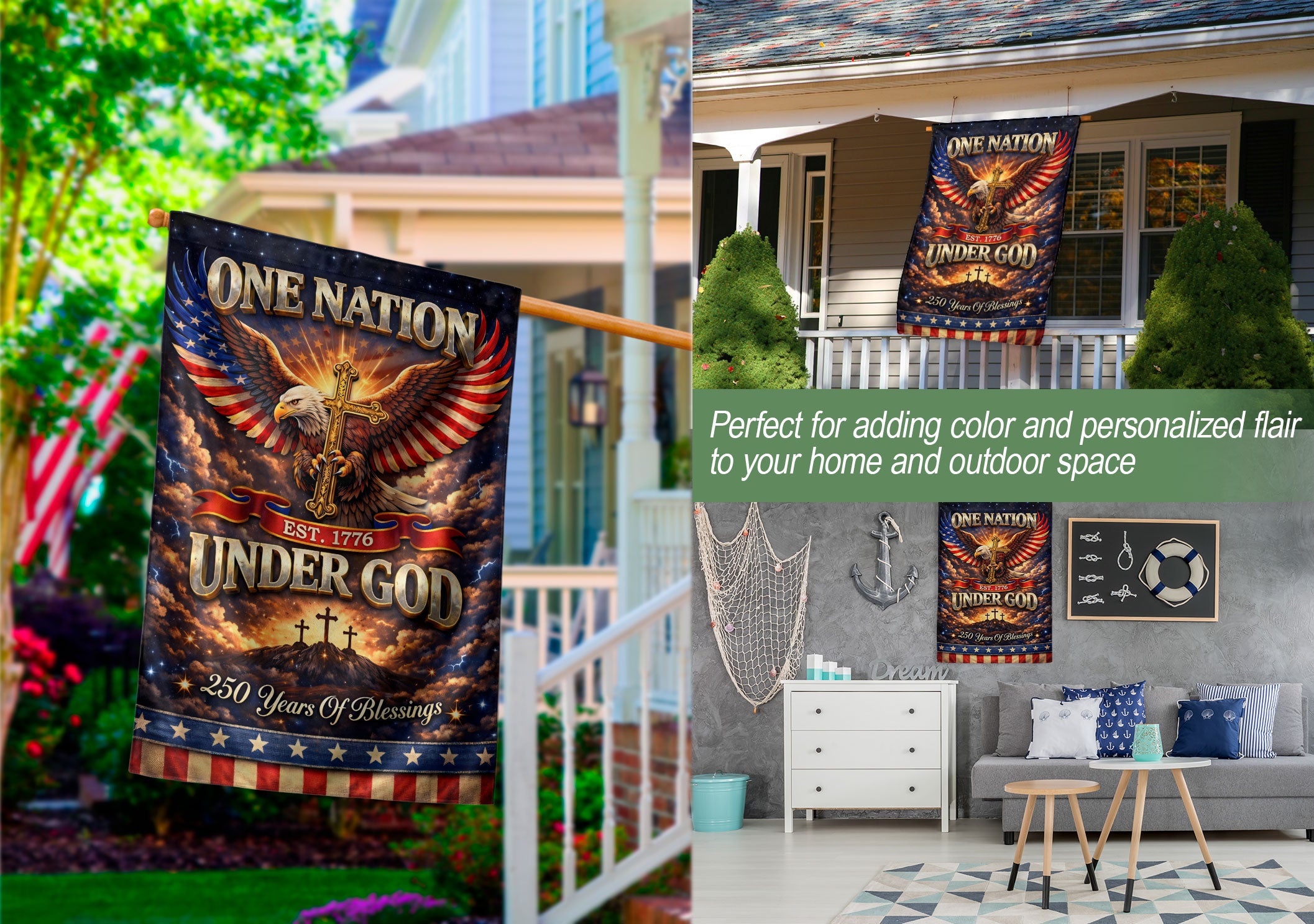 Celebrate America’s 250th anniversary with this striking Christian house flag featuring ‘One Nation Under God Est 1776’ and a bold eagle cross design. Crafted for durable outdoor display, this patriotic faith banner proudly showcases enduring American spirit and Christian values. Perfect for porches, yards, or gardens, it measures standard house flag size with vibrant colors that withstand weather. Ideal for patriots honoring the nation’s founding in 1776, blending eagle symbolism, cross faith elements, and USA pride. Hang it high to display your commitment to liberty, faith, and heritage during this historic milestone.