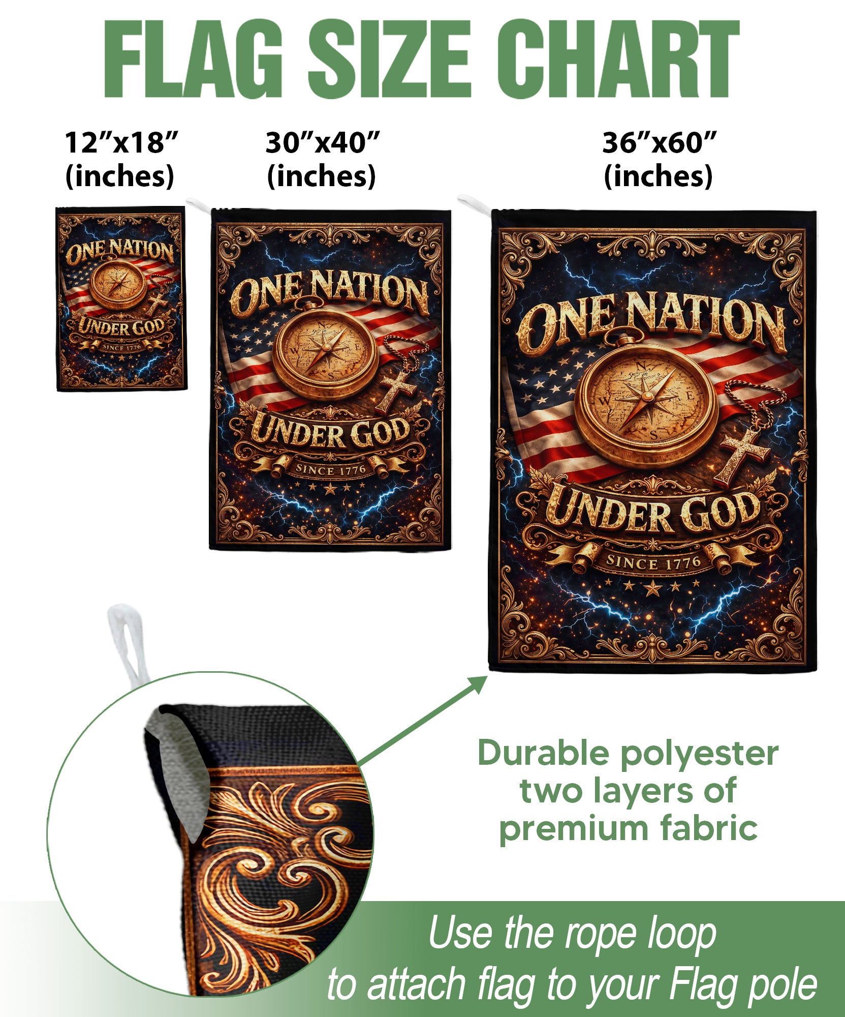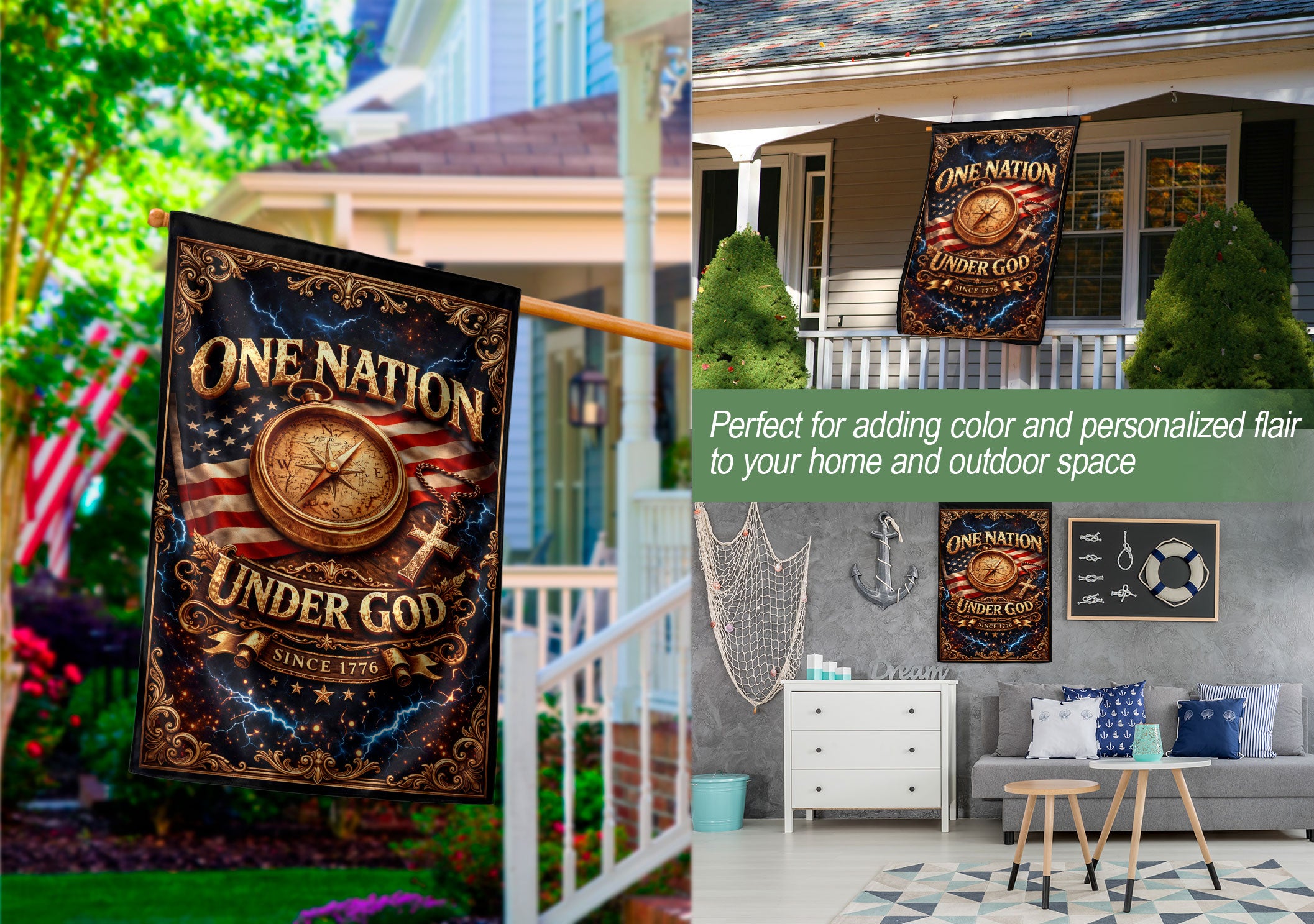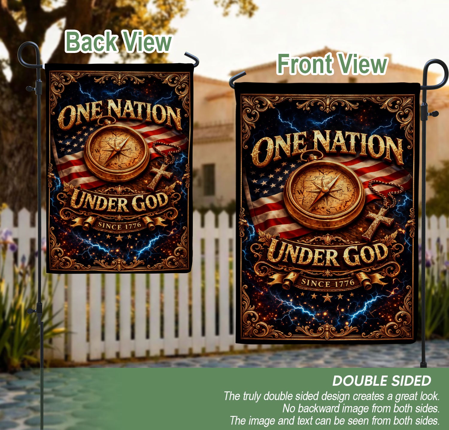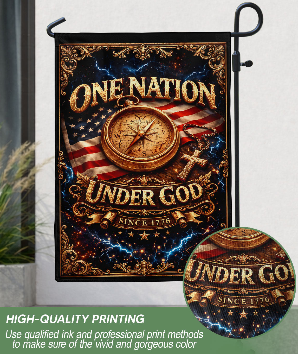 Celebrate America’s 250th anniversary with this patriotic Christian house flag featuring a vintage compass and cross design. The bold ‘One Nation Under God Since 1776’ message honors the nation’s founding principles of faith and freedom. Crafted for outdoor display, this durable house flag withstands weather while showcasing your pride in American heritage. Ideal for porches, gardens, or flagpoles during Independence Day, Memorial Day, or everyday patriotism. The compass symbolizes divine guidance, paired with the cross for a meaningful faith-inspired tribute to 250 years of USA legacy.