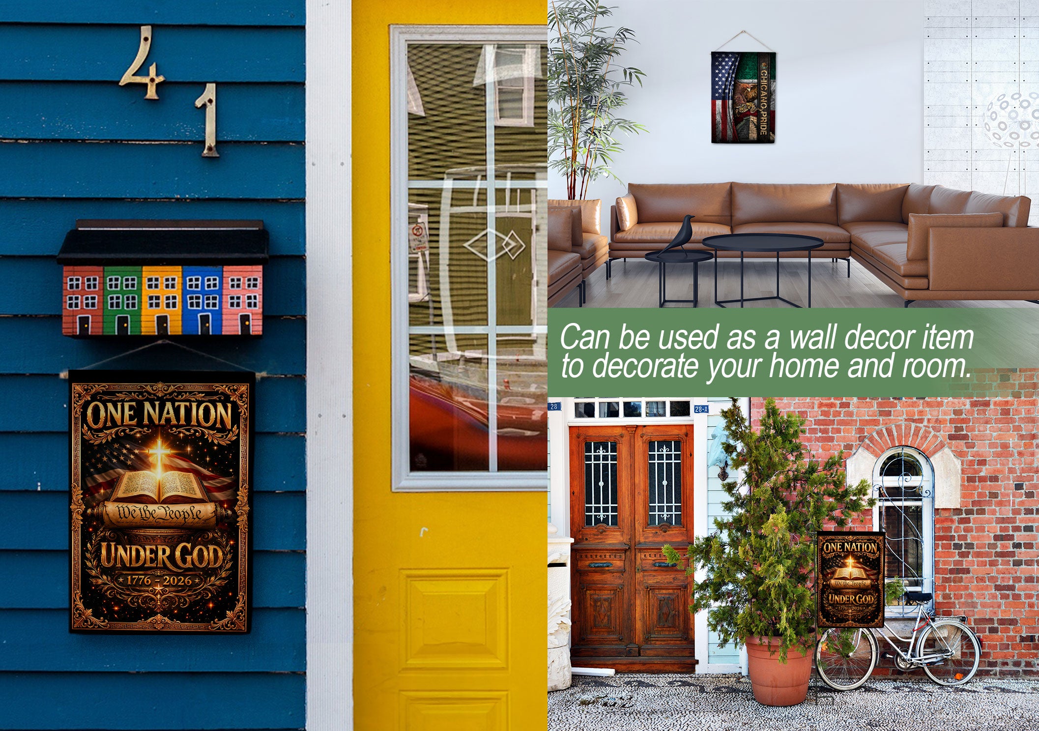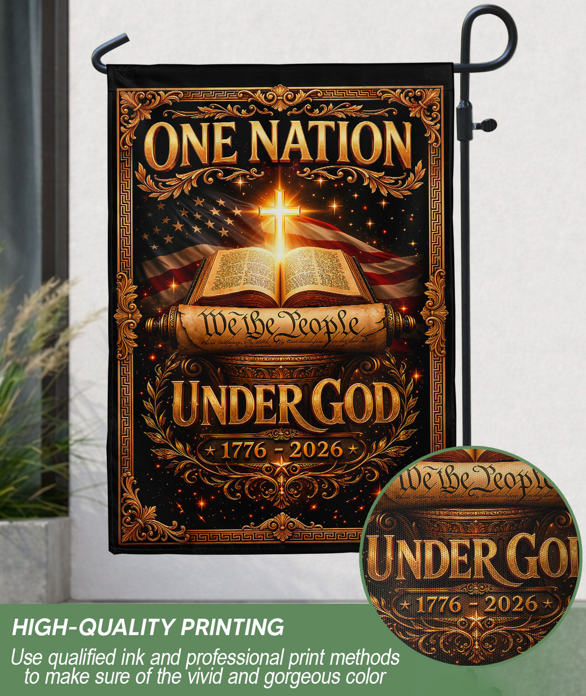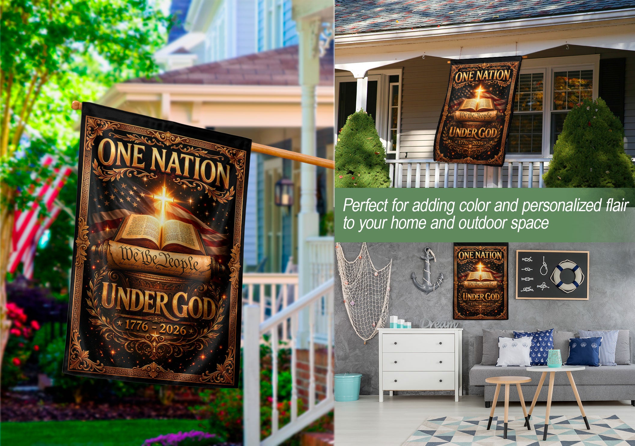 Celebrate America’s 250th anniversary with this striking Christian house flag featuring a Bible and cross design. The bold ‘One Nation Under God We The People’ message honors faith, freedom, and patriotism from 1776 to 2026. Perfect for displaying outside your home, this durable patriotic banner showcases national pride and religious devotion. Crafted for outdoor use, it withstands weather while proudly waving your American heritage. Ideal for holidays, Independence Day, or everyday display to inspire neighbors and passersby with its timeless message of unity under God.