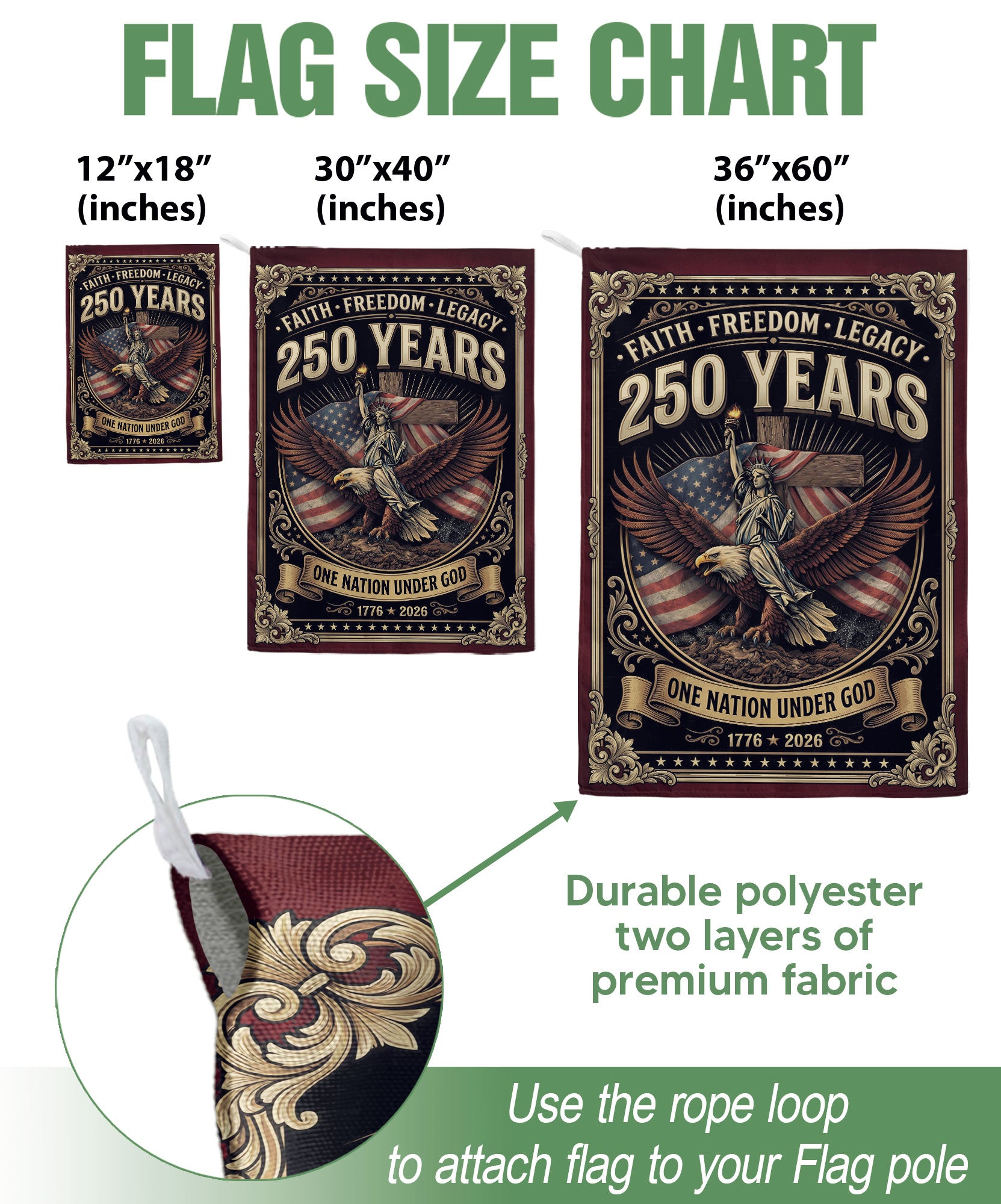 Celebrate American heritage and Christian faith with this double-sided patriotic garden flag. The bold design features ‘One Nation Under God,’ a majestic eagle, patriotic cross, ‘We The People,’ and ‘Faith and Freedom’ to honor 250 years of USA independence, unity, and liberty. Crafted for durability, this garden flag withstands outdoor conditions and displays proudly from both sides. Ideal for gardens, porches, patios, or yards, it’s perfect for patriots, Christians, and history lovers. Use it year-round or during holidays like Independence Day, Memorial Day, and the 250th anniversary celebrations to showcase national pride and spiritual values.