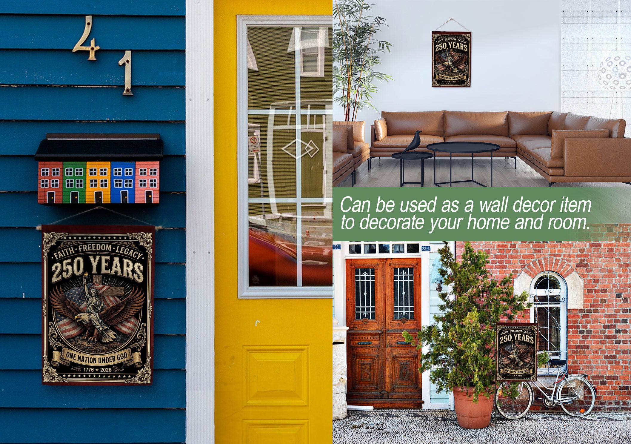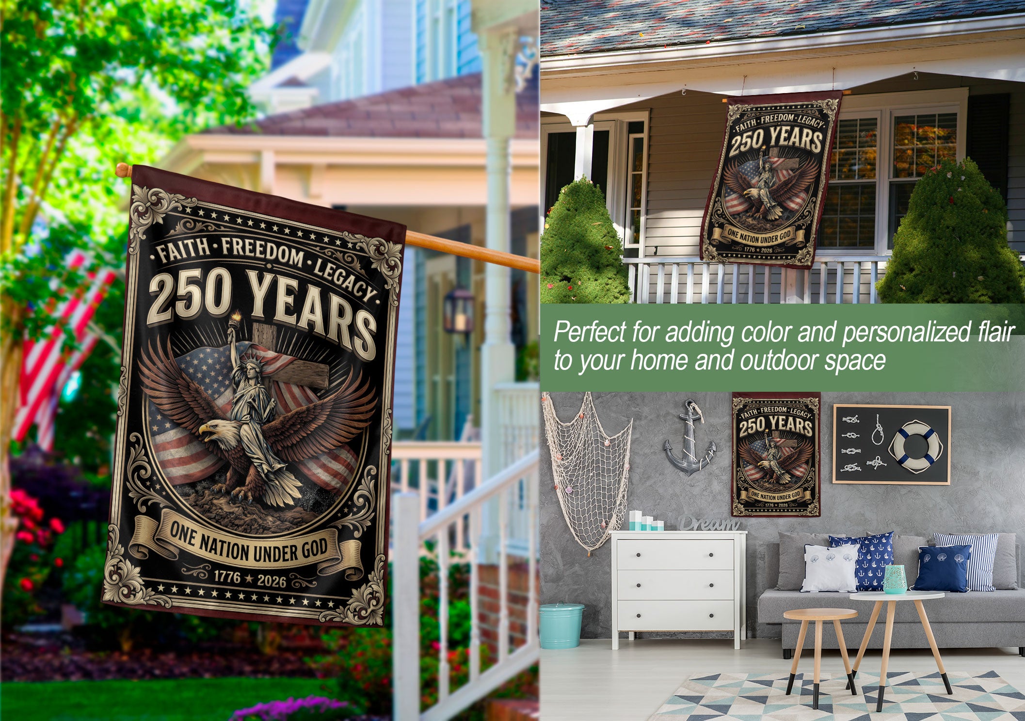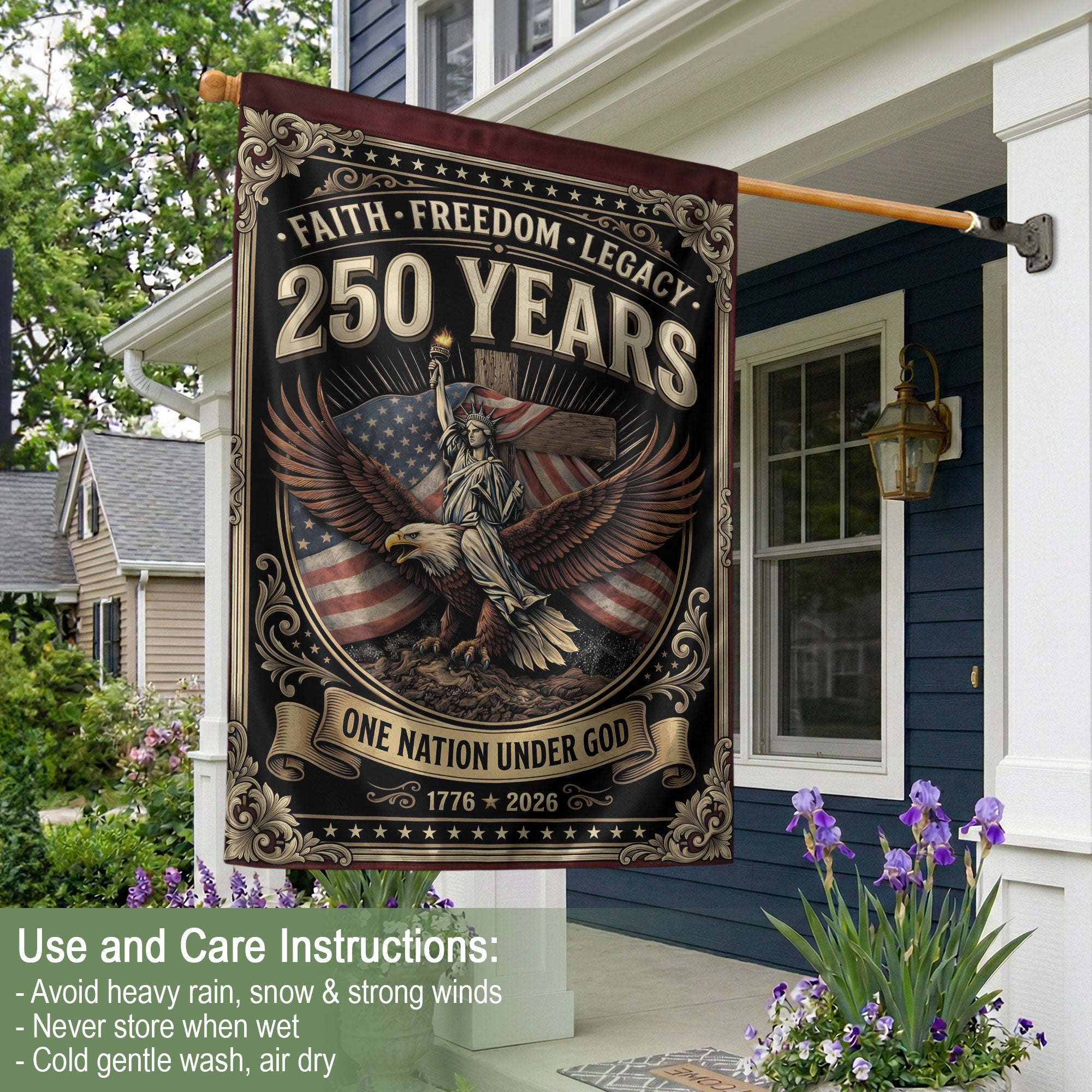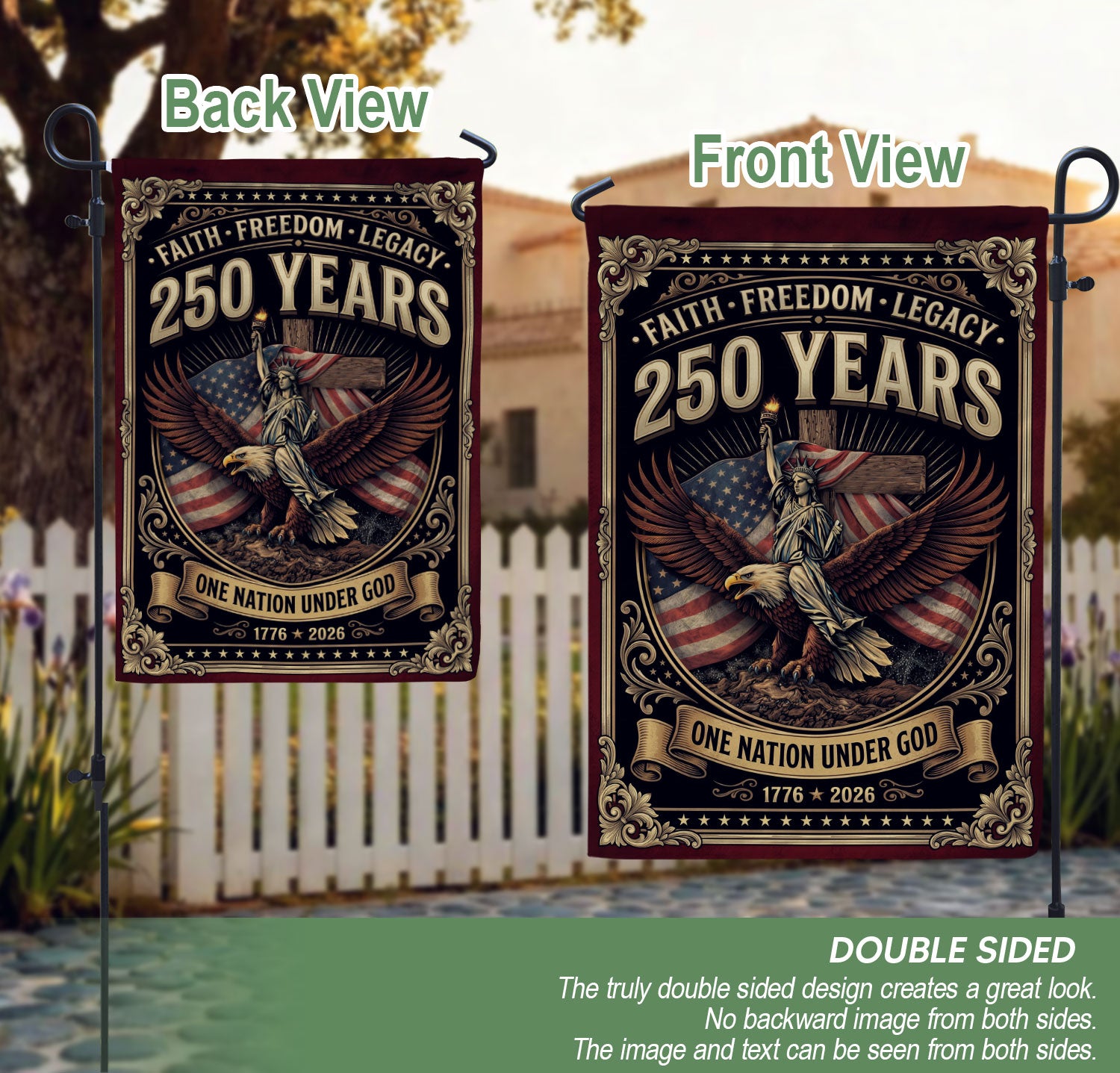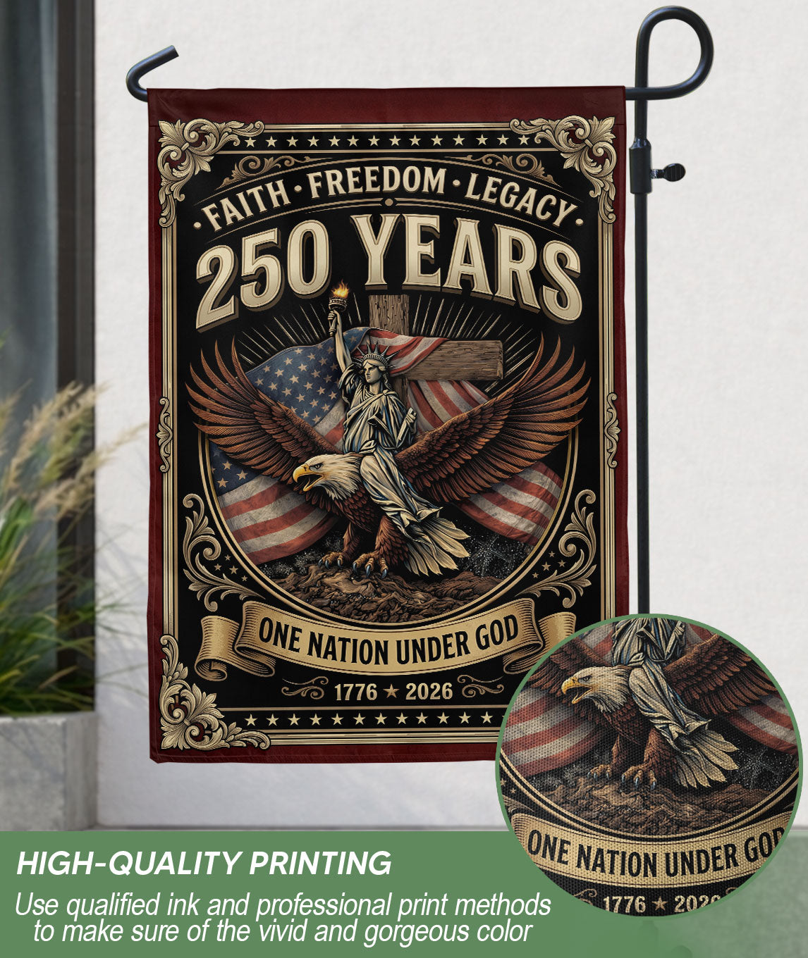 Display your Christian faith and American patriotism with this double-sided house flag featuring ‘One Nation Under God,’ a majestic eagle, patriotic cross, ‘We The People,’ and ‘Faith and Freedom.’ Celebrating 250 years of USA heritage, unity, and national pride, this durable flag is perfect for porches, gardens, or homes. Crafted for outdoor use, it withstands weather while proudly showcasing religious and patriotic values. Ideal for Independence Day, Memorial Day, or everyday display of freedom and belief.