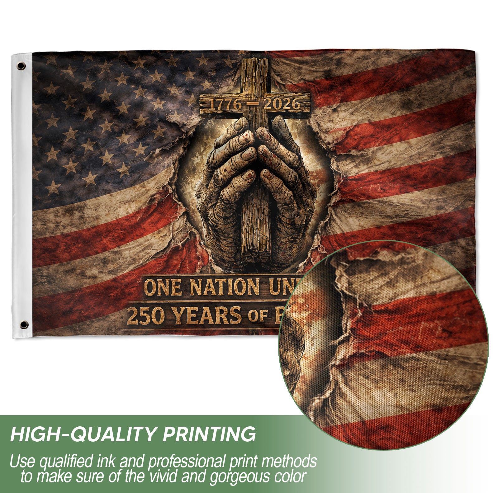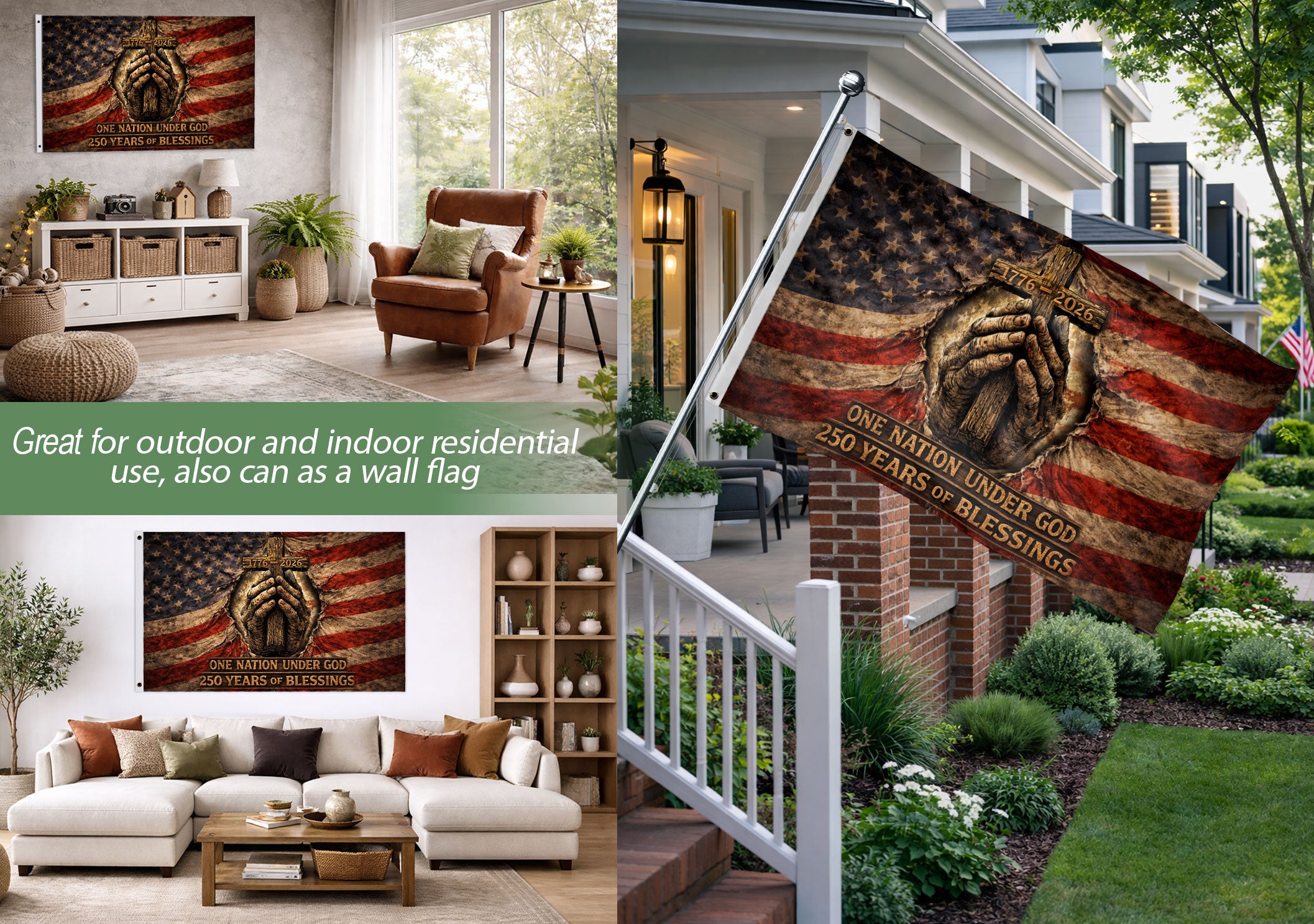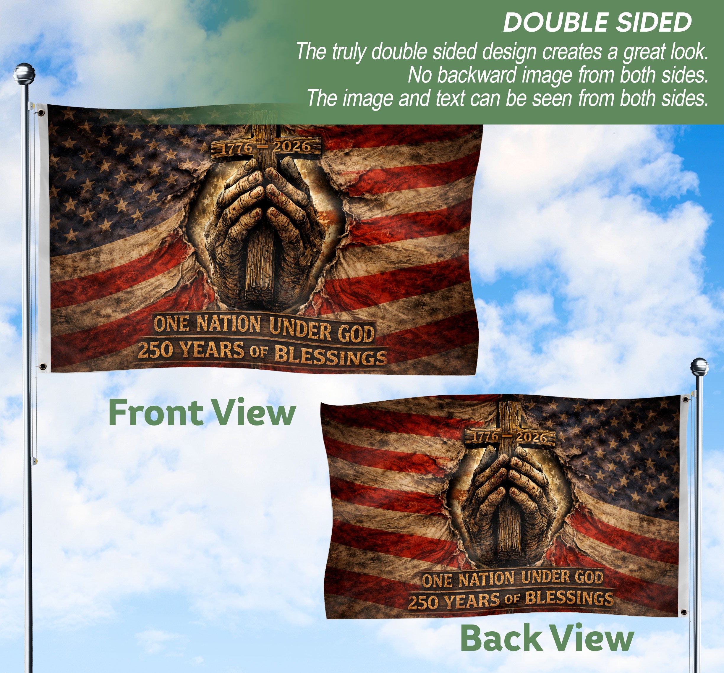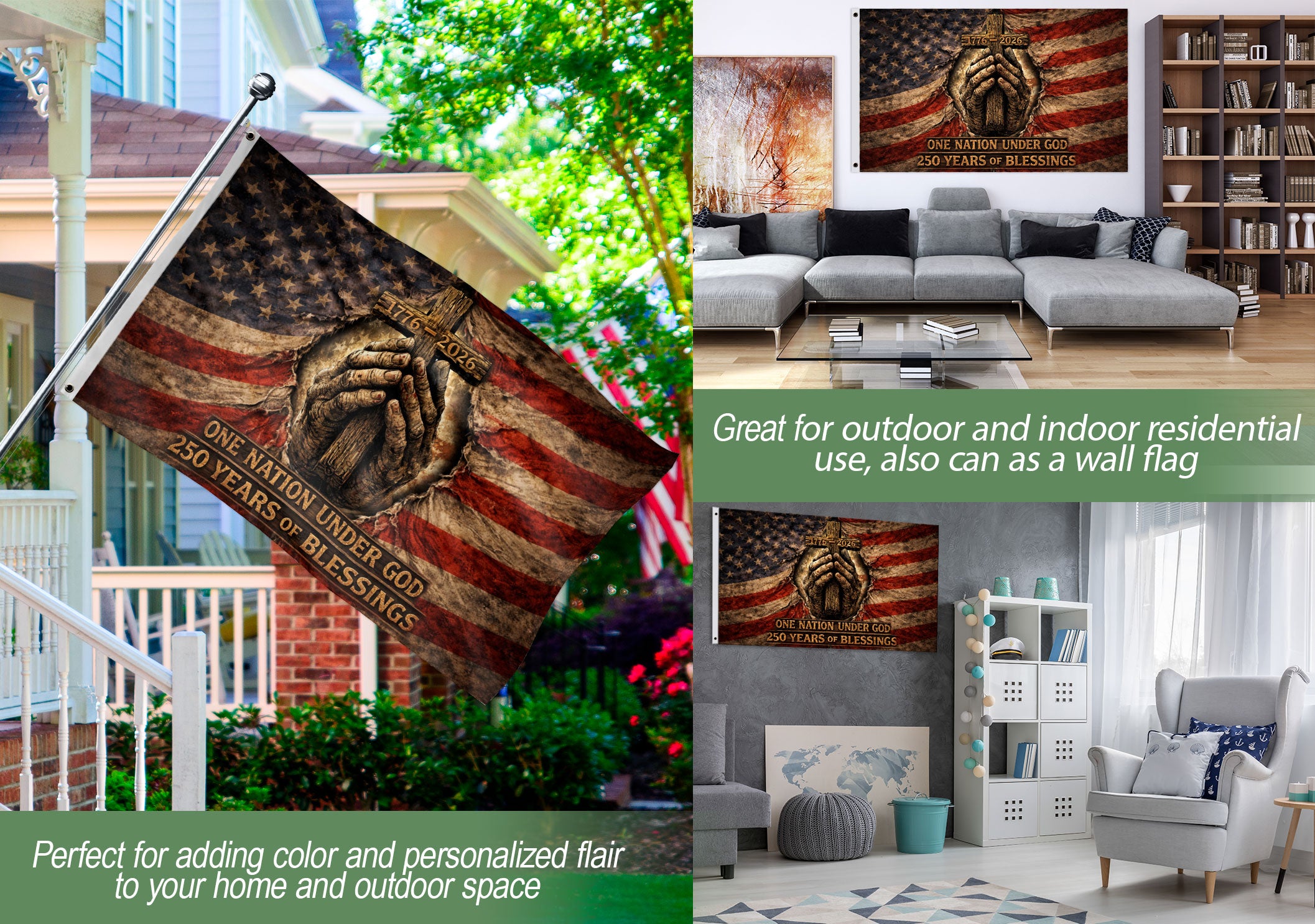 Celebrate faith and patriotism with this Christian patriotic house flag. The design features powerful praying hands holding a cross set against a distressed American flag background. The inspiring message ‘One Nation Under God’ is prominently displayed, along with the dates 1776-2026, honoring America’s heritage. This meaningful flag symbolizes faith, hope, and national pride. Perfect for displaying on your porch, house flag pole, or garden. Crafted from durable polyester fabric for outdoor use, it withstands weather elements while maintaining vibrant colors. Double-sided printing ensures the design is visible from both sides. Easy to hang with a standard house flag pole (pole not included). Ideal for patriots, Christians, and those commemorating the 250th anniversary of American independence. Add a touch of spiritual patriotism to your home decor.