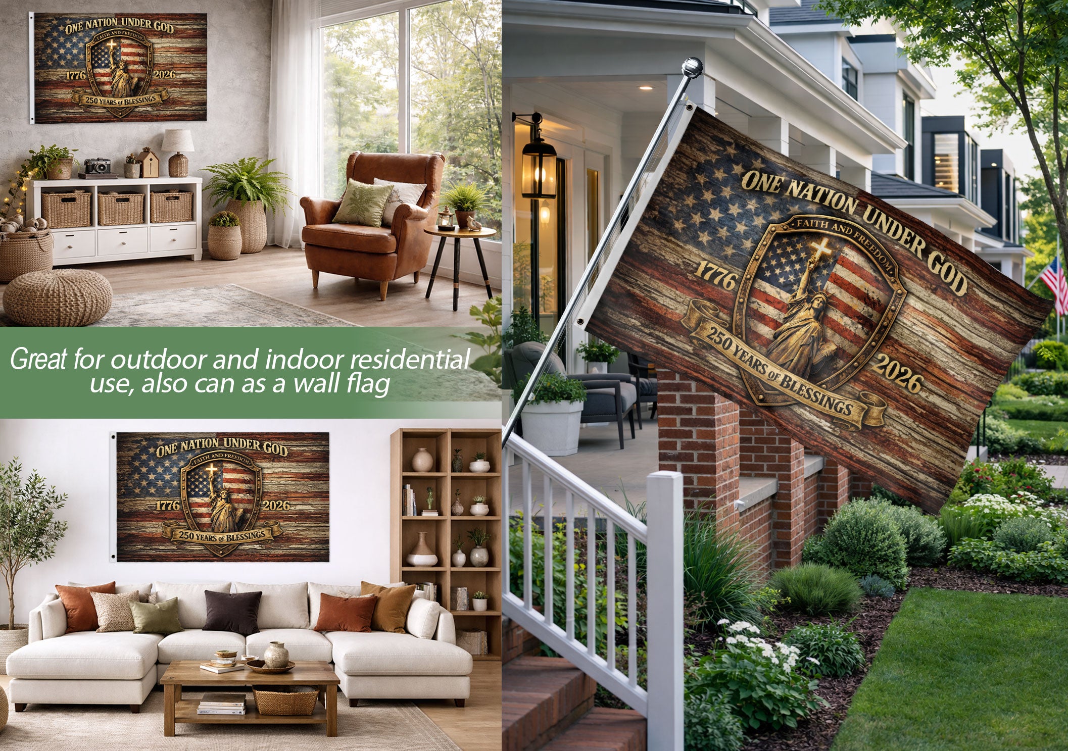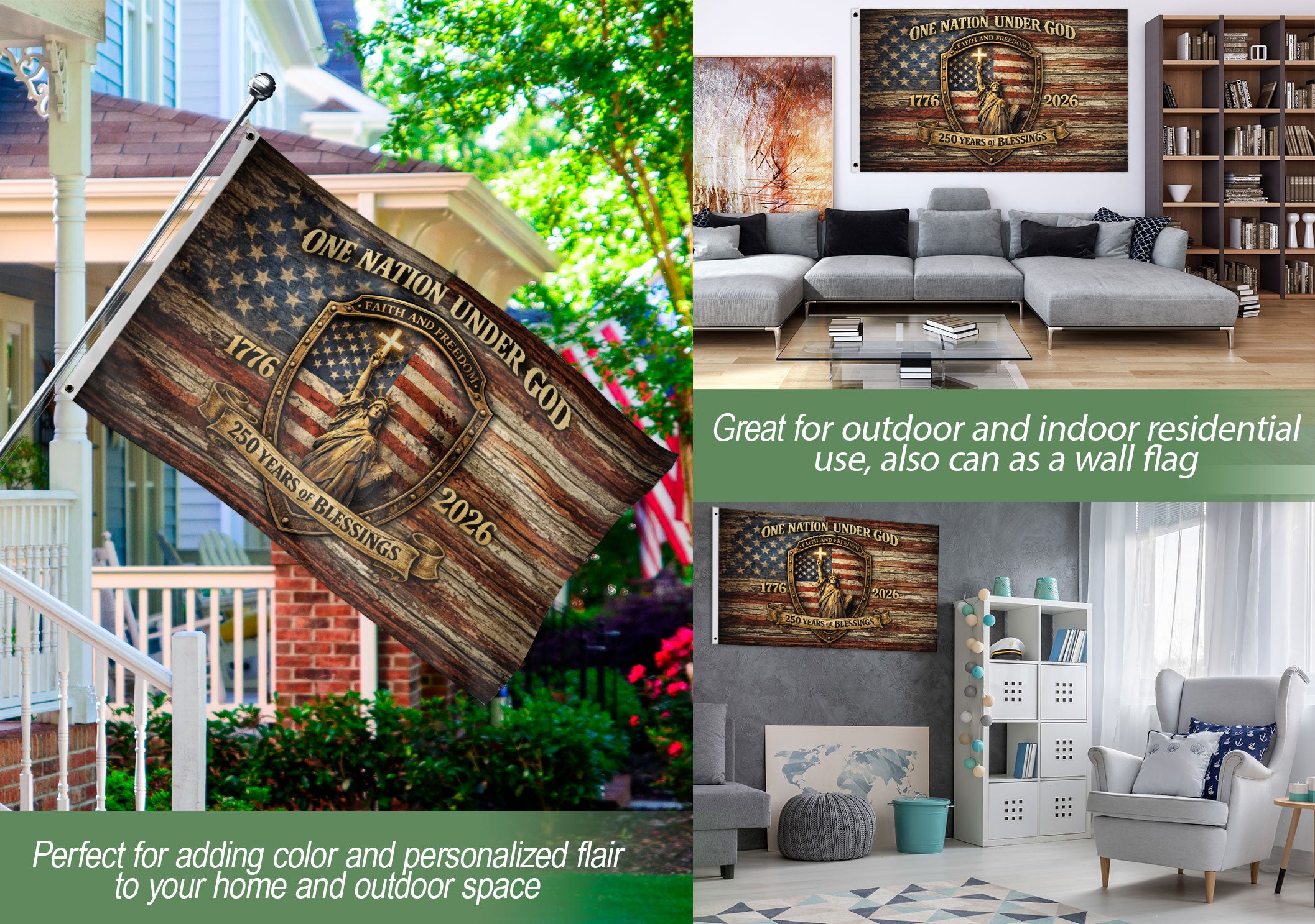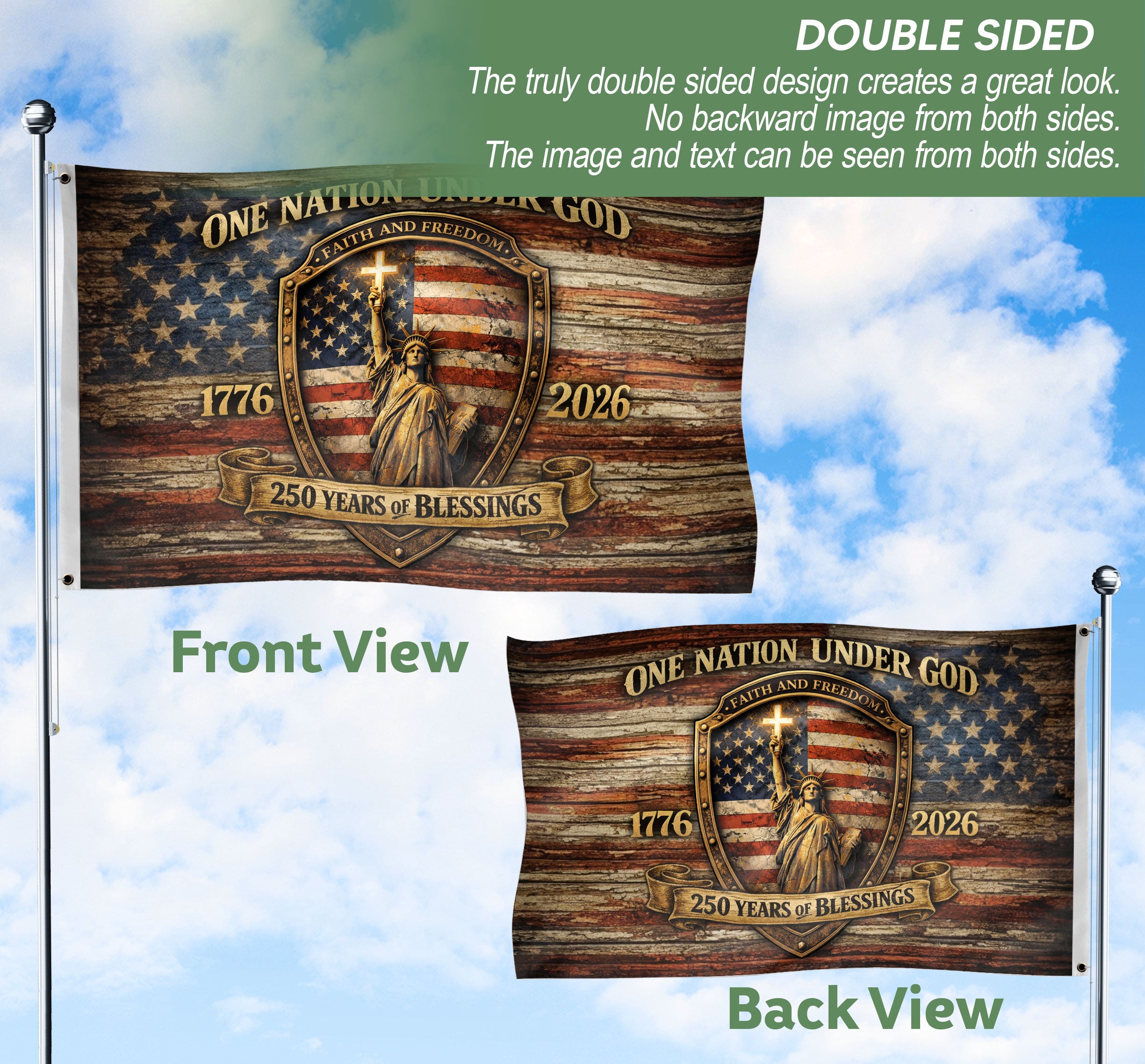 Celebrate America’s 250th anniversary with this Christian Statue of Liberty house flag featuring the iconic ‘One Nation Under God’ message. This patriotic flag blends faith, freedom, and American history, with the Statue of Liberty symbolizing hope and liberty. Crafted from high-quality polyester fabric, it withstands wind, rain, and sun for durable outdoor display. Double-stitched edges and reinforced grommets ensure longevity and easy hanging on porches, flagpoles, or gardens. Perfect for homes, churches, patriotic events, Independence Day, Memorial Day, or year-round display to honor Christian values and the American spirit. Show your pride in faith and freedom with this weather-resistant house flag designed for everyday use.