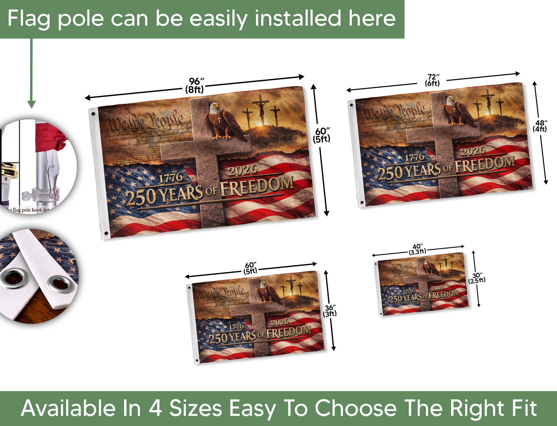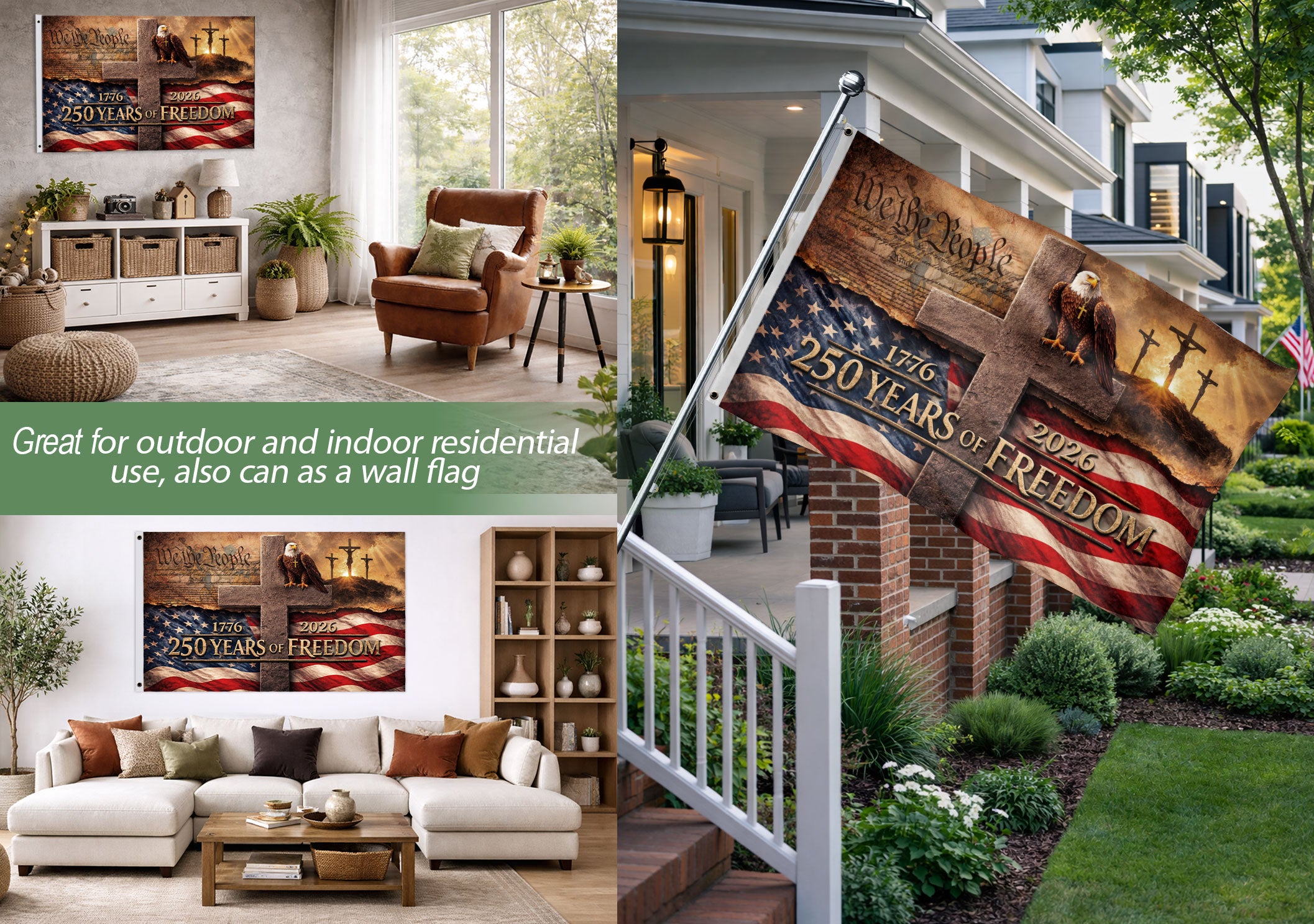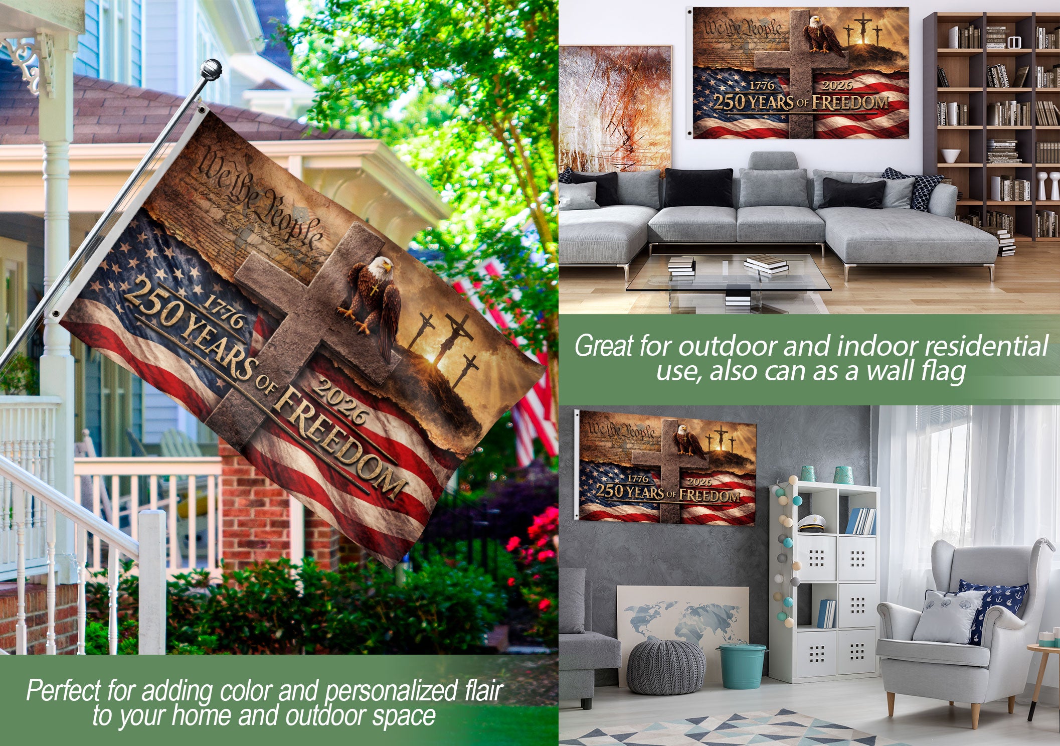 Celebrate America’s 250th anniversary from 1776 to 2026 with this patriotic Christian house flag. Featuring the iconic cross, majestic eagle, and ‘We The People’ theme, this flag honors American heritage and Christian faith. Perfect for displaying on your front porch, yard, or home to inspire pride and freedom. Durable design withstands outdoor conditions, making it ideal for patriotic holidays, Independence Day, or everyday display of national spirit.