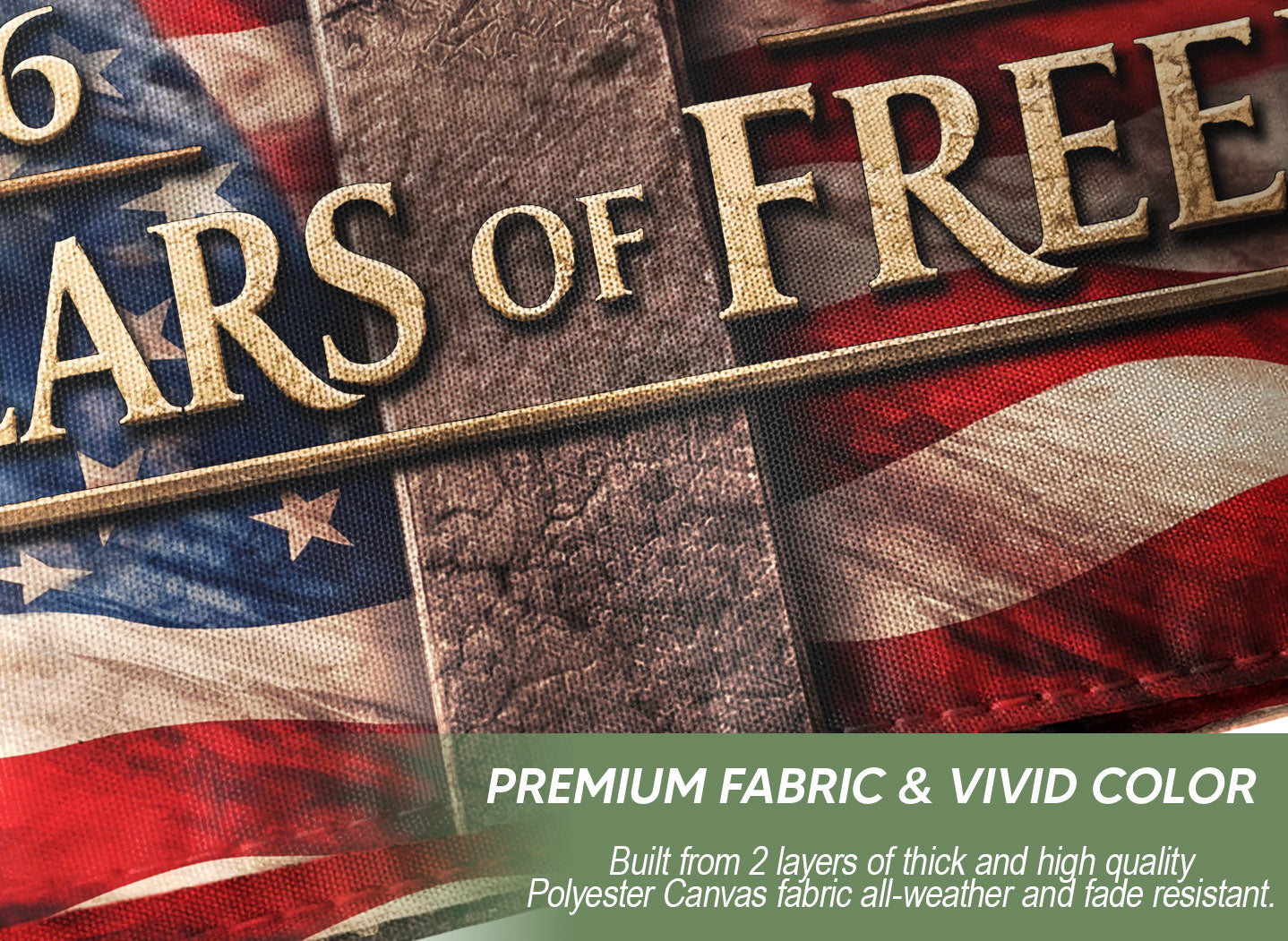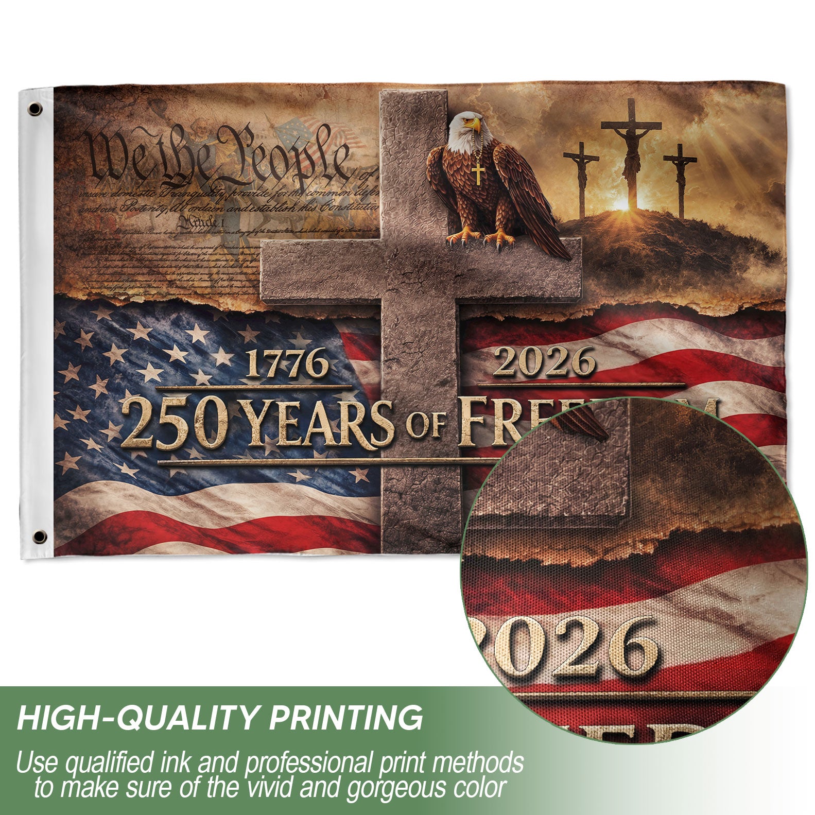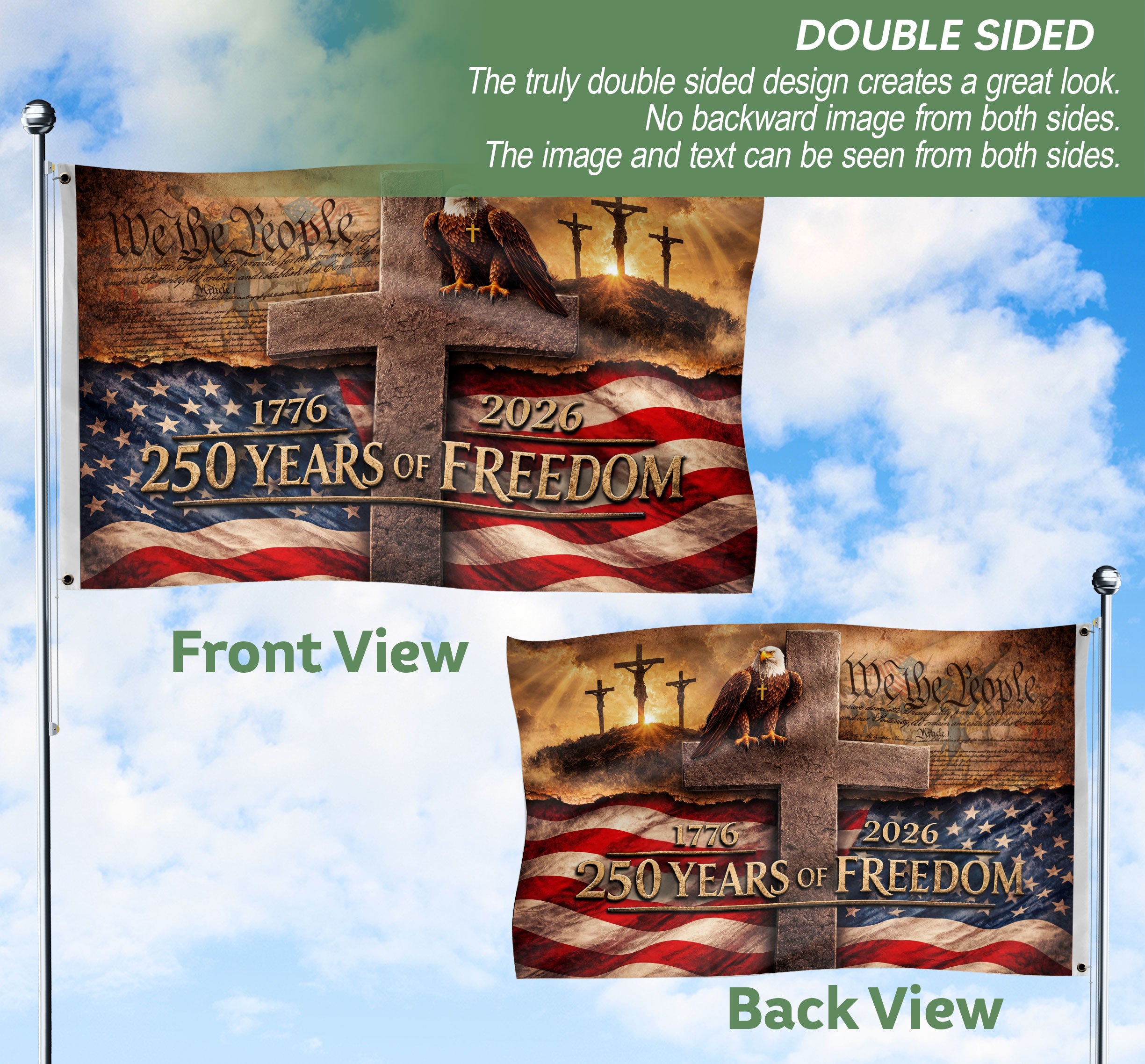 Celebrate America’s 250th anniversary from 1776 to 2026 with this patriotic Christian house flag. Featuring the iconic cross, majestic eagle, and ‘We The People’ theme, this flag honors American heritage and Christian faith. Perfect for displaying on your front porch, yard, or home to inspire pride and freedom. Durable design withstands outdoor conditions, making it ideal for patriotic holidays, Independence Day, or everyday display of national spirit.