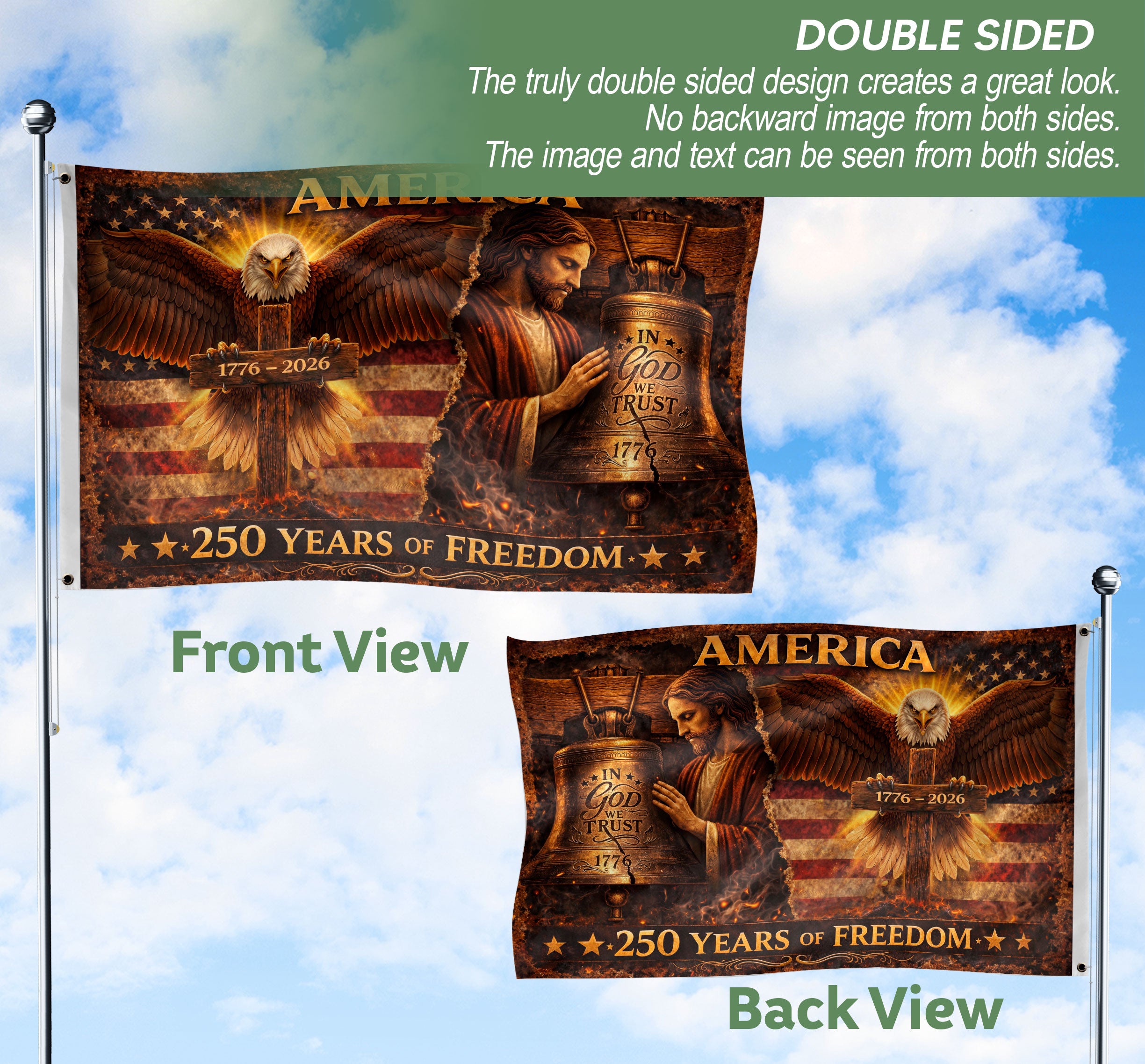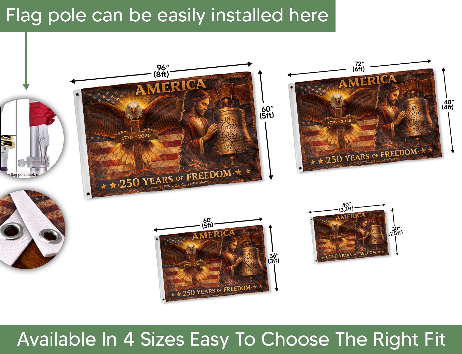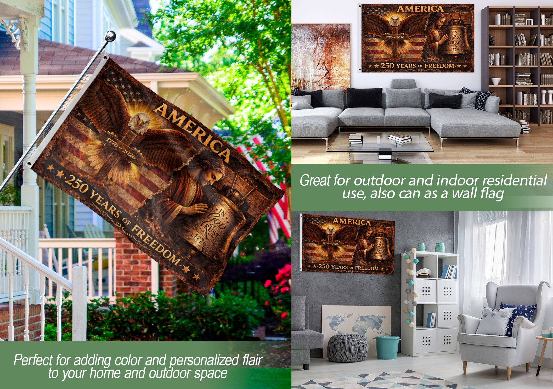 Celebrate America’s 250th anniversary with this Christian patriotic house flag. Featuring the iconic ‘We The People’ design, a majestic eagle, and a prominent cross, it commemorates the period from 1776 to 2026, honoring 250 years of freedom and faith. Crafted for durable outdoor use, this flag is ideal for displaying on your porch, garden, or home during Independence Day, Memorial Day, Fourth of July, or any patriotic occasion. The vibrant double-sided print ensures visibility from both sides, blending national pride with Christian values. Made from high-quality polyester fabric that withstands weather elements, it includes a reinforced header and brass grommets for easy hanging on flag poles or brackets. Perfect for patriots who want to showcase their love for the USA and faith in God.