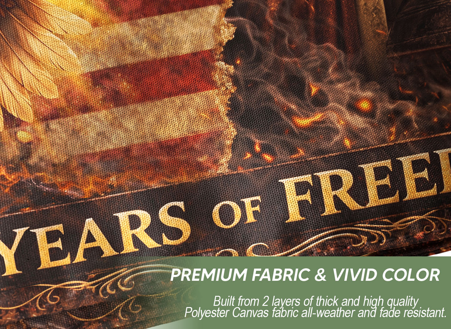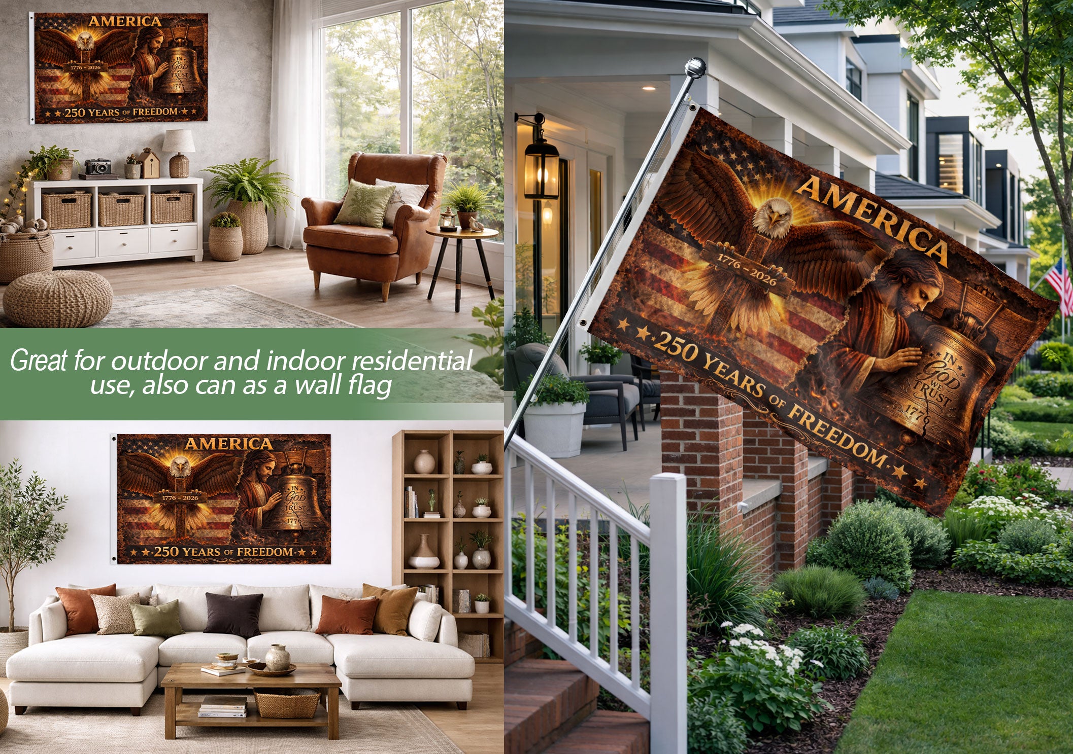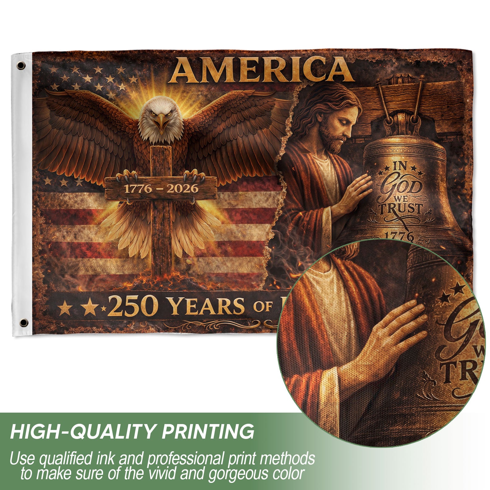 Celebrate America’s 250th anniversary with this Christian patriotic house flag. Featuring the iconic ‘We The People’ design, a majestic eagle, and a prominent cross, it commemorates the period from 1776 to 2026, honoring 250 years of freedom and faith. Crafted for durable outdoor use, this flag is ideal for displaying on your porch, garden, or home during Independence Day, Memorial Day, Fourth of July, or any patriotic occasion. The vibrant double-sided print ensures visibility from both sides, blending national pride with Christian values. Made from high-quality polyester fabric that withstands weather elements, it includes a reinforced header and brass grommets for easy hanging on flag poles or brackets. Perfect for patriots who want to showcase their love for the USA and faith in God.