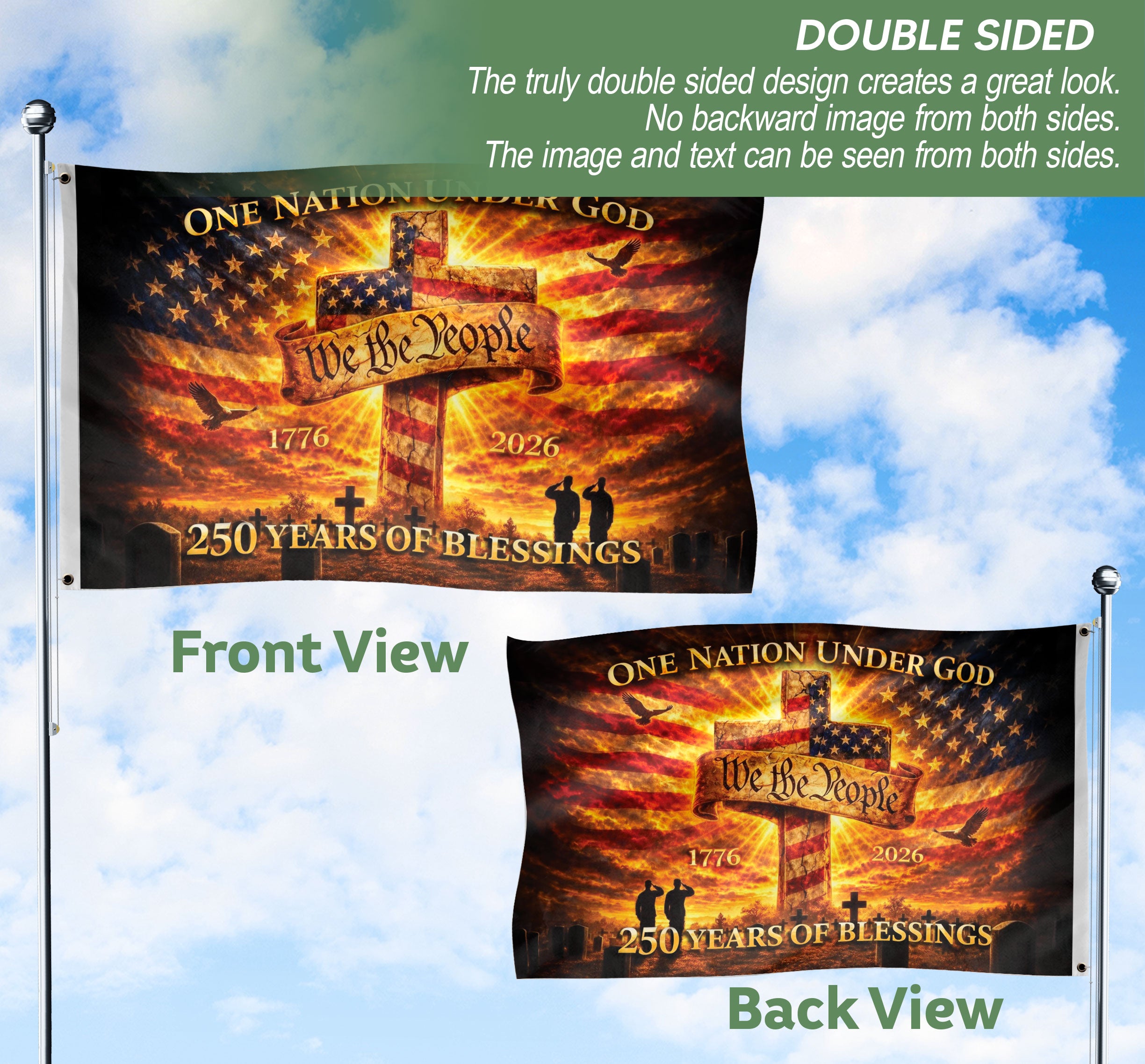 Celebrate America’s 250th anniversary from 1776 to 2026 with this patriotic Christian We The People Cross House Flag. Featuring the iconic ‘We The People’ phrase intertwined with a prominent cross and bold American flag elements, this flag symbolizes faith, freedom, and national unity. Perfect for displaying on your porch, garden, or home exterior, it serves as a powerful reminder of the nation’s founding principles rooted in Christian values and American heritage. Crafted for durability and vibrant outdoor use, this decorative house flag withstands weather while proudly showcasing ‘One Nation Under God.’ Ideal for patriots, history enthusiasts, and faith-driven households seeking to honor the semiquincentennial milestone.