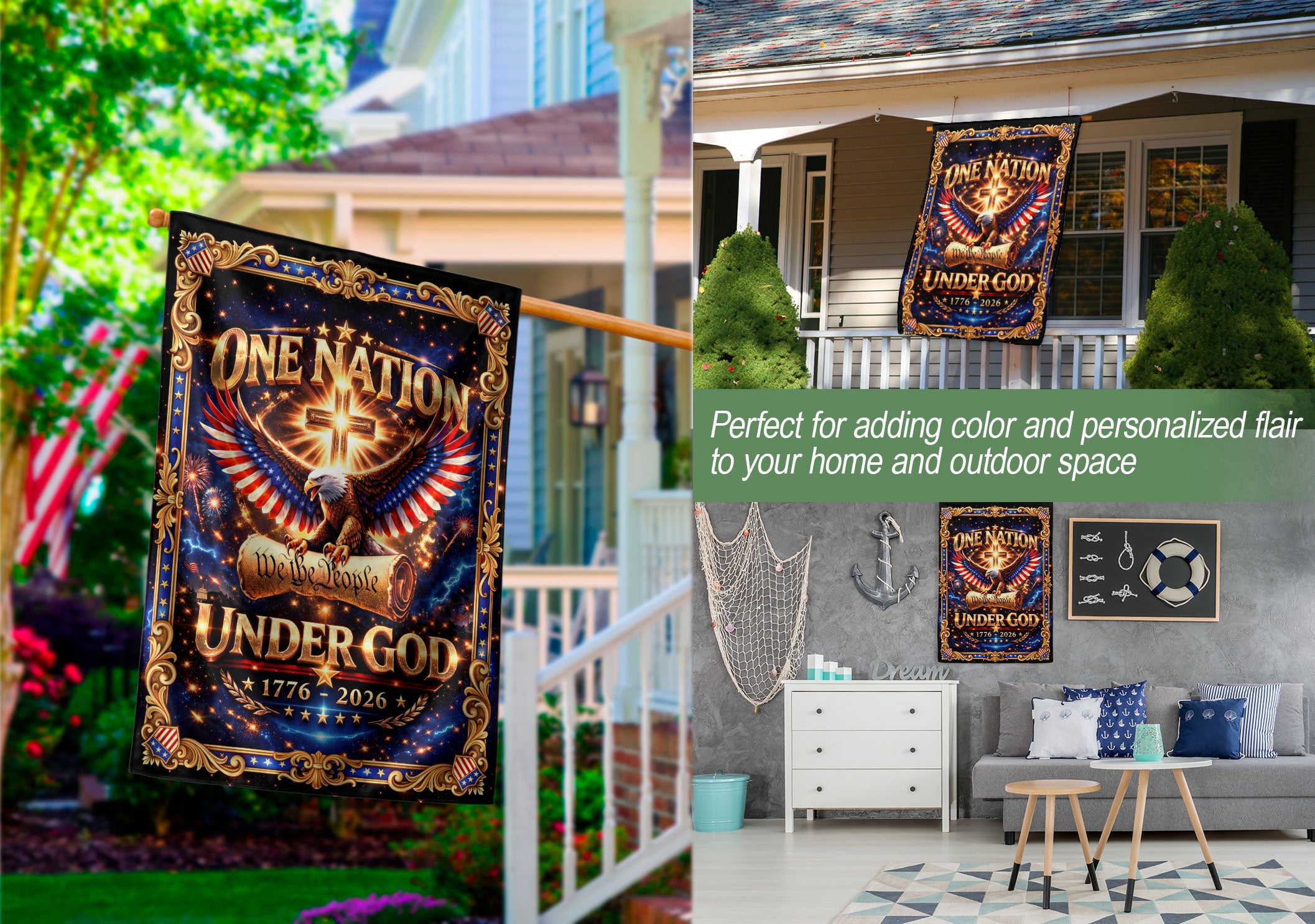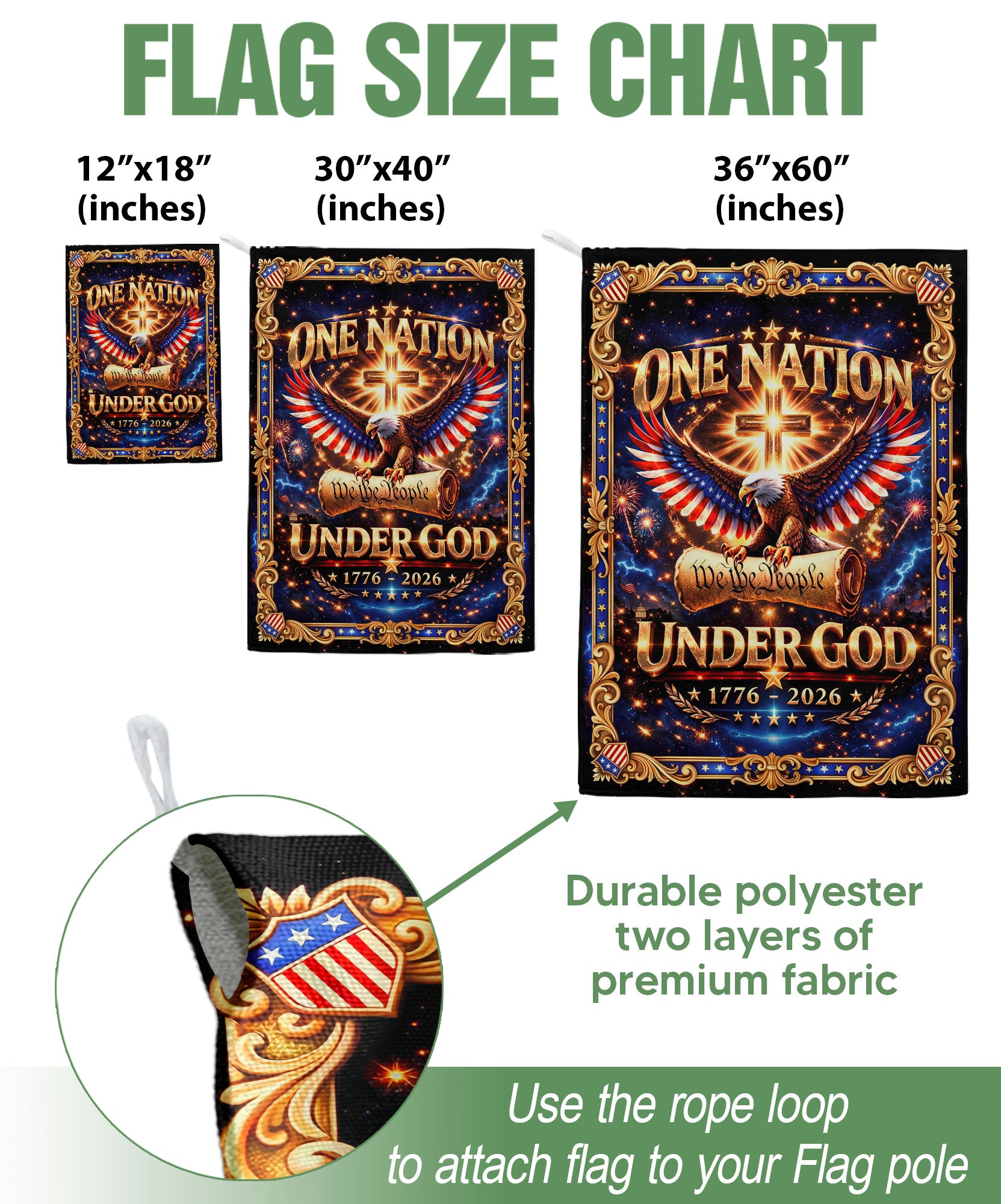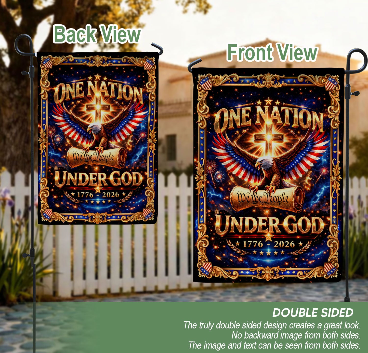 Celebrate America’s 250th anniversary from 1776 to 2026 with this Christian garden flag featuring ‘We The People Under God’ in a bold patriotic design. The flag showcases a majestic eagle, a prominent cross, and vibrant American elements that honor faith, freedom, and national unity. Crafted for durable outdoor use, it’s perfect for displaying in your garden, front yard, porch, or patio to make a powerful statement of devotion to God and country. Double-sided printing ensures visibility from all angles, with weather-resistant fabric that withstands sun, wind, and rain. Ideal for patriots, veterans, churches, and anyone proud of America’s heritage. Easy to hang with a standard garden flag bracket (sold separately). Measures approximately 12.5 x 18 inches for eye-catching display.