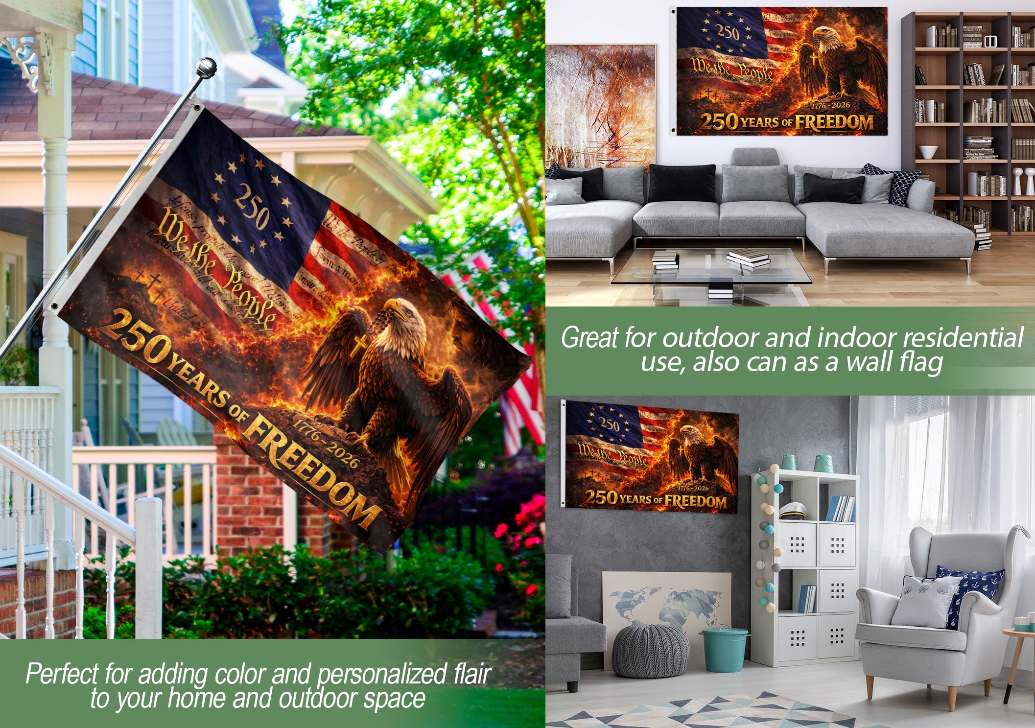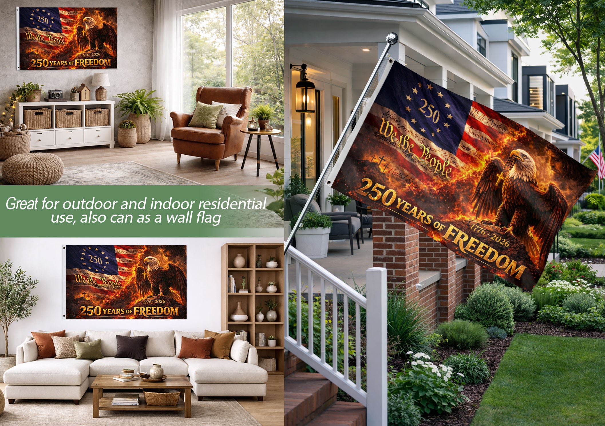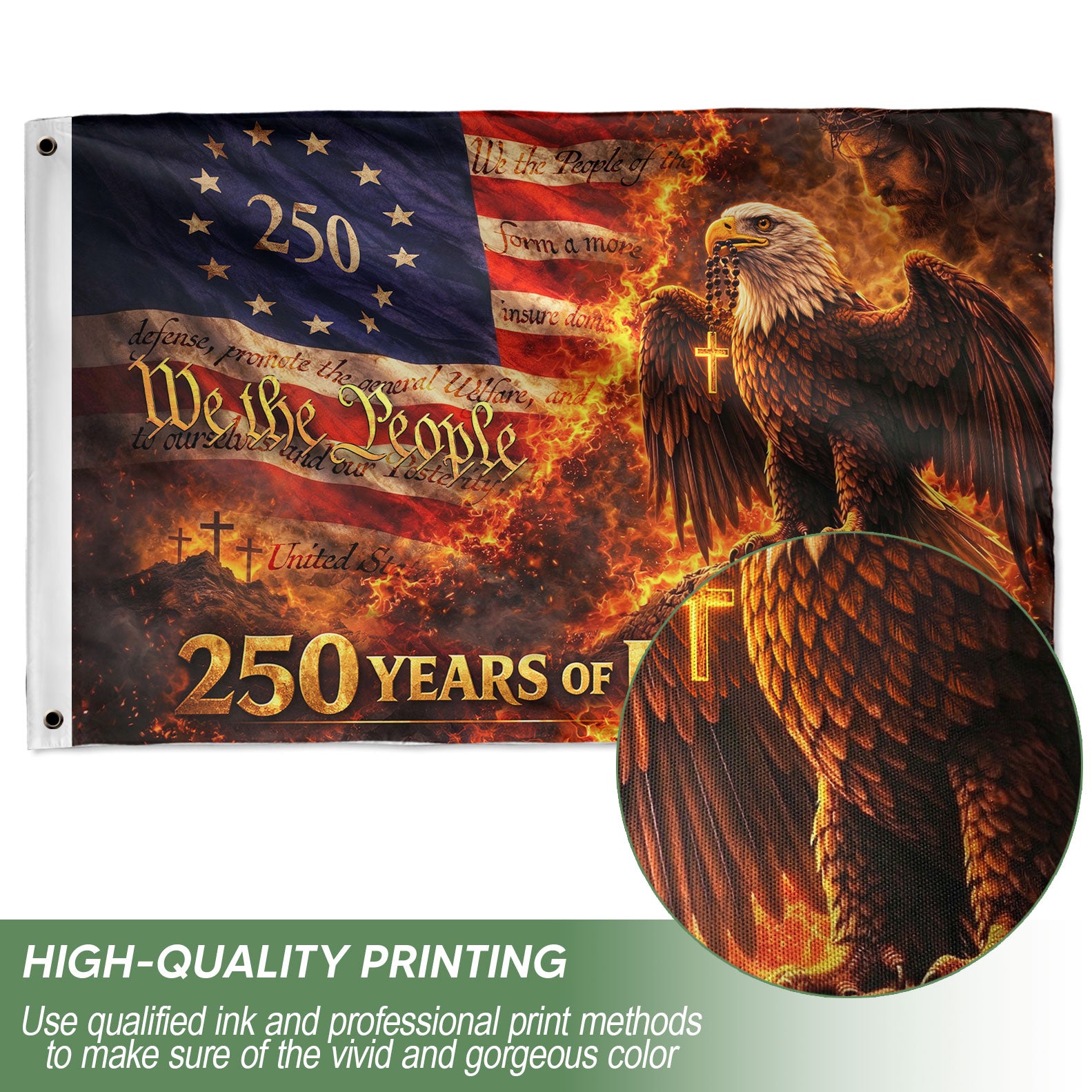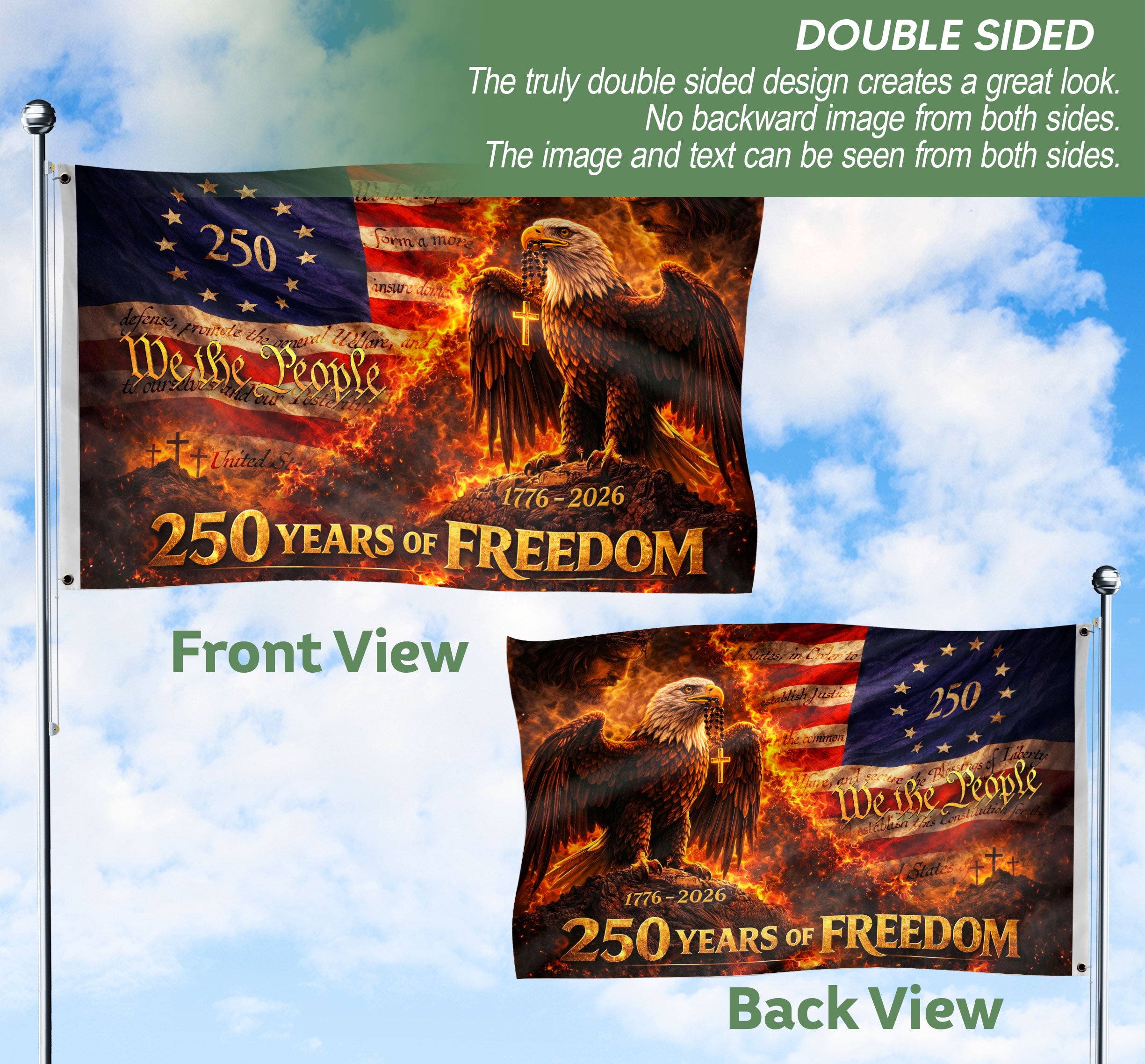 Celebrate America’s 250th anniversary with this patriotic house flag blending Christian faith and national pride. The design features a majestic eagle, prominent cross, and ‘We The People’ text, commemorating 250 years of freedom from 1776 to 2026. Ideal for displaying on homes, gardens, porches, or fences during Independence Day, Memorial Day, Fourth of July, or any patriotic occasion. Crafted from durable, weather-resistant polyester fabric to withstand outdoor conditions while maintaining vibrant colors and sharp details. Double-sided printing ensures visibility from both sides. Easy to hang with a standard flagpole sleeve or grommets. Perfect for history enthusiasts, veterans, and families honoring American heritage and values.