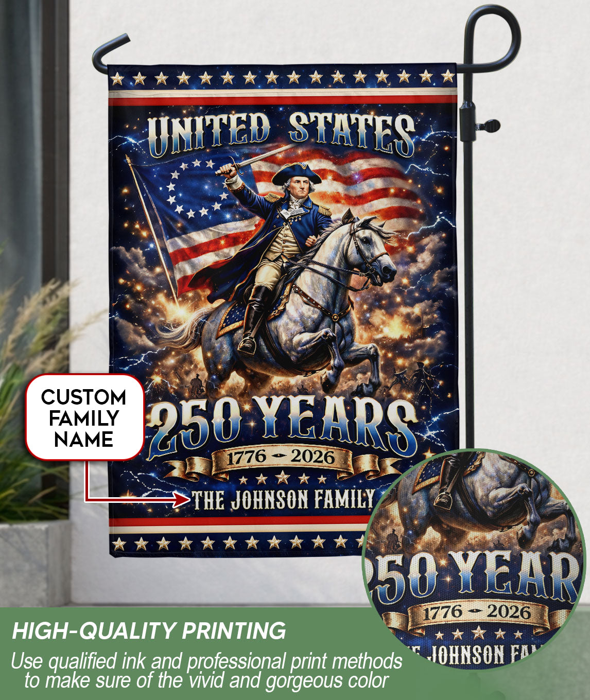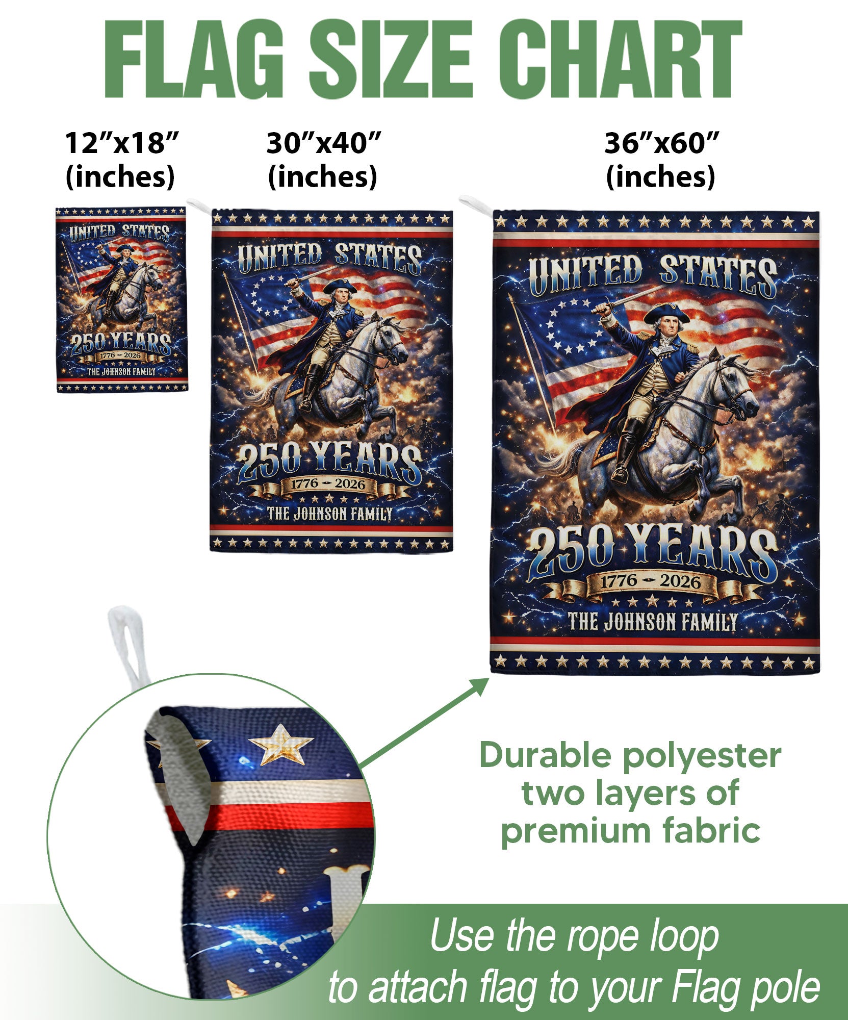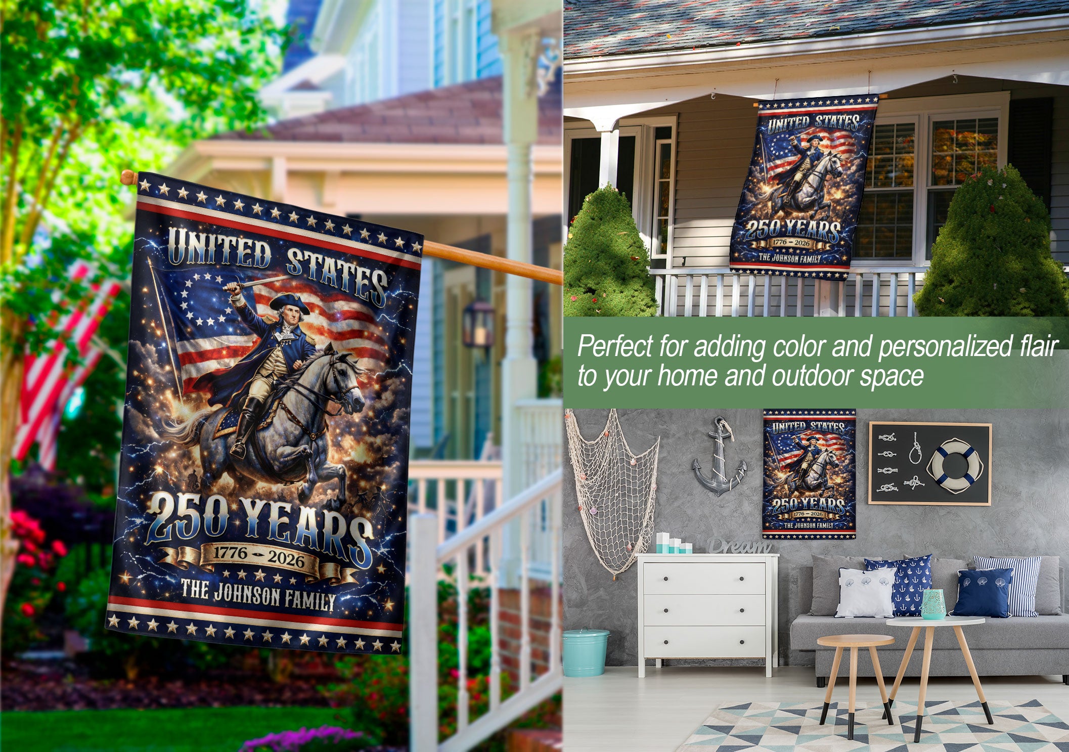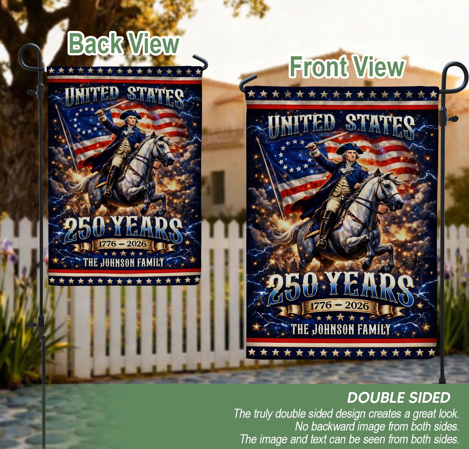 Celebrate America’s 250th anniversary with this personalized garden flag featuring George Washington on horseback alongside the iconic American flag, spanning 1776 to 2026. Customize it with your family name for a unique tribute to U.S. history. Crafted from durable, weather-resistant polyester fabric, this double-sided garden flag measures approximately 12.5 x 18 inches, perfect for displaying in your yard, garden, porch, or patio. The vibrant print captures the patriotic spirit, making it an ideal decoration for Independence Day, historical commemorations, or as a thoughtful gift for history enthusiasts and patriots. Easy to attach to any standard garden flag pole (pole sold separately). Bring pride and personalization to your outdoor space with this commemorative piece.