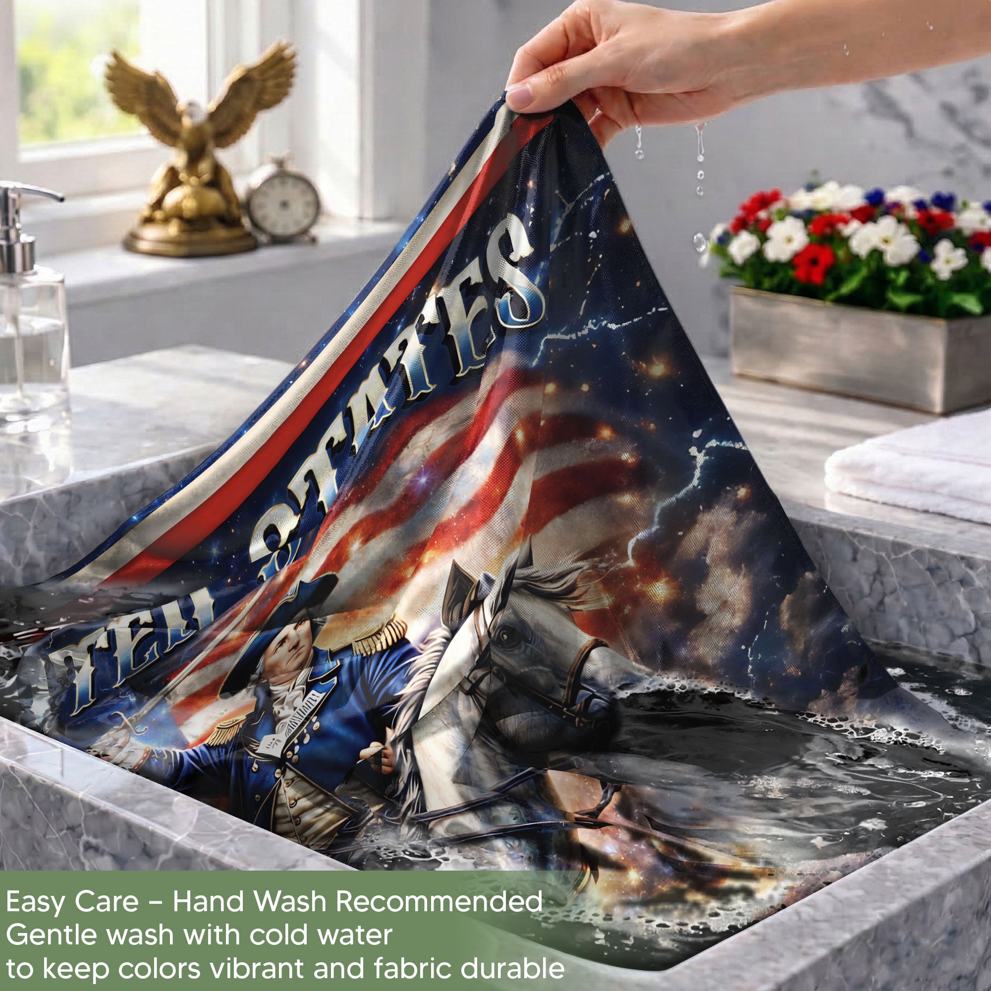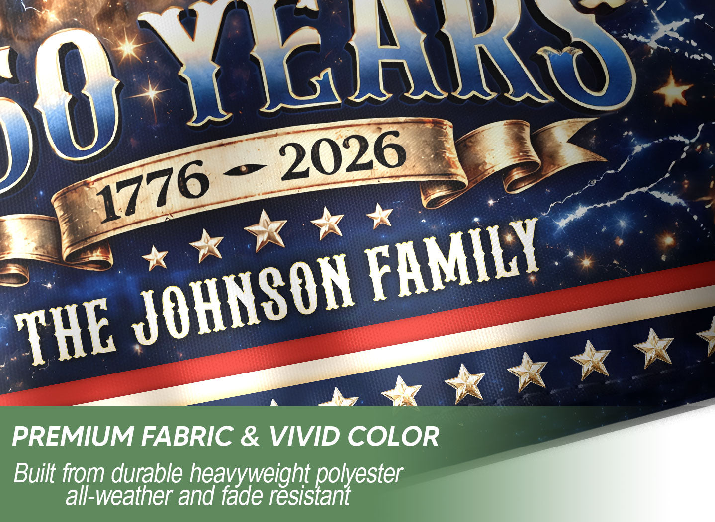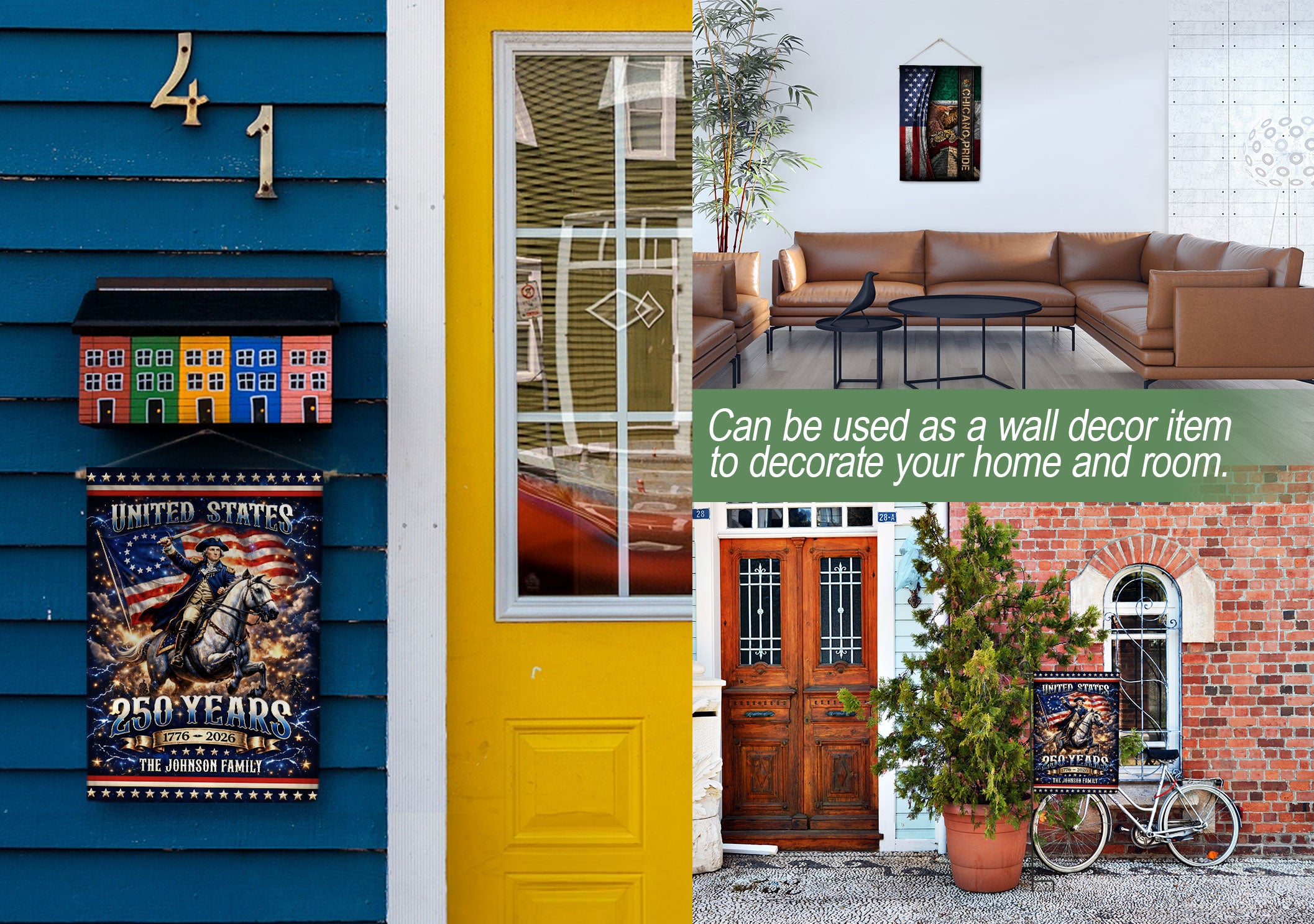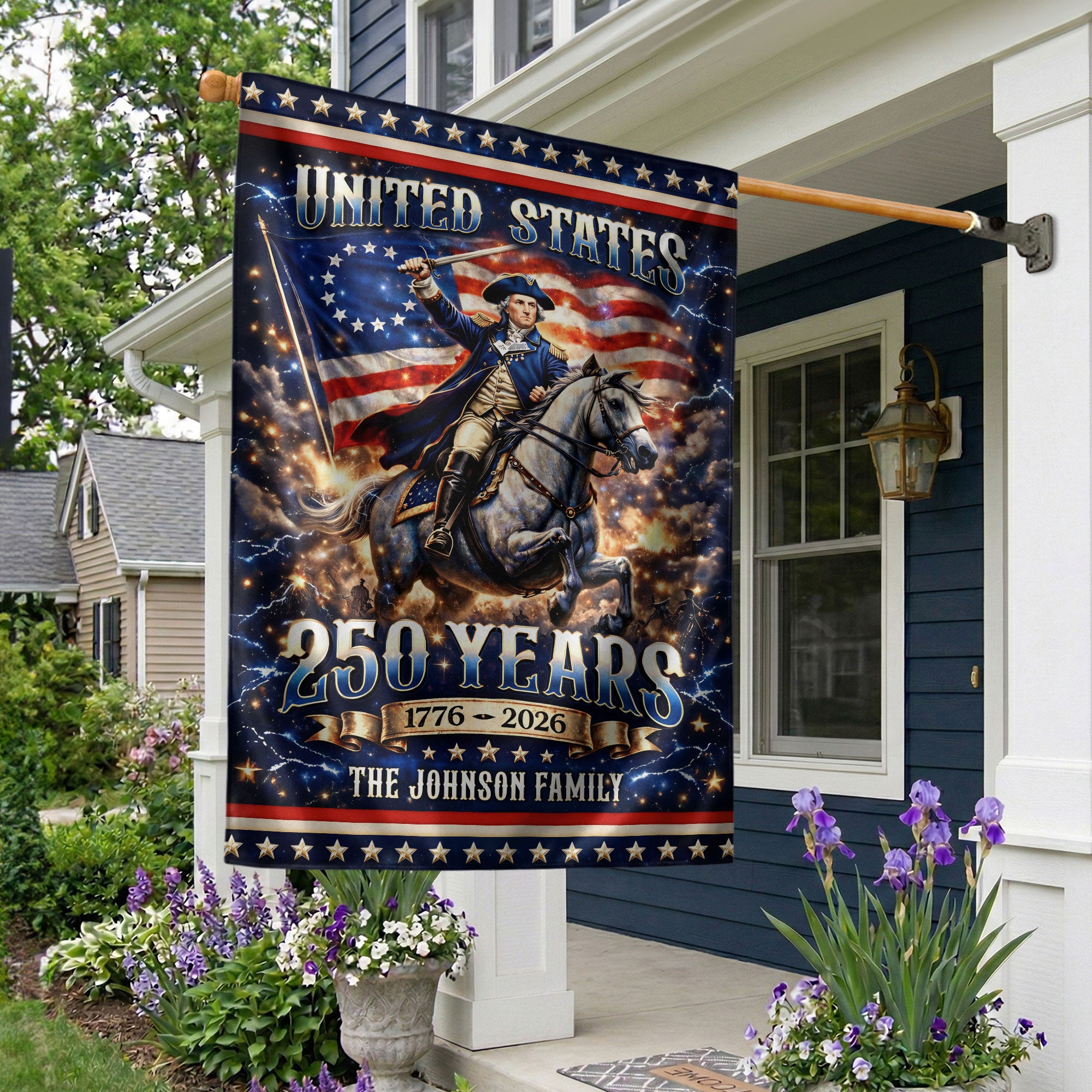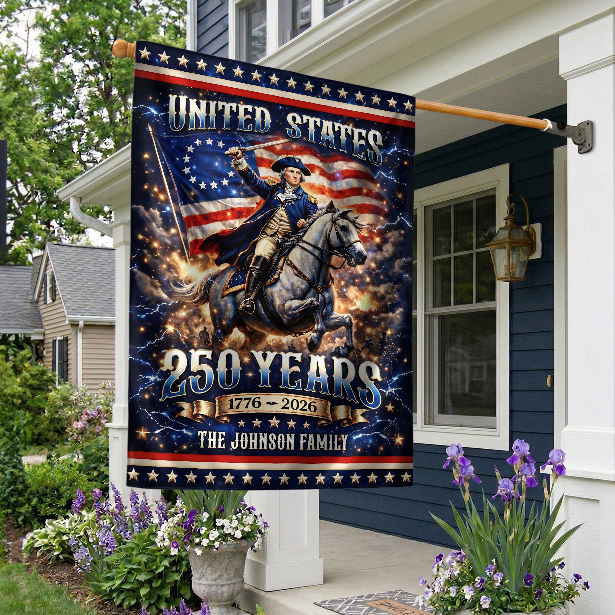Celebrate America’s 250th anniversary with this personalized garden flag featuring George Washington on horseback alongside the iconic American flag, spanning 1776 to 2026. Customize it with your family name for a unique tribute to U.S. history. Crafted from durable, weather-resistant polyester fabric, this double-sided garden flag measures approximately 12.5 x 18 inches, perfect for displaying in your yard, garden, porch, or patio. The vibrant print captures the patriotic spirit, making it an ideal decoration for Independence Day, historical commemorations, or as a thoughtful gift for history enthusiasts and patriots. Easy to attach to any standard garden flag pole (pole sold separately). Bring pride and personalization to your outdoor space with this commemorative piece.