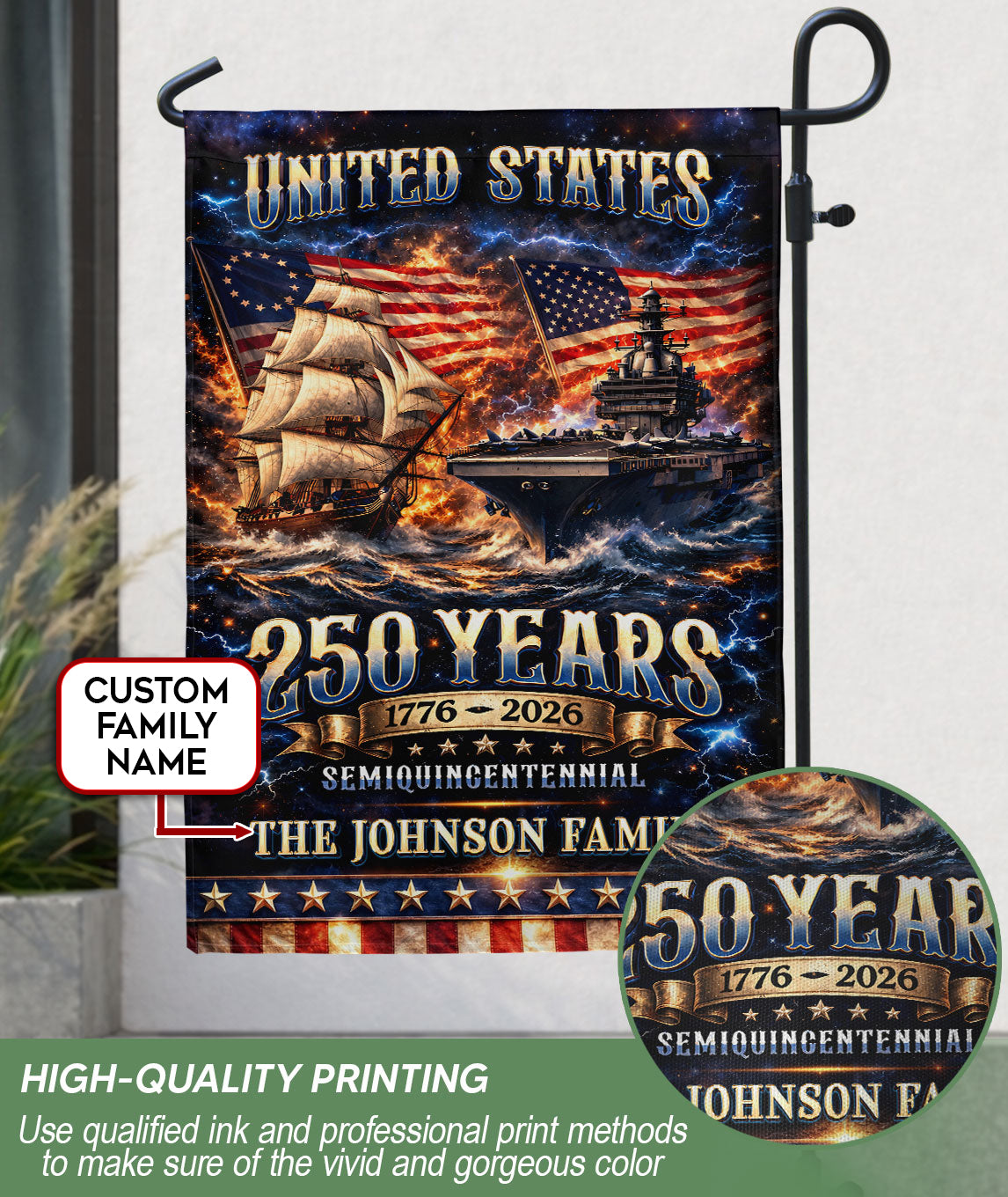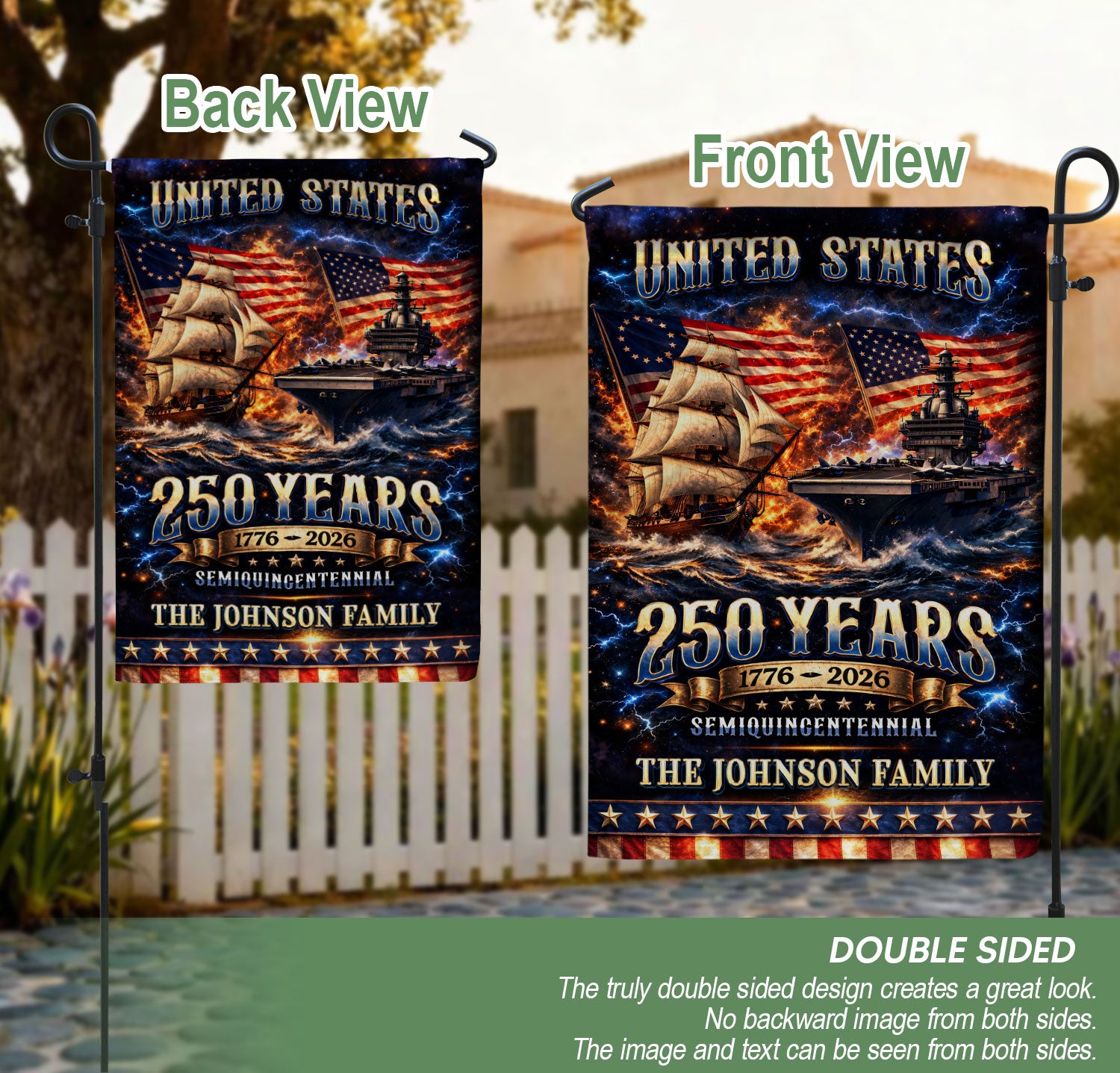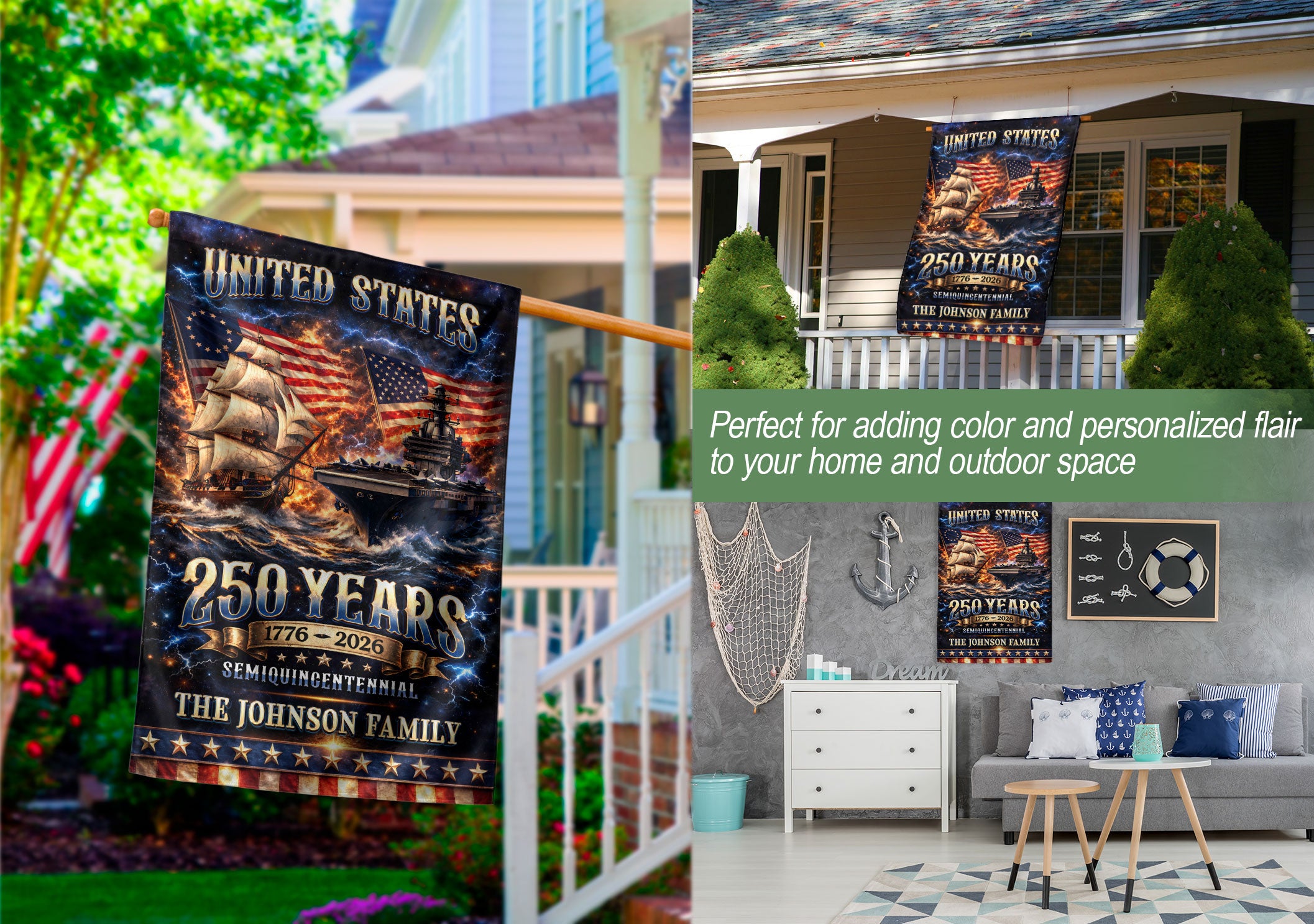 Celebrate America’s 250th anniversary with this custom family name garden flag. The design features a historic sailing ship from 1776 alongside a modern U.S. Navy warship, framed by the American flag, symbolizing the nation’s enduring maritime heritage through 2026. Personalize it with your family name for a unique display in your garden, yard, or patio. Crafted from durable, weather-resistant polyester fabric, this double-sided garden flag measures approximately 12×18 inches and fits standard garden flag poles (pole not included). Ideal for patriots, history enthusiasts, veterans, and families marking this historic milestone. Easy to hang and remove, it adds patriotic pride to homes, porches, or events. Perfect personalized gift for Independence Day, Memorial Day, or Veterans Day celebrations.