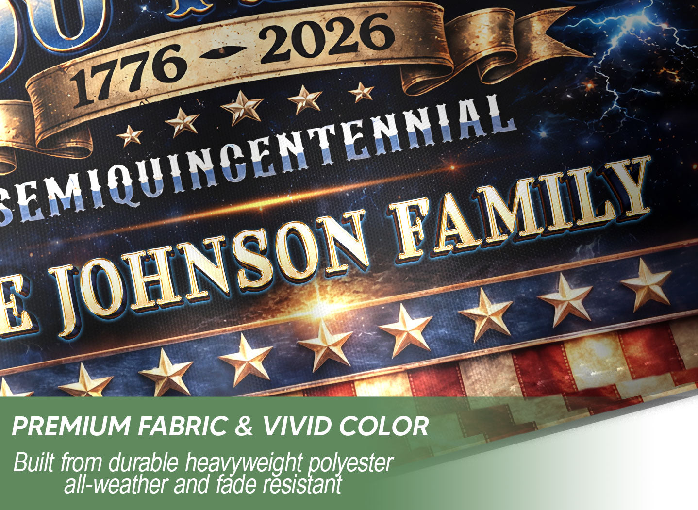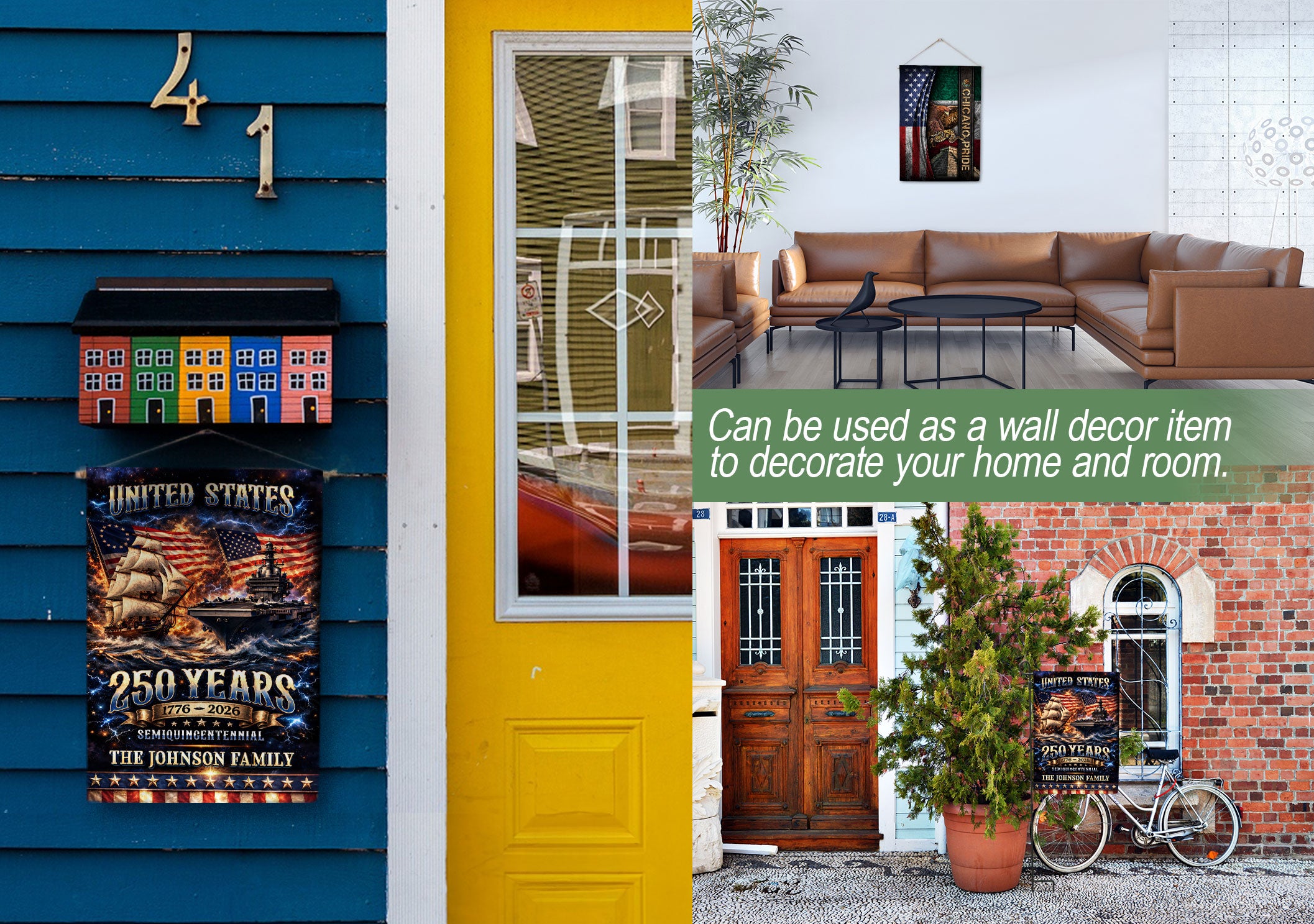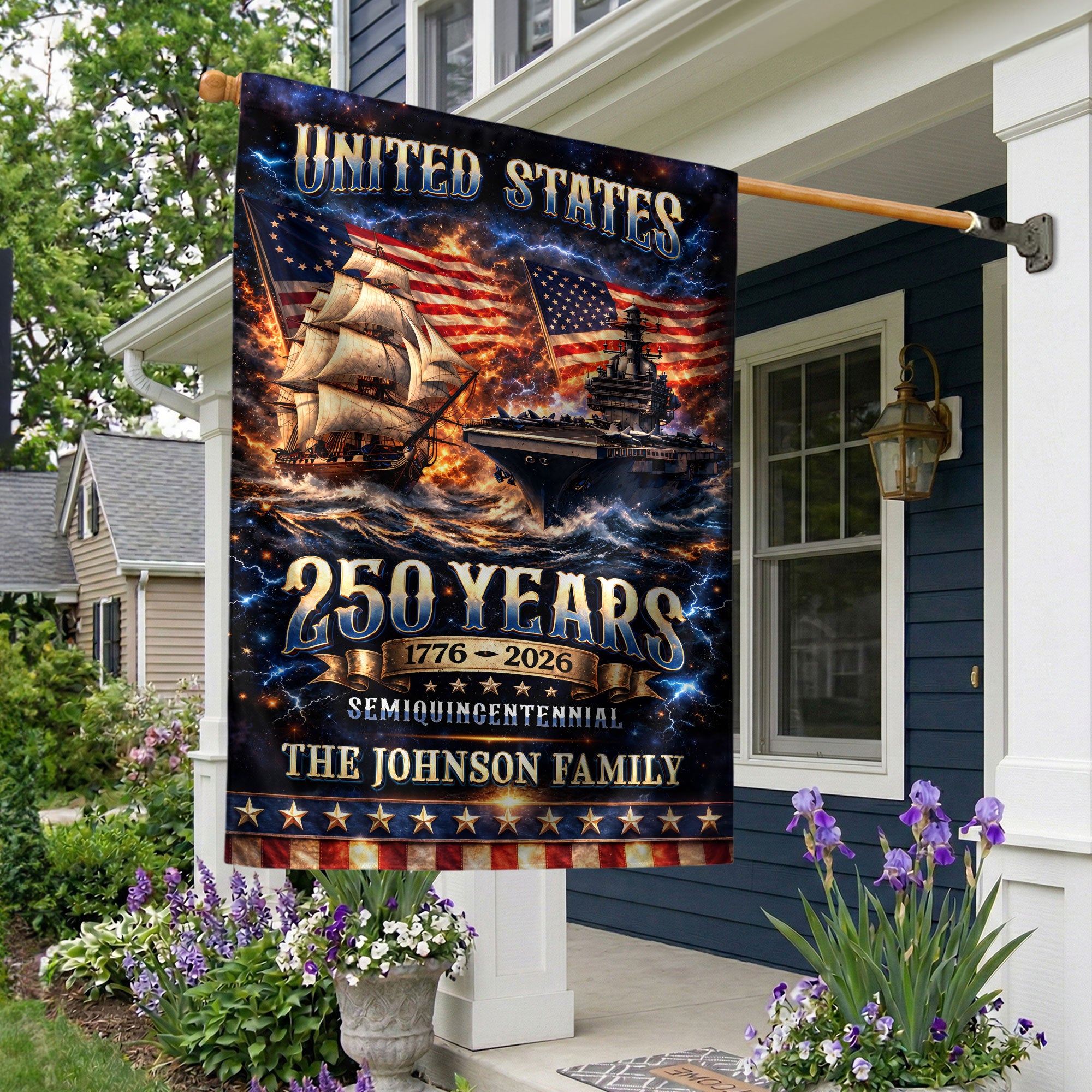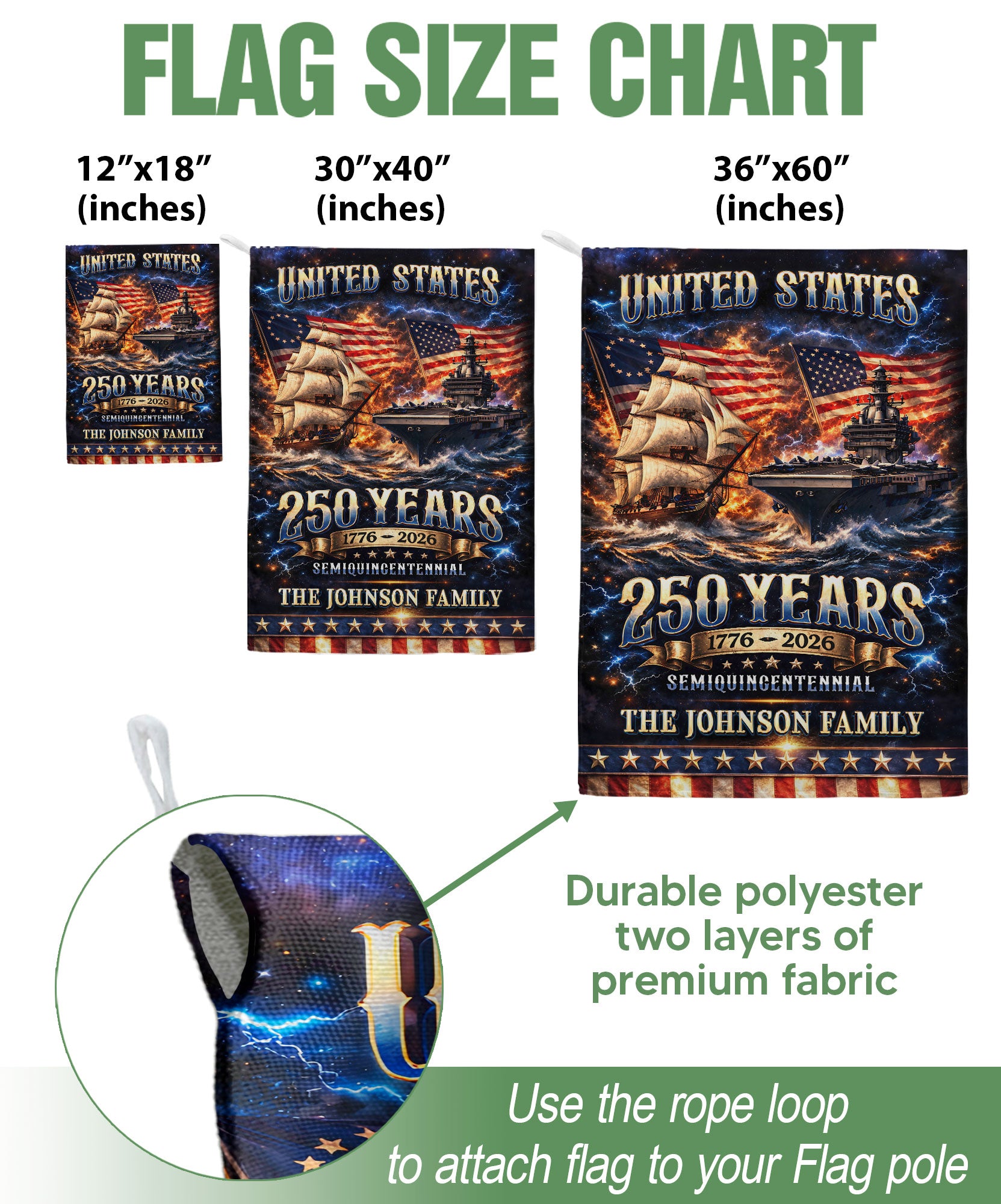 Celebrate America’s 250th anniversary with this custom family name garden flag. The design features a historic sailing ship from 1776 alongside a modern U.S. Navy warship, framed by the American flag, symbolizing the nation’s enduring maritime heritage through 2026. Personalize it with your family name for a unique display in your garden, yard, or patio. Crafted from durable, weather-resistant polyester fabric, this double-sided garden flag measures approximately 12×18 inches and fits standard garden flag poles (pole not included). Ideal for patriots, history enthusiasts, veterans, and families marking this historic milestone. Easy to hang and remove, it adds patriotic pride to homes, porches, or events. Perfect personalized gift for Independence Day, Memorial Day, or Veterans Day celebrations.
