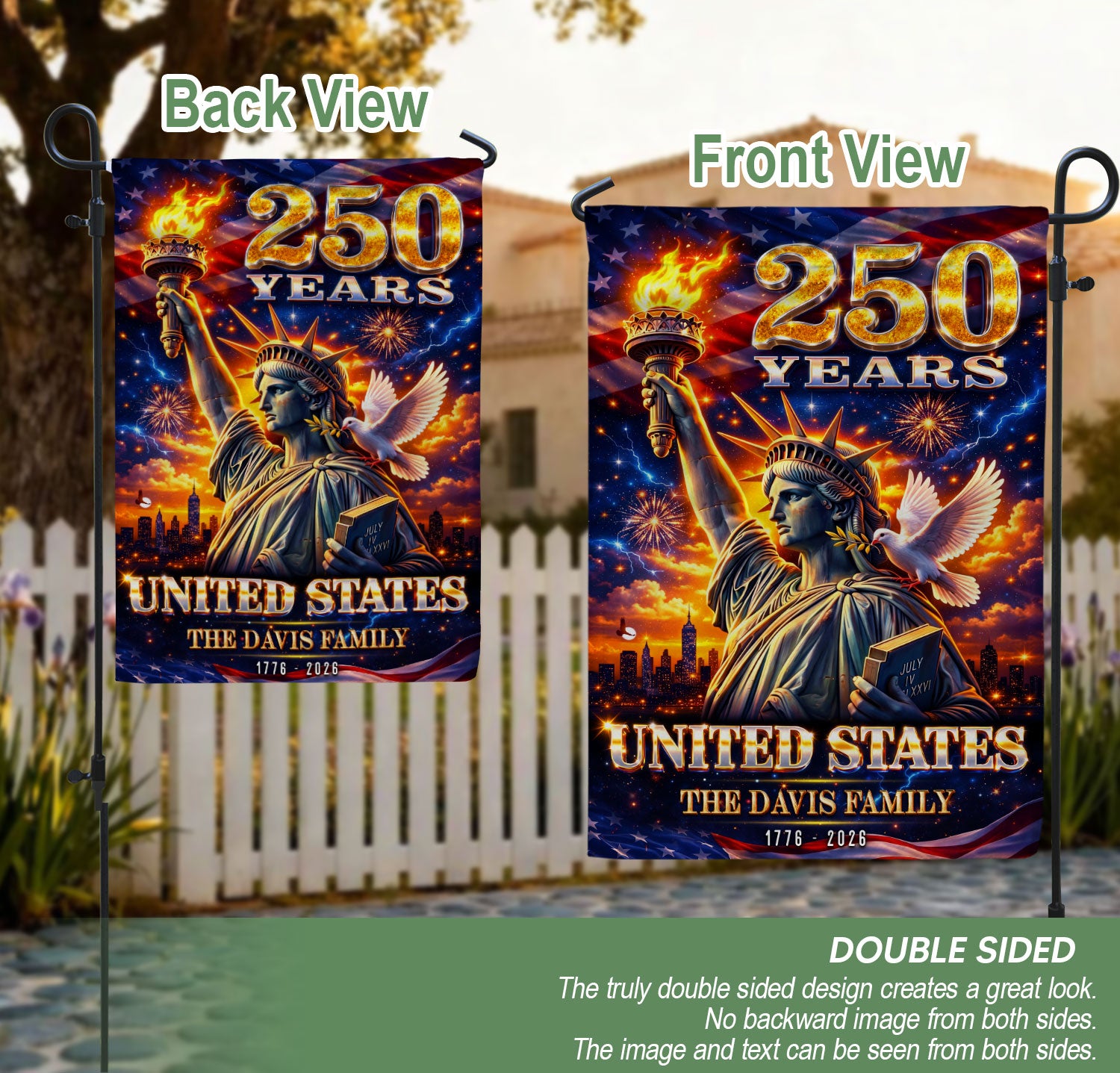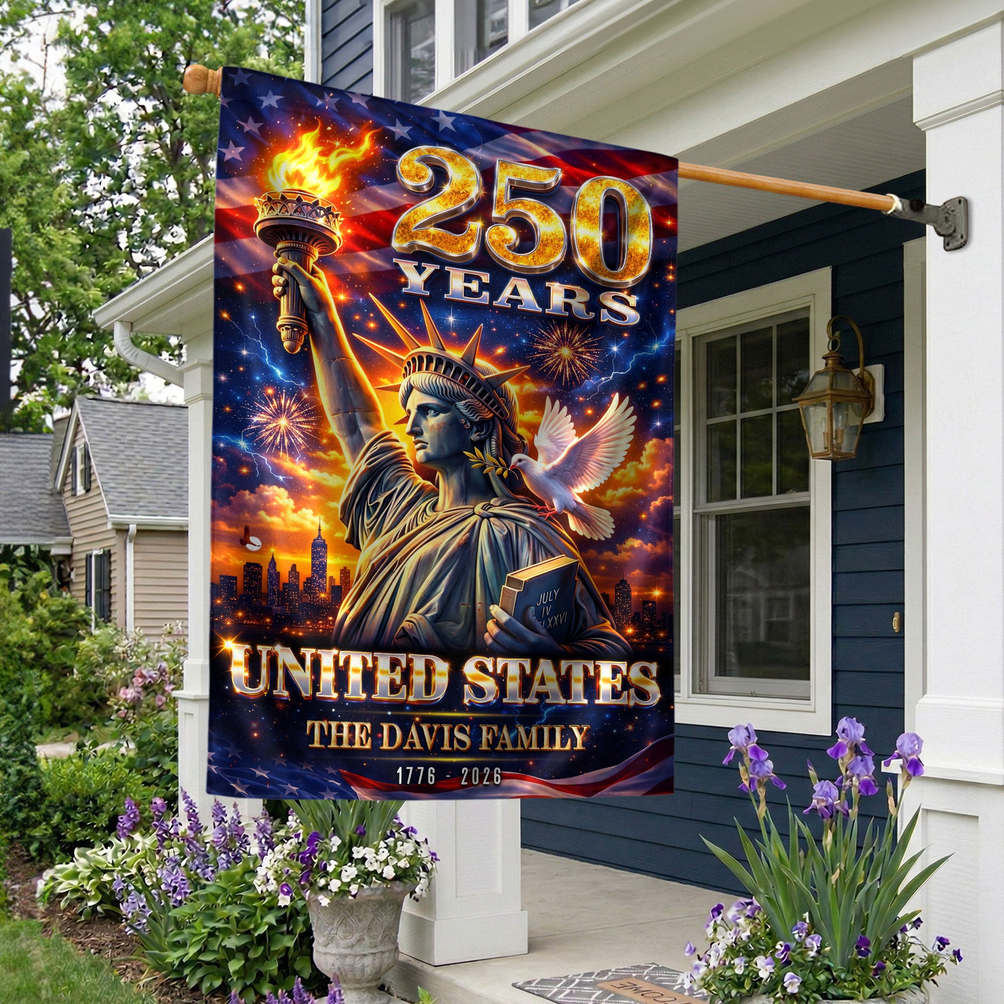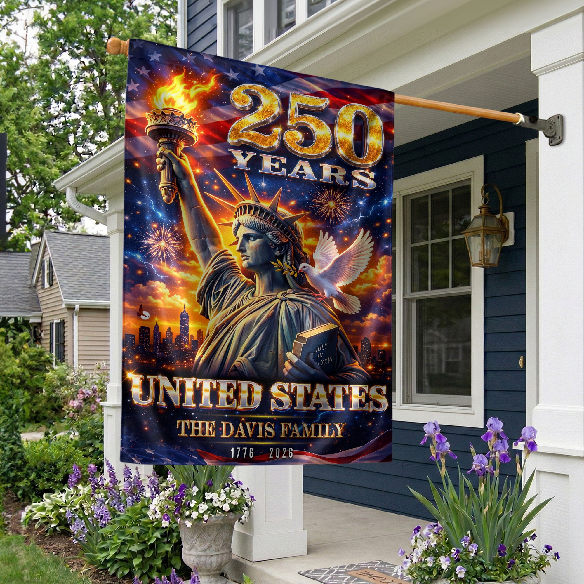 Celebrate the United States’ 250th anniversary with this custom family name garden flag. The design prominently features the iconic Statue of Liberty, surrounded by vibrant fireworks and a dove of peace, symbolizing America’s enduring spirit from 1776 to 2026. Made from durable, weather-resistant polyester fabric, this double-sided garden flag measures approximately 12.5 x 18 inches, perfect for outdoor display in gardens, porches, or patios. Personalize it with your family name to showcase your heritage and patriotism. Ideal for history enthusiasts, veterans, or as a thoughtful gift for the semiquincentennial milestone. Easy to attach to garden flag poles (sold separately) and built to withstand wind and elements for long-lasting display.