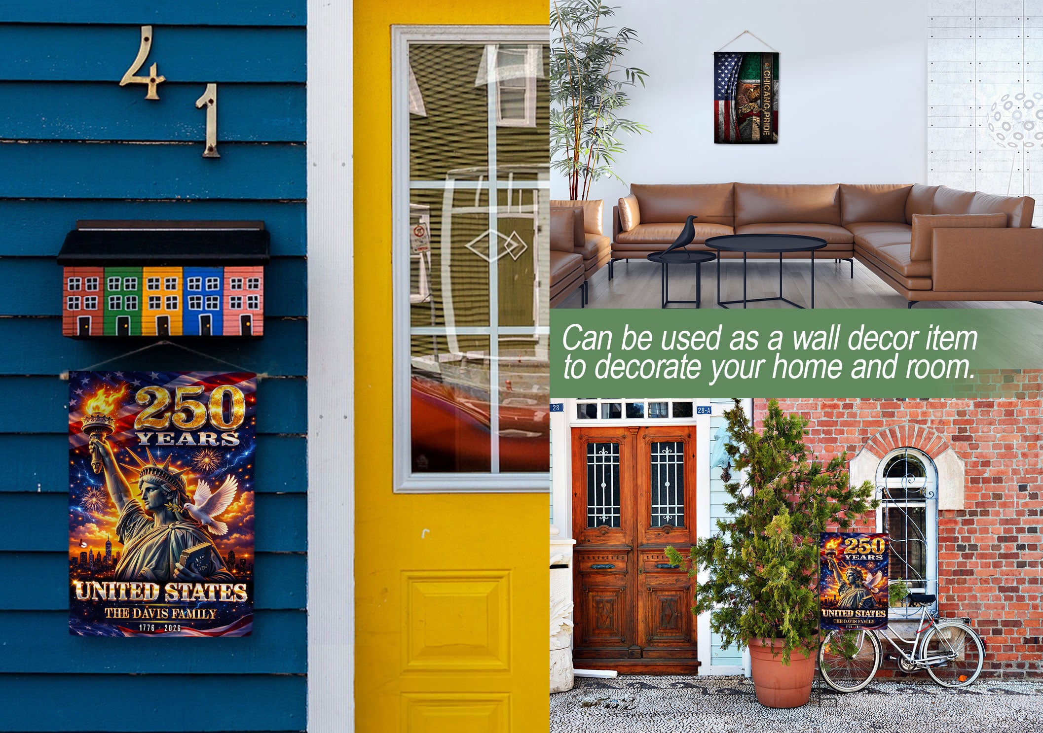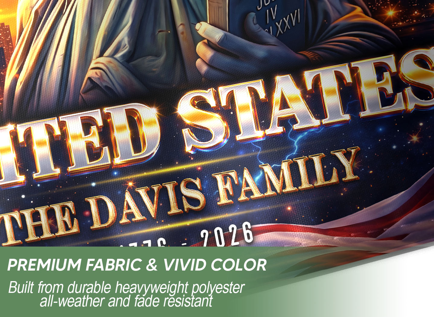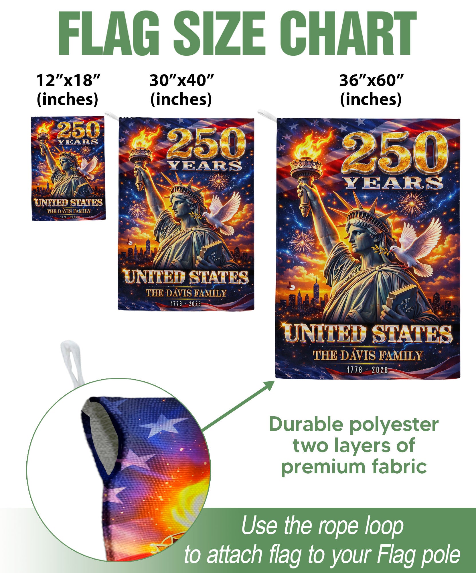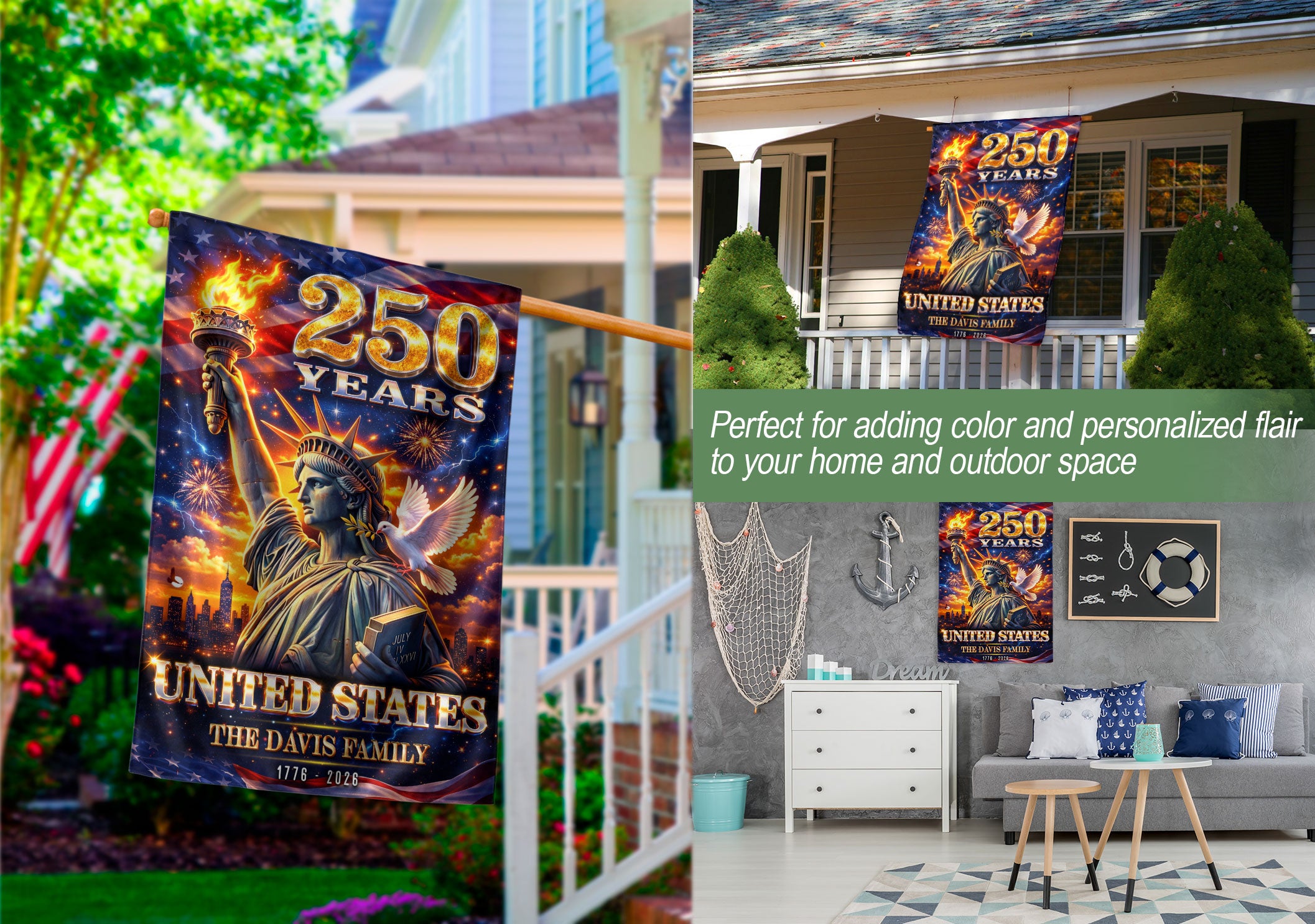 Celebrate the United States’ 250th anniversary with this custom family name garden flag. The design prominently features the iconic Statue of Liberty, surrounded by vibrant fireworks and a dove of peace, symbolizing America’s enduring spirit from 1776 to 2026. Made from durable, weather-resistant polyester fabric, this double-sided garden flag measures approximately 12.5 x 18 inches, perfect for outdoor display in gardens, porches, or patios. Personalize it with your family name to showcase your heritage and patriotism. Ideal for history enthusiasts, veterans, or as a thoughtful gift for the semiquincentennial milestone. Easy to attach to garden flag poles (sold separately) and built to withstand wind and elements for long-lasting display.
