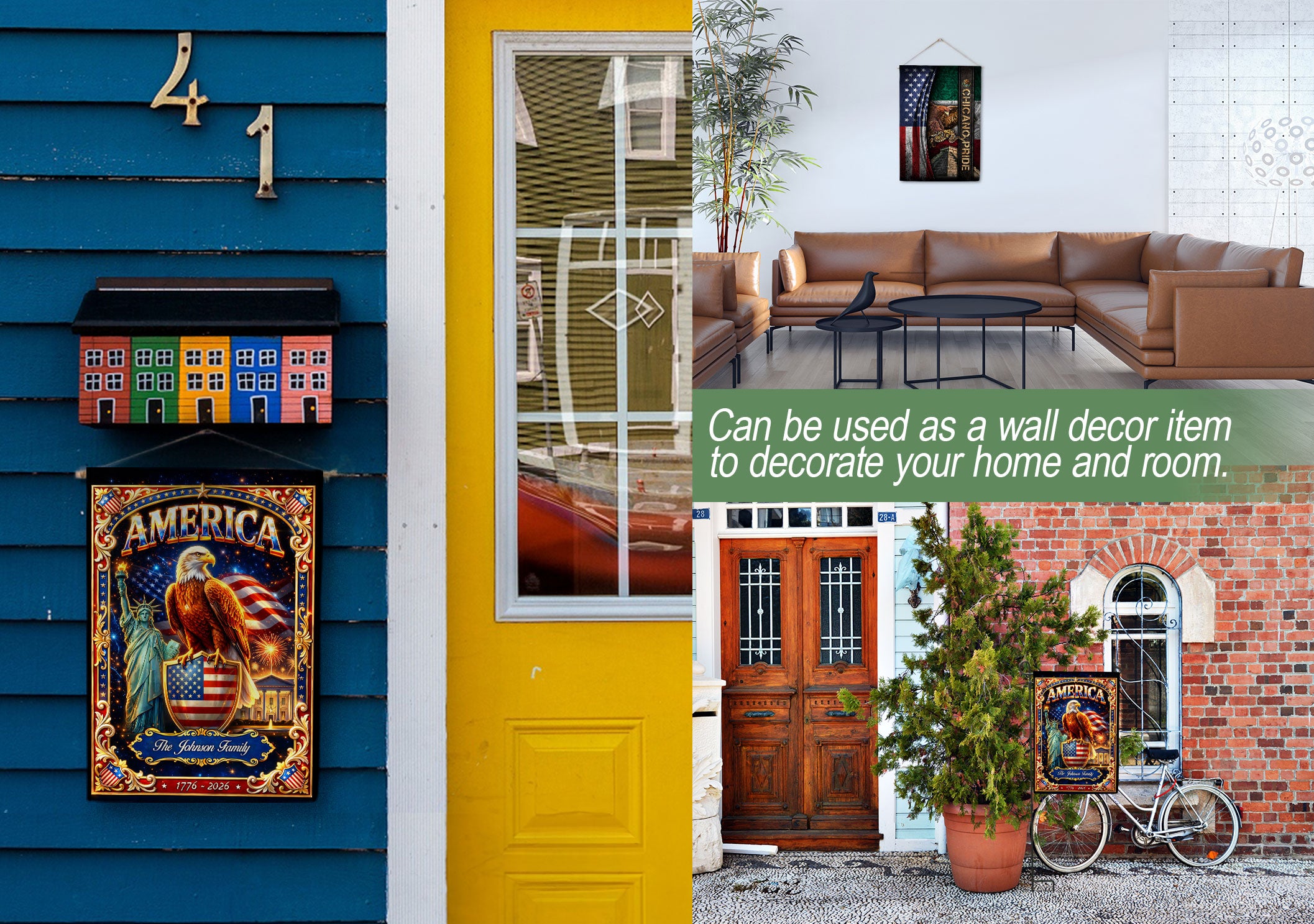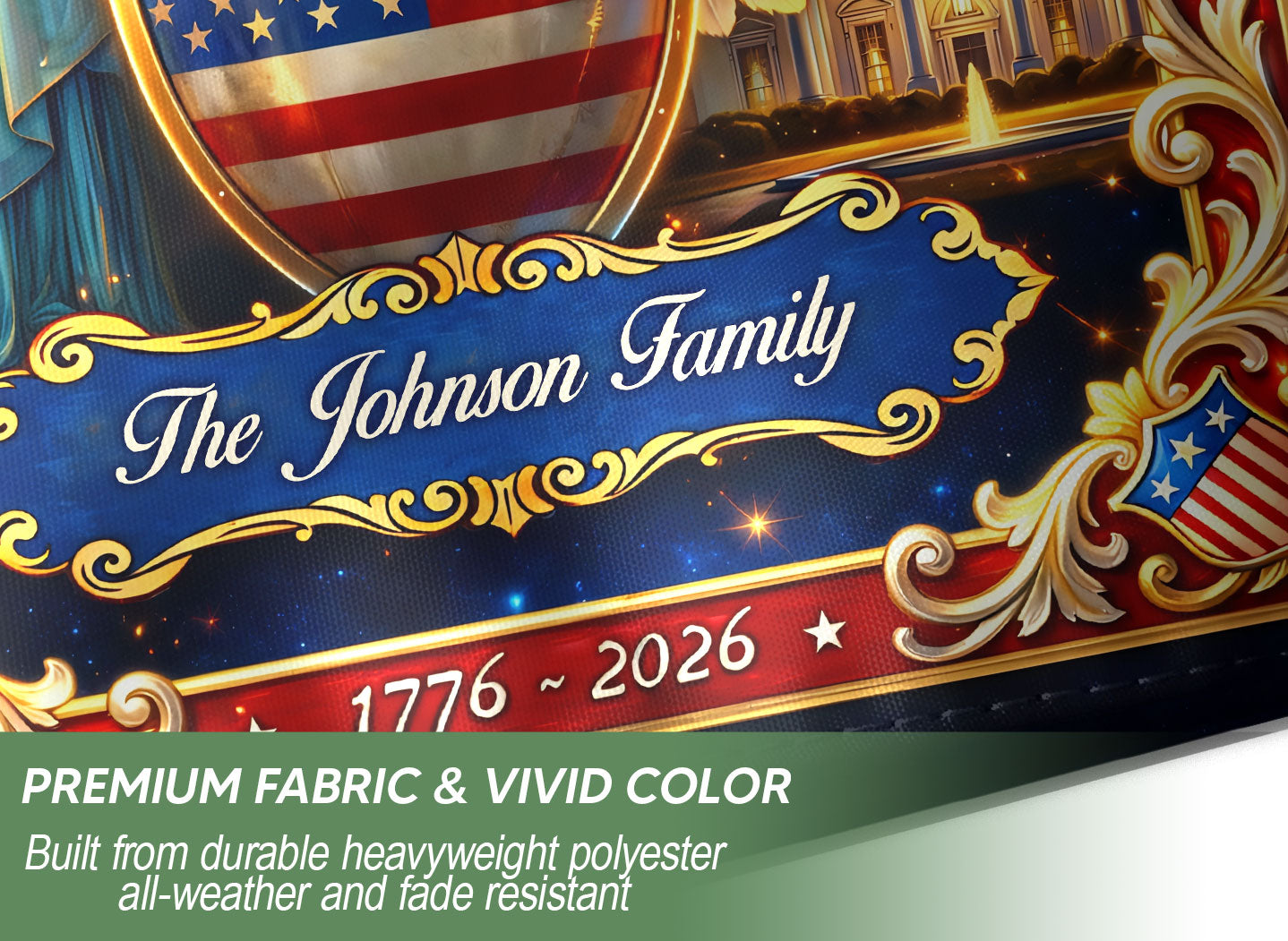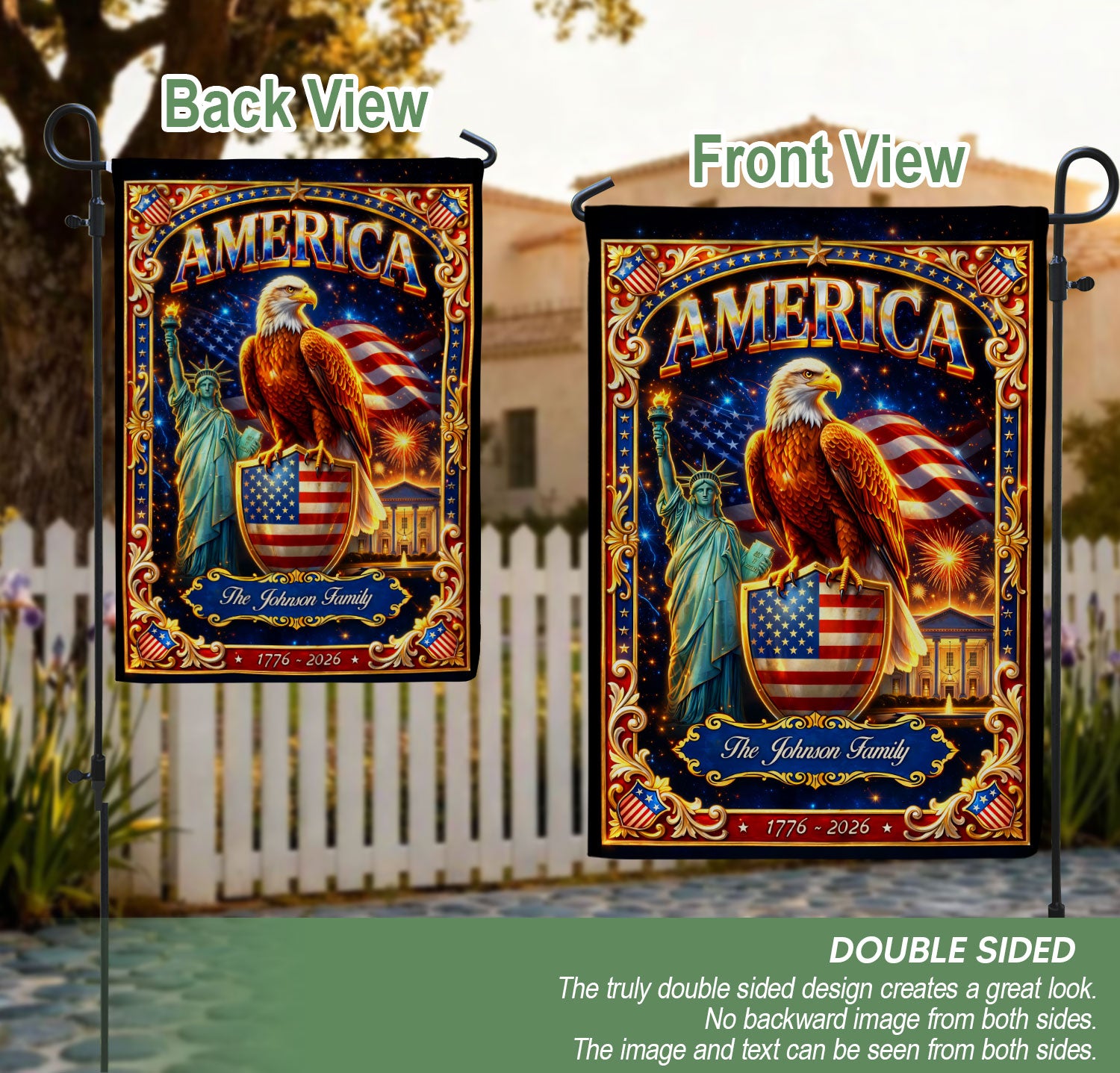 Celebrate America’s 250th anniversary with this custom family name garden flag. Featuring a striking design with a powerful bald eagle, the iconic Statue of Liberty, and vibrant fireworks, it honors the nation’s journey from 1776 to 2026. Made from durable, weather-resistant polyester fabric, this double-sided garden flag measures approximately 12.5 x 18 inches and fits standard garden flag poles. Personalize it with your family name for a unique patriotic display. Ideal for gardens, porches, mailboxes, or as a thoughtful gift for history enthusiasts, veterans, or family gatherings during this historic milestone. Easy to install and maintain, it adds a bold statement of American pride to any outdoor space.