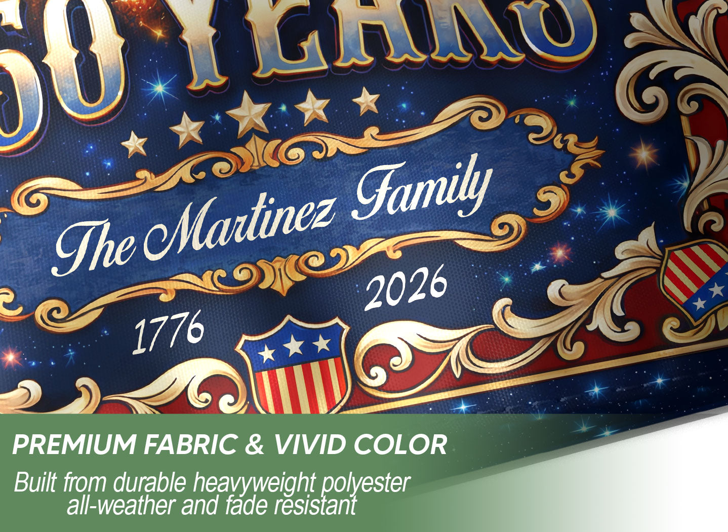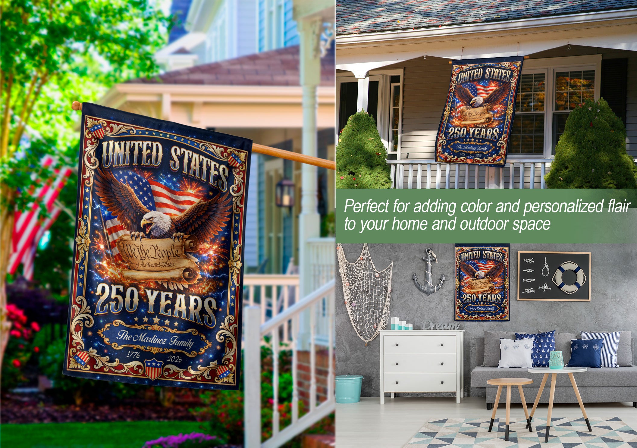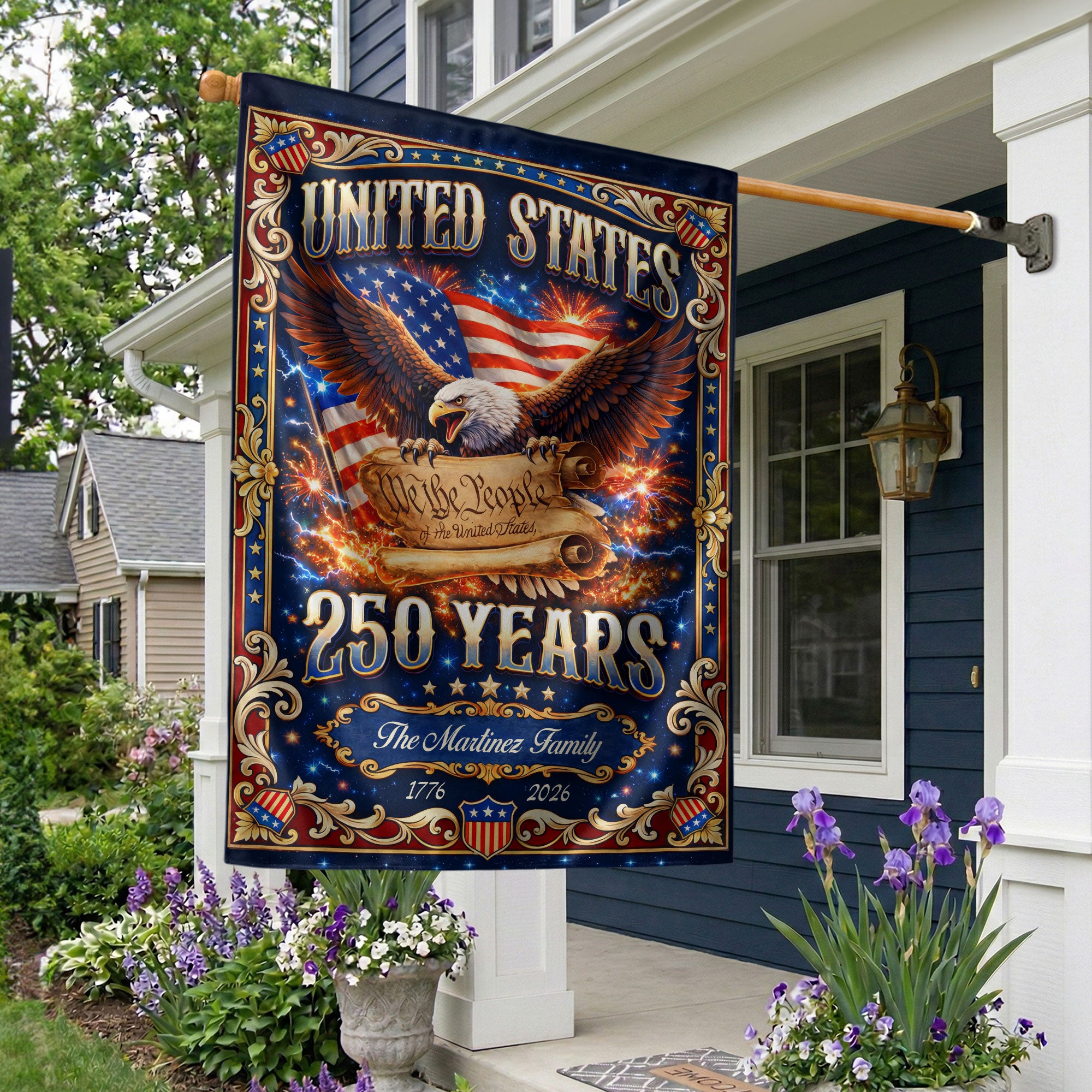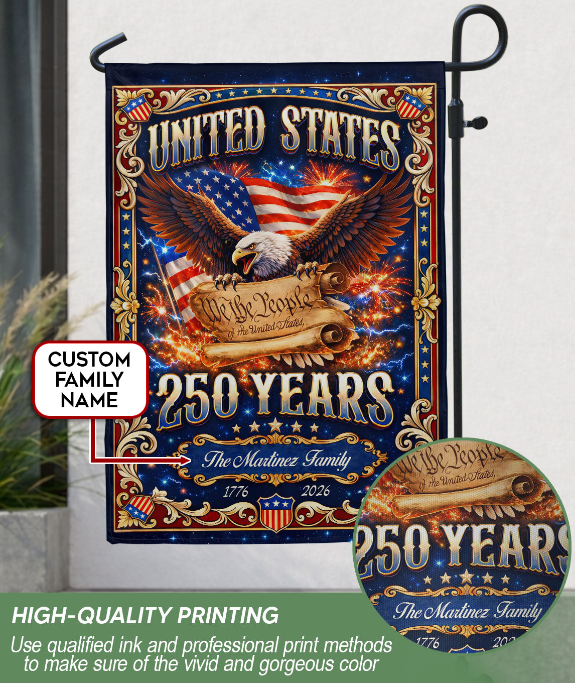 Celebrate America’s 250th anniversary with this custom family name garden flag. The design features a majestic USA eagle, the iconic ‘We the People’ scroll, and vibrant fireworks bursting across the scene, commemorating the historic period from 1776 to 2026. Personalize it with your family name to create a unique patriotic display for your yard, garden, porch, or mailbox. Crafted from durable, weather-resistant polyester fabric, this double-sided garden flag measures approximately 12.5 x 18 inches with a sleeve for easy pole attachment. It’s fade-resistant to maintain its bold red, white, and blue colors through seasons. Ideal for Fourth of July celebrations, historical commemorations, veterans’ events, or as a thoughtful gift for family members who cherish American heritage. Show your pride in the United States’ founding principles and enduring spirit with this meaningful outdoor decoration.