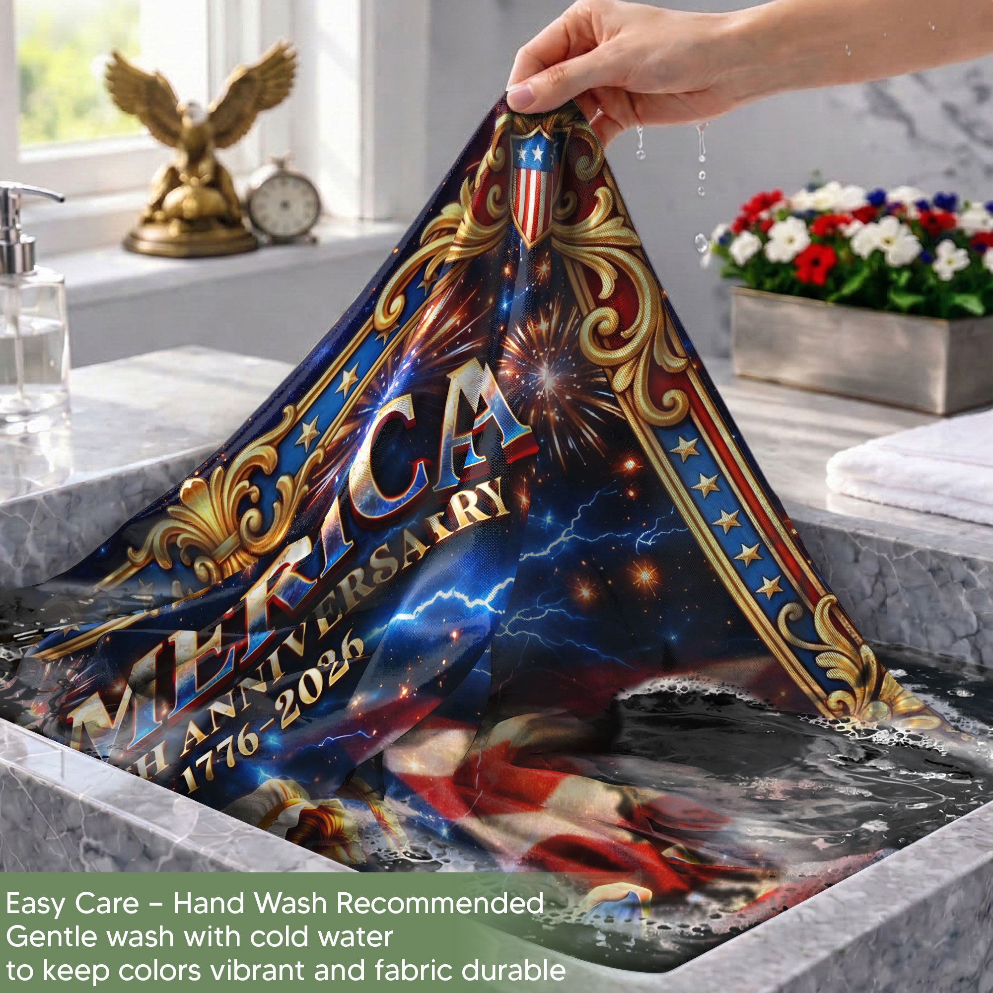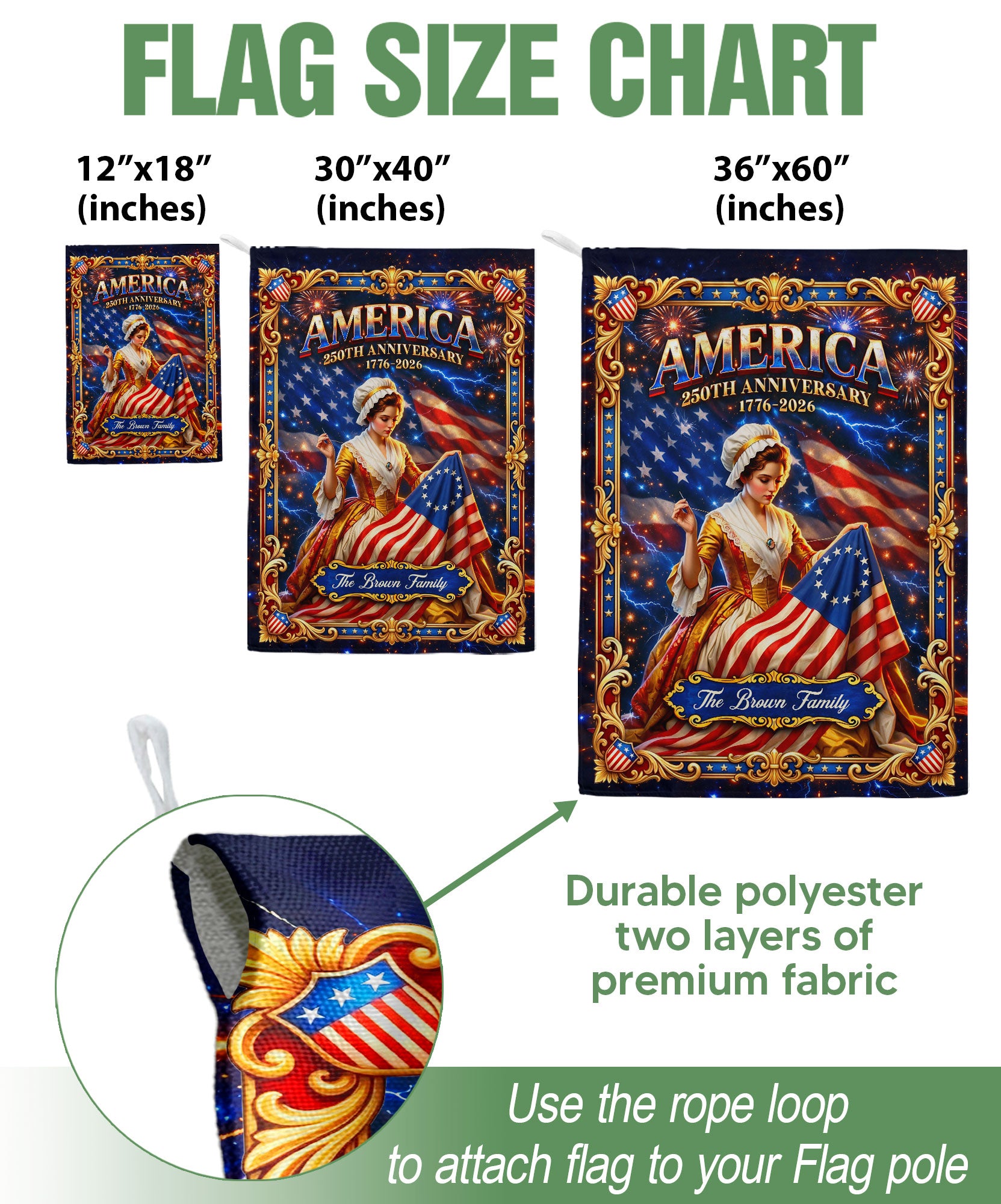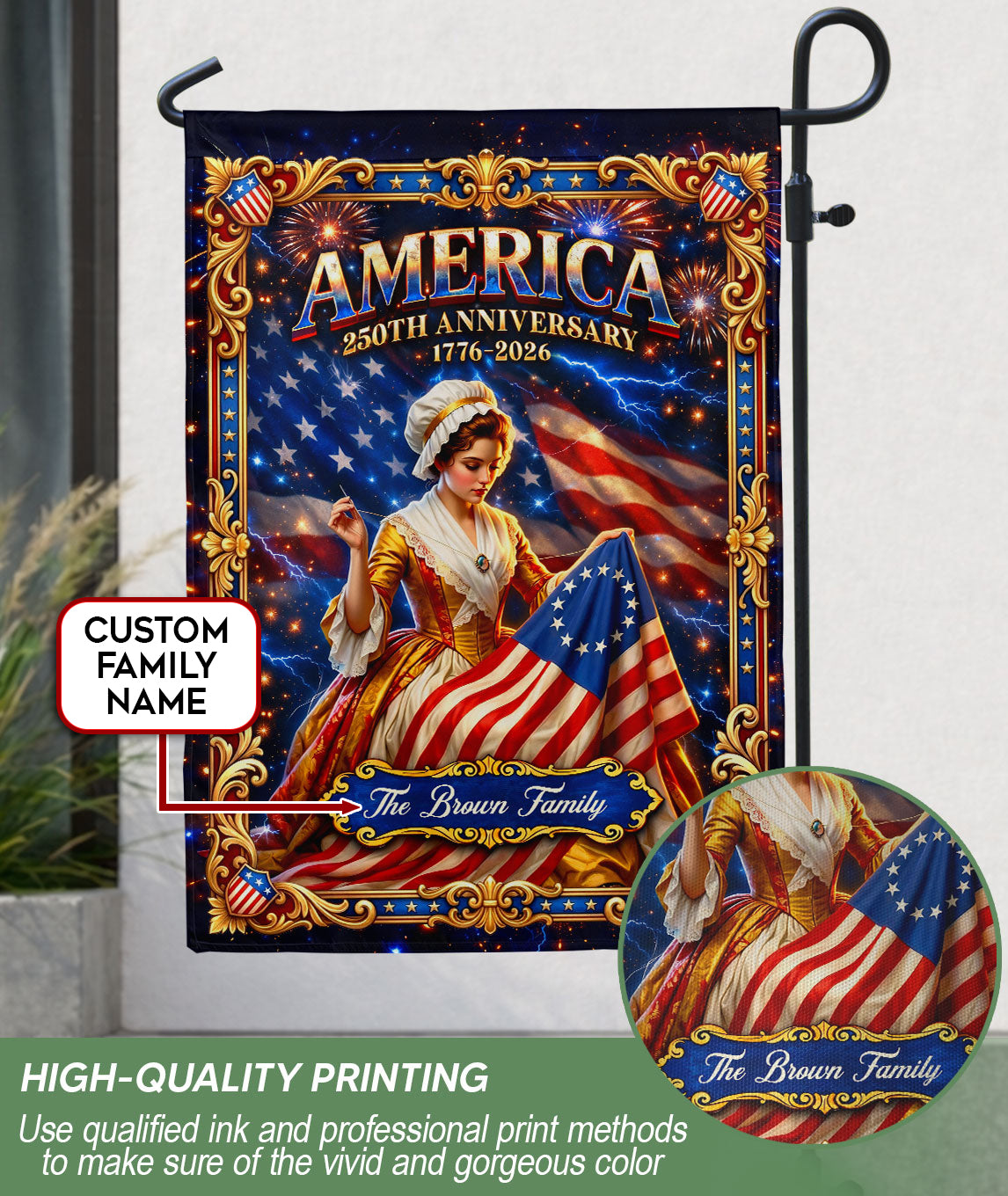 Celebrate America’s 250th anniversary with this personalized garden flag featuring Betsy Ross sewing the iconic original 13-star flag. The design prominently displays ‘America’ and the historic dates 1776-2026, perfect for patriotic displays in your yard, garden, or porch. Customize it with your family name to create a unique, meaningful tribute to U.S. history and heritage. Crafted from durable, weather-resistant polyester fabric, this double-sided garden flag measures approximately 12.5 x 18 inches and fits standard garden flag poles (pole not included). Ideal for Independence Day, Memorial Day, Fourth of July celebrations, or everyday display of national pride. Easy to hang and remove, it withstands outdoor elements while keeping vibrant colors and clear details. Add a personal touch to your home decor with this historical Betsy Ross themed patriotic banner.