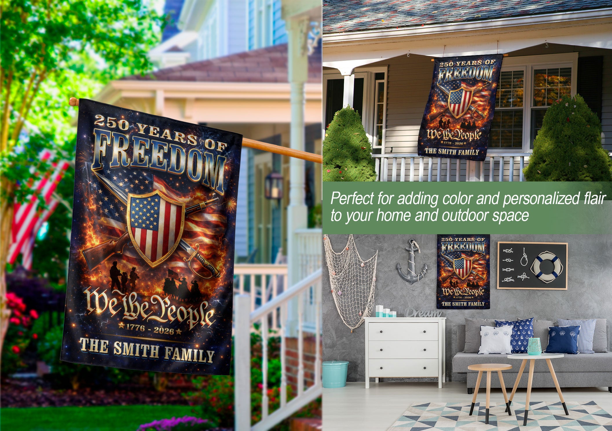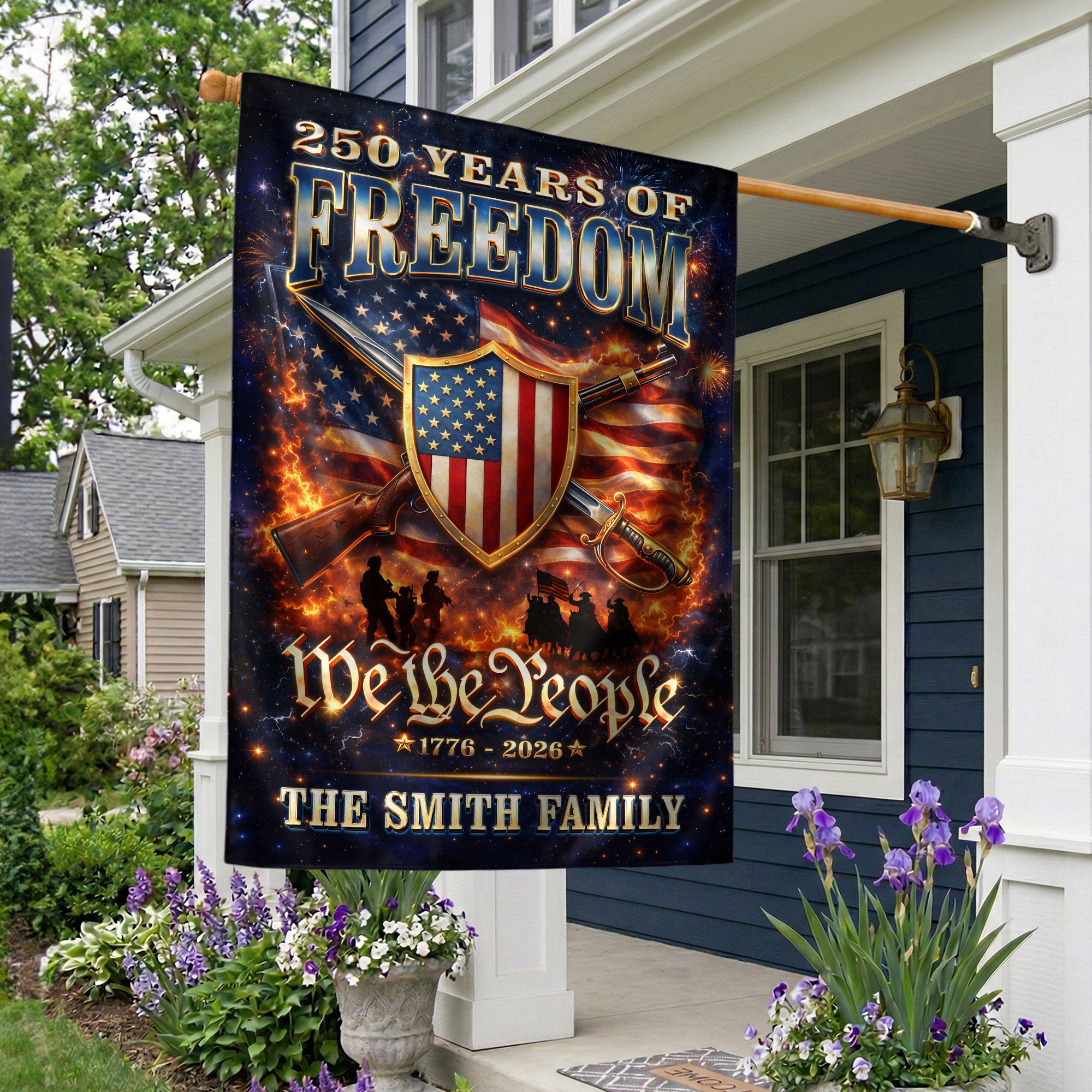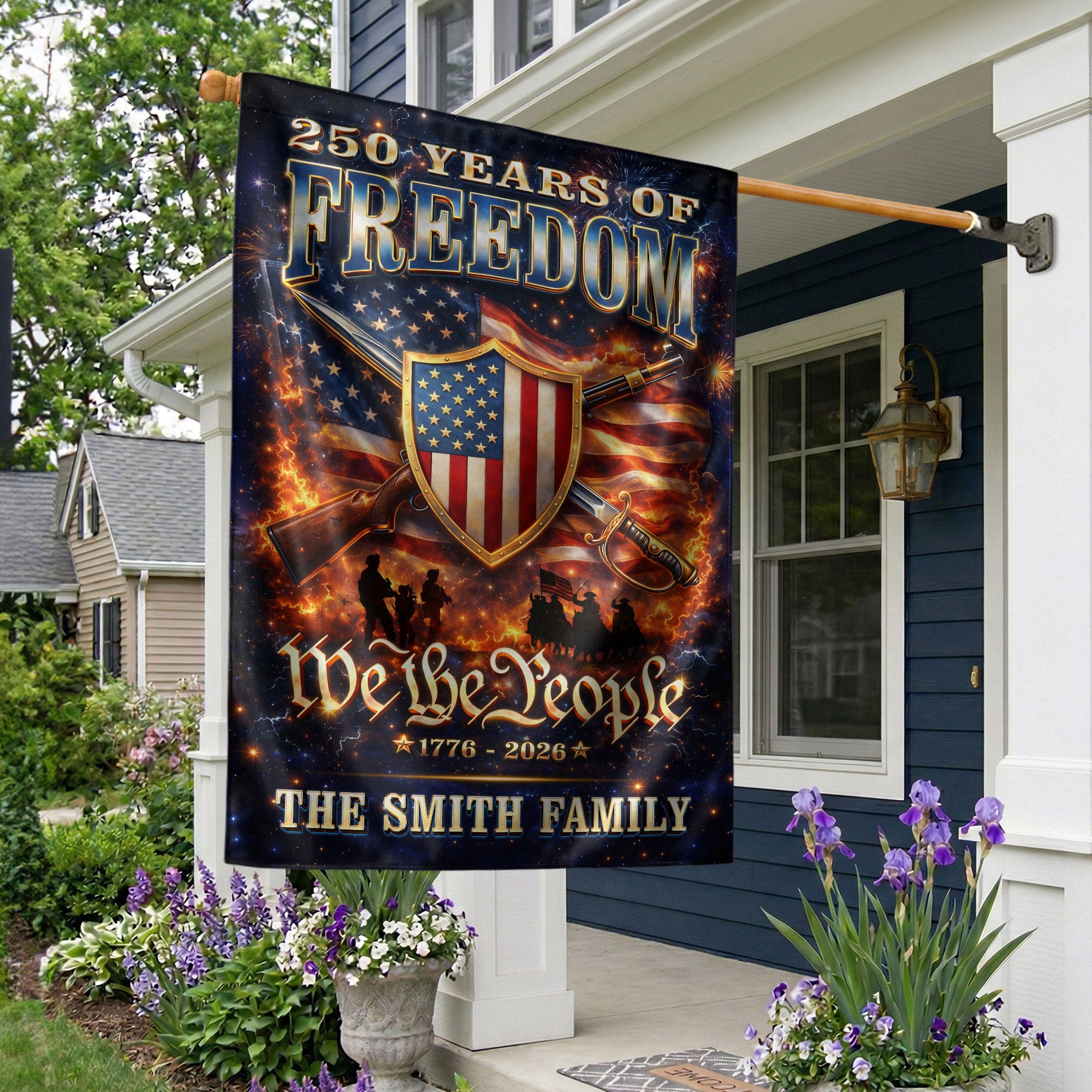 Celebrate America’s 250th anniversary of independence from 1776 to 2026 with this custom family name garden flag. Featuring a bold patriotic design with the American flag, ‘We The People’ message, and your personalized family name, this flag showcases national pride in your yard, porch, or garden. Crafted from durable, weather-resistant fabric, it withstands outdoor elements for long-lasting display. Vibrant colors and high-quality printing ensure it stands out year-round, perfect for Fourth of July, Memorial Day, or everyday patriotism. Easy to hang with a standard garden flag pole (not included). Personalize it with your family name for a unique touch.