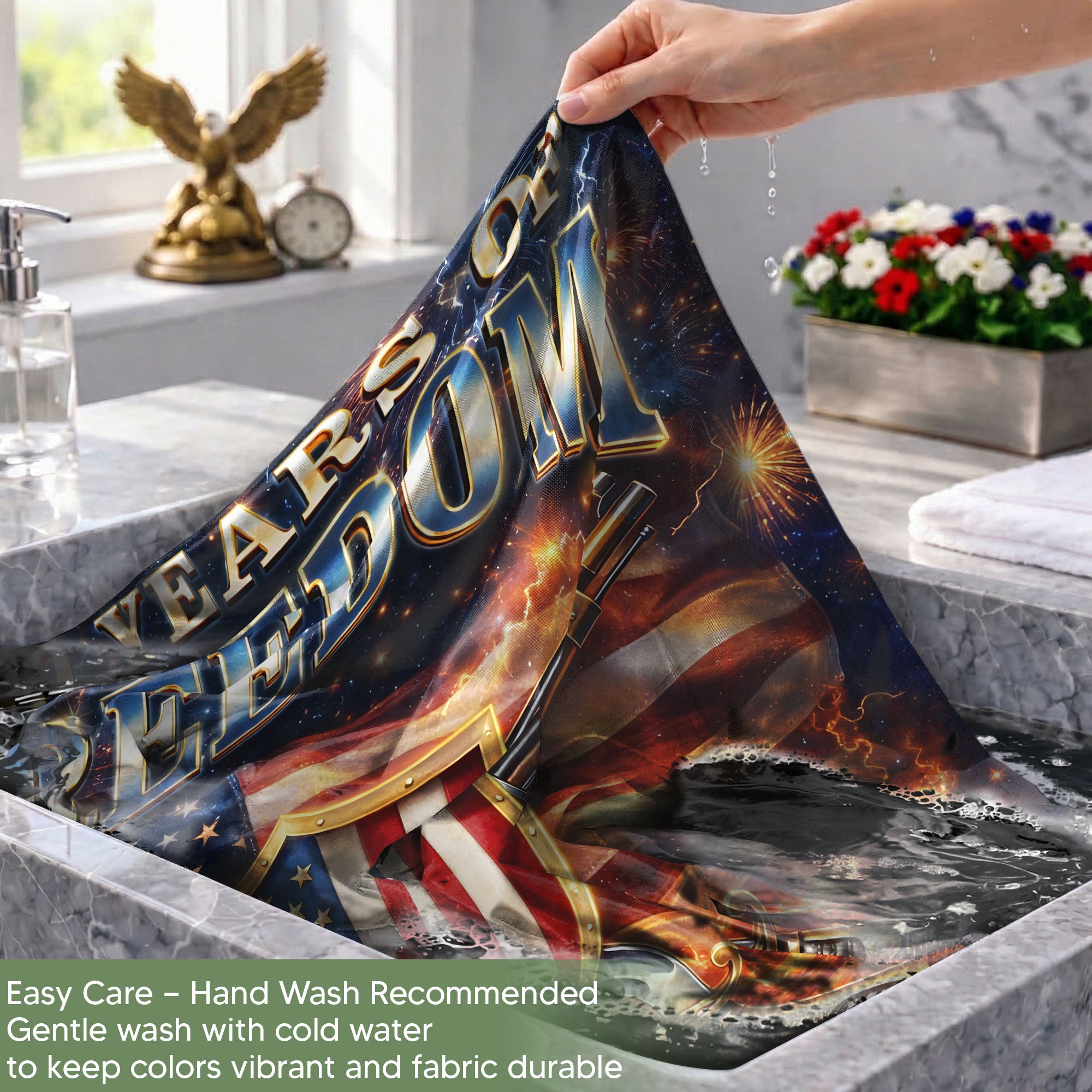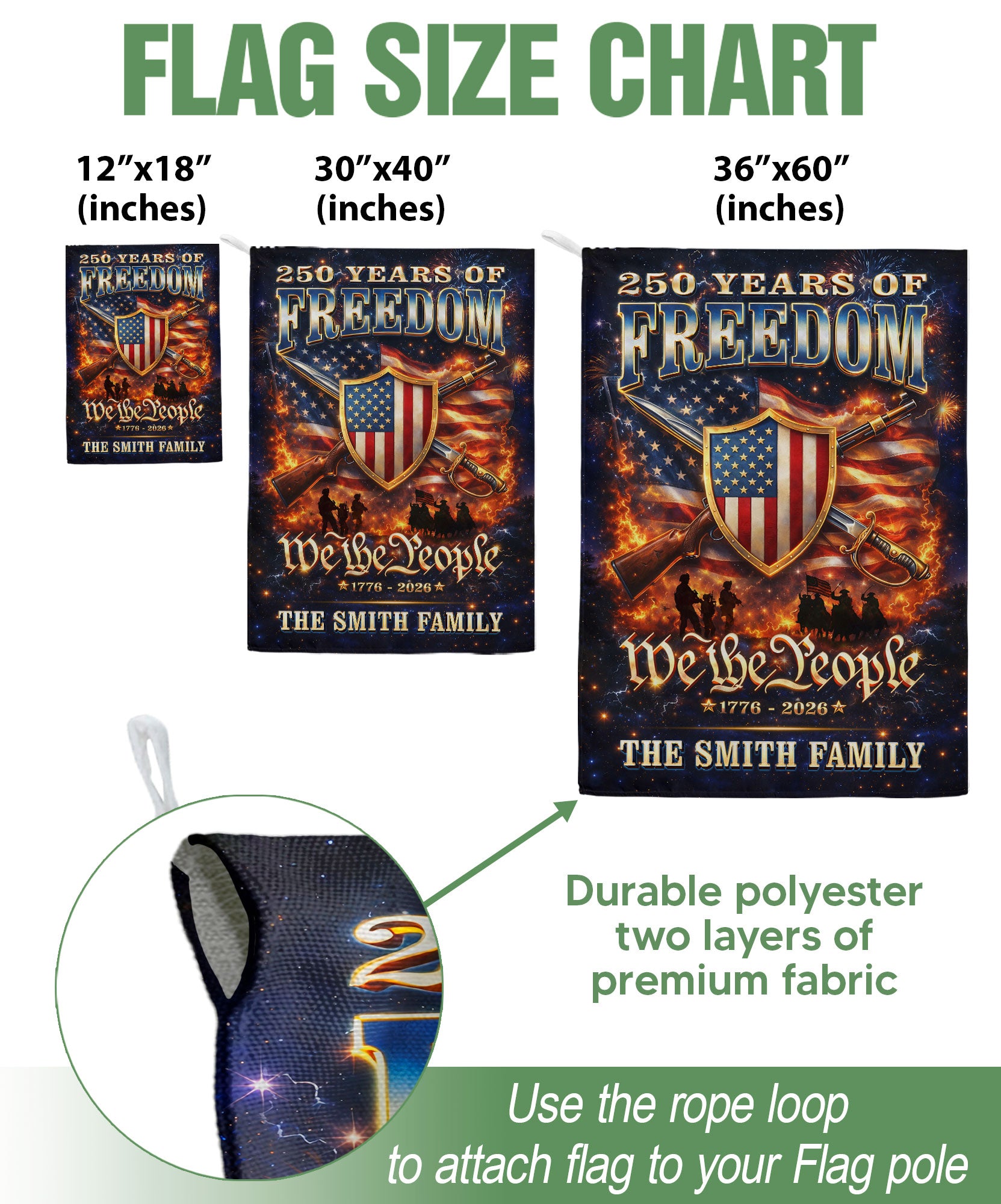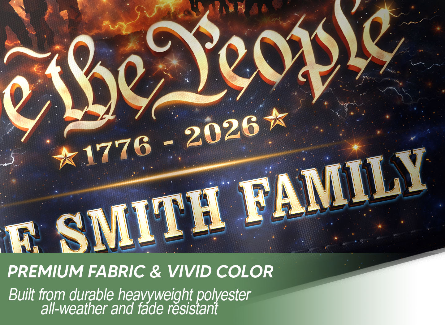 Celebrate America’s 250th anniversary of independence from 1776 to 2026 with this custom family name garden flag. Featuring a bold patriotic design with the American flag, ‘We The People’ message, and your personalized family name, this flag showcases national pride in your yard, porch, or garden. Crafted from durable, weather-resistant fabric, it withstands outdoor elements for long-lasting display. Vibrant colors and high-quality printing ensure it stands out year-round, perfect for Fourth of July, Memorial Day, or everyday patriotism. Easy to hang with a standard garden flag pole (not included). Personalize it with your family name for a unique touch.