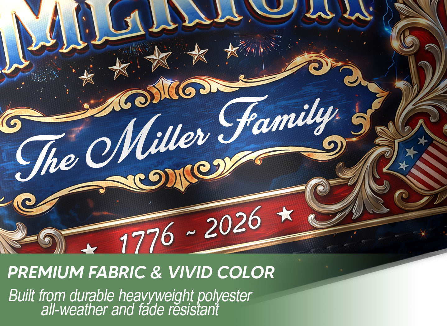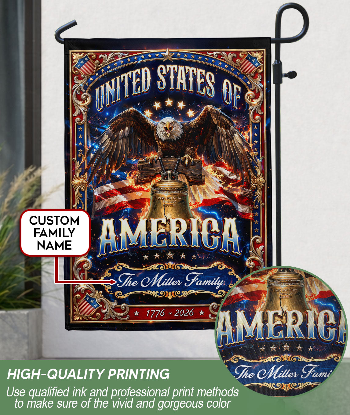 Celebrate American heritage and freedom with this custom garden flag featuring a majestic eagle perched on the iconic Liberty Bell, bold United States of America text, and 1776-2026 semiquincentennial design. Personalize it with your family name for a unique touch that showcases your pride. Crafted from high-quality, durable, weather-resistant fabric, this flag withstands outdoor elements for year-round display in gardens, porches, yards, or patios. Perfect for patriotic holidays like Fourth of July, Memorial Day, or everyday display to honor national history and family legacy.