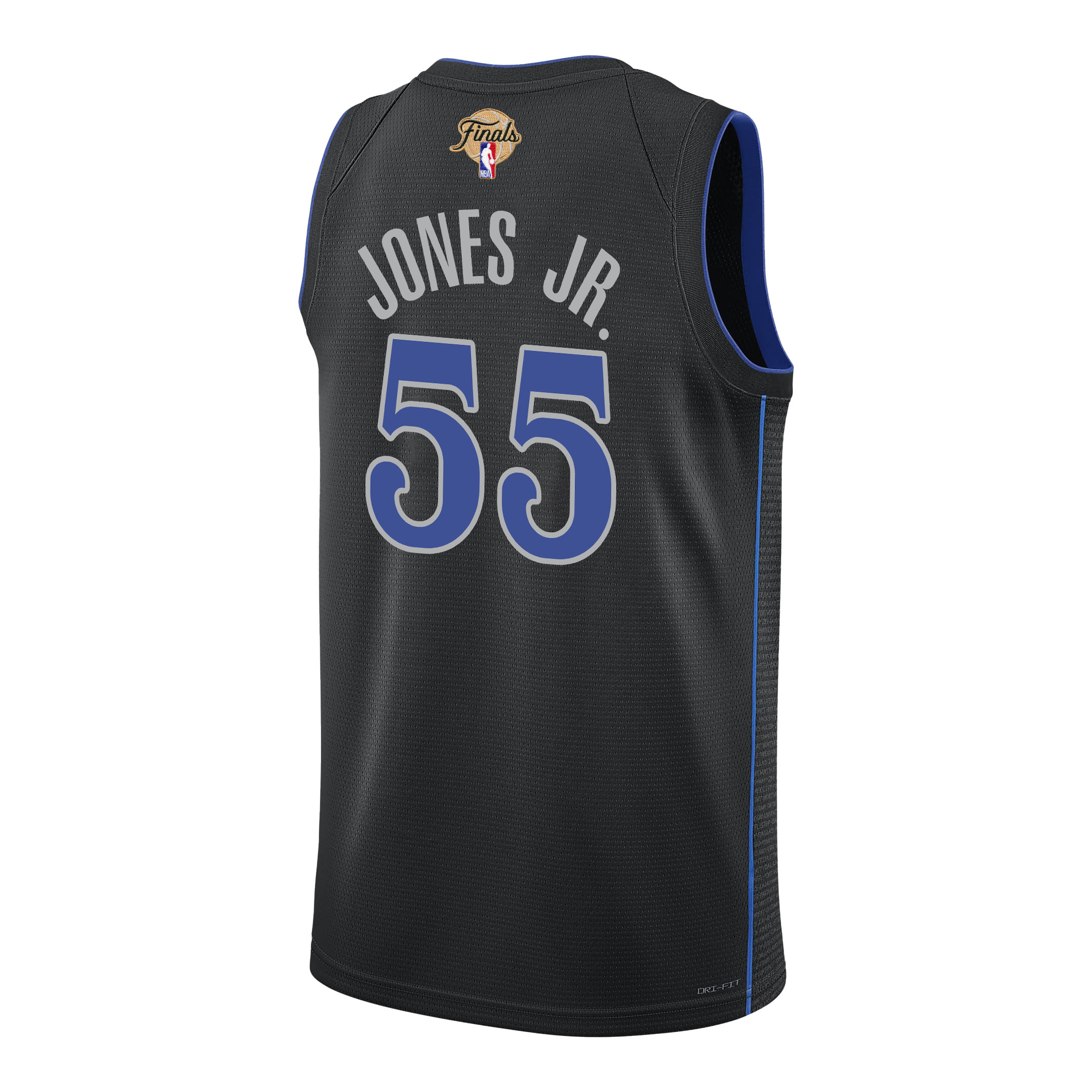 Elevate your fan gear with the Derrick Jones Jr. #55 Dallas Mavericks 2024 Finals Patch Swingman Jersey in City Edition Black. This unisex jersey is crafted from 100% polyester for lightweight, breathable comfort, perfect for game days, training sessions, casual wear, or showing team pride. The classic fit and clean design feature the iconic Finals patch, player name, number, and Mavericks City Edition styling. Durable construction ensures it holds up to everyday use while keeping you cool and dry. Available in adult sizes S-3XL. Ideal for basketball enthusiasts seeking authentic-inspired style without official affiliation.