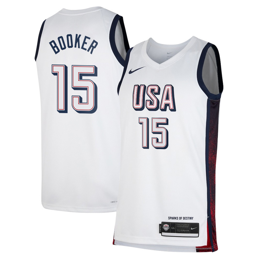 Elevate your game-day look or training sessions with the Devin Booker 15 Men’s USA Basketball Unisex 2024 Swingman Player Jersey in white multicolor. Crafted from 100% polyester, this lightweight and breathable fabric ensures optimal comfort and airflow, keeping you cool during intense workouts, casual outings, or fan-inspired outfits. The classic fit offers versatility for everyday wear, pairing seamlessly with shorts, jeans, or athletic gear. Featuring the iconic Swingman design with player number 15 and USA Basketball graphics, it’s perfect for basketball enthusiasts, Olympic fans, or anyone seeking durable athletic apparel. Available in adult sizes S-3XL. New condition, unisex sizing for all.