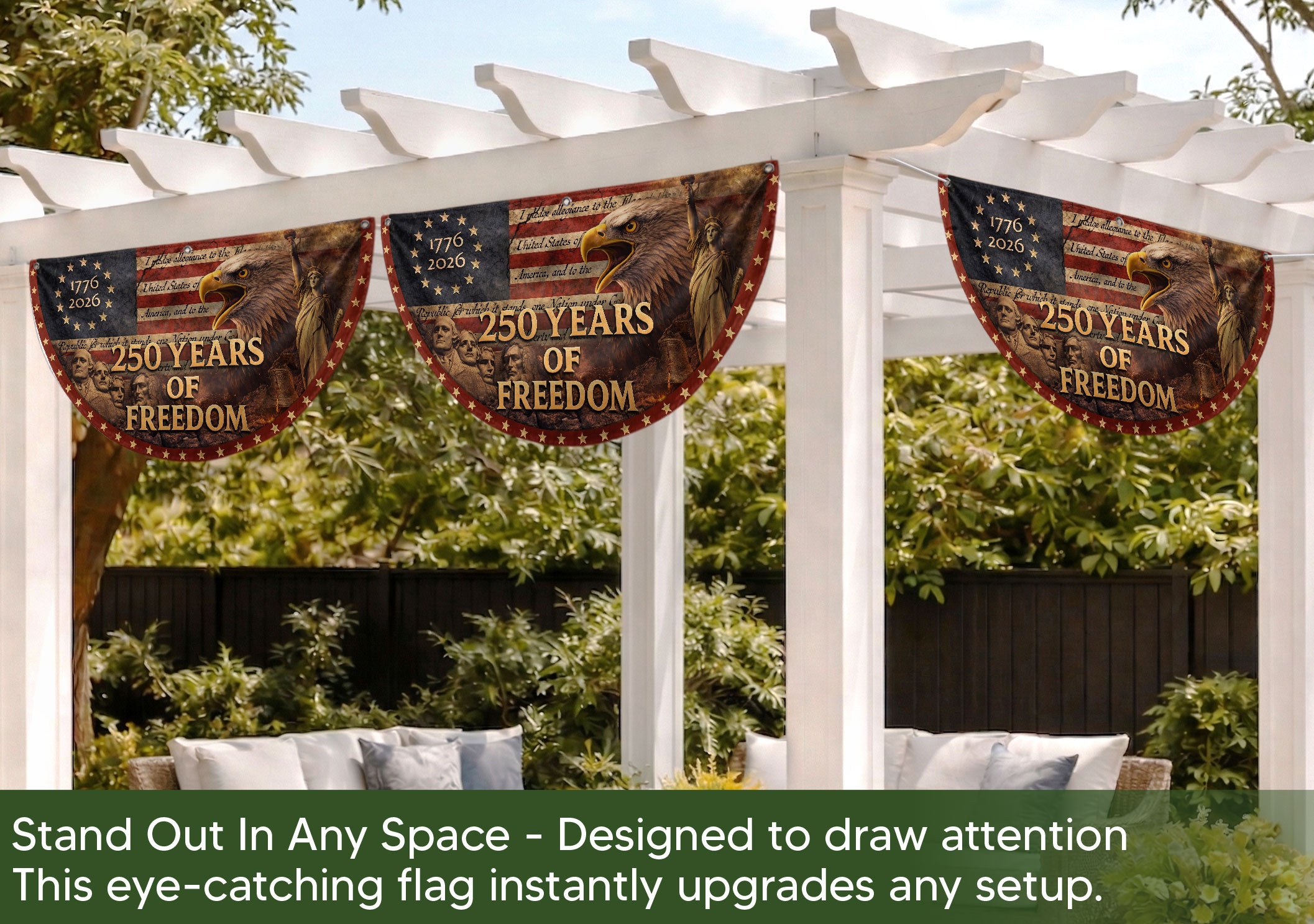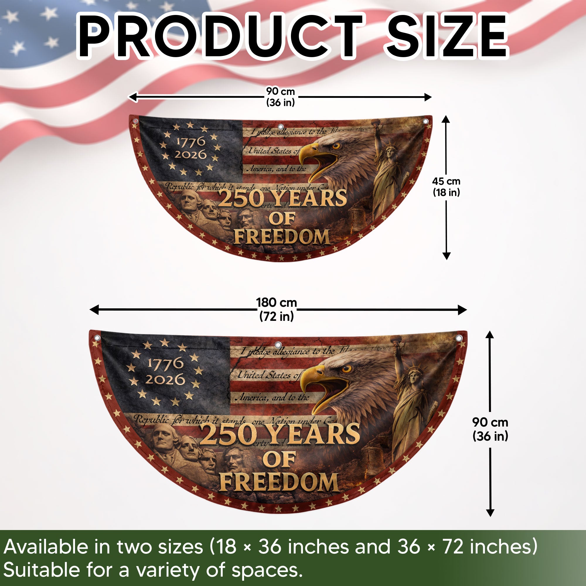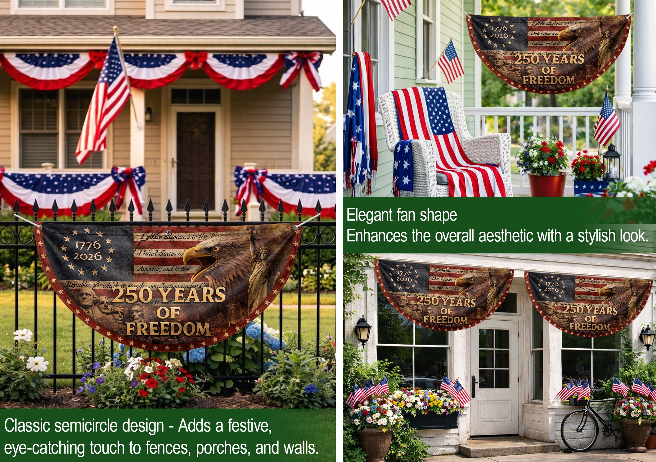 Celebrate America’s 250th anniversary with this striking Fence Flag featuring the USA Flag design spanning 1776-2026. Crafted for durability and vibrant display, it showcases balanced colors and elegant styling that highlight the historic message of ‘250 Years of Freedom.’ Perfect for front door decoration, yard displays, or patriotic events, this American Freedom Banner creates a warm, welcoming vibe and honors national pride. Easy to attach to fences, porches, or railings, it’s ideal for Independence Day celebrations, historical commemorations, or everyday displays of patriotism. Made with high-quality materials to withstand outdoor conditions while maintaining sharp details and fade-resistant colors.