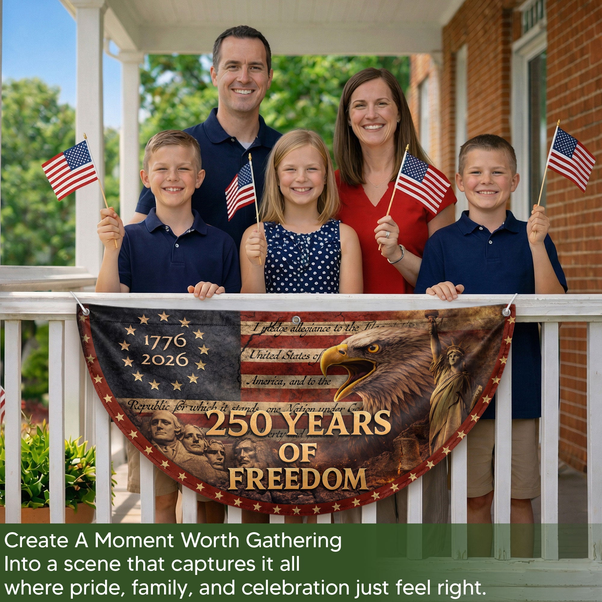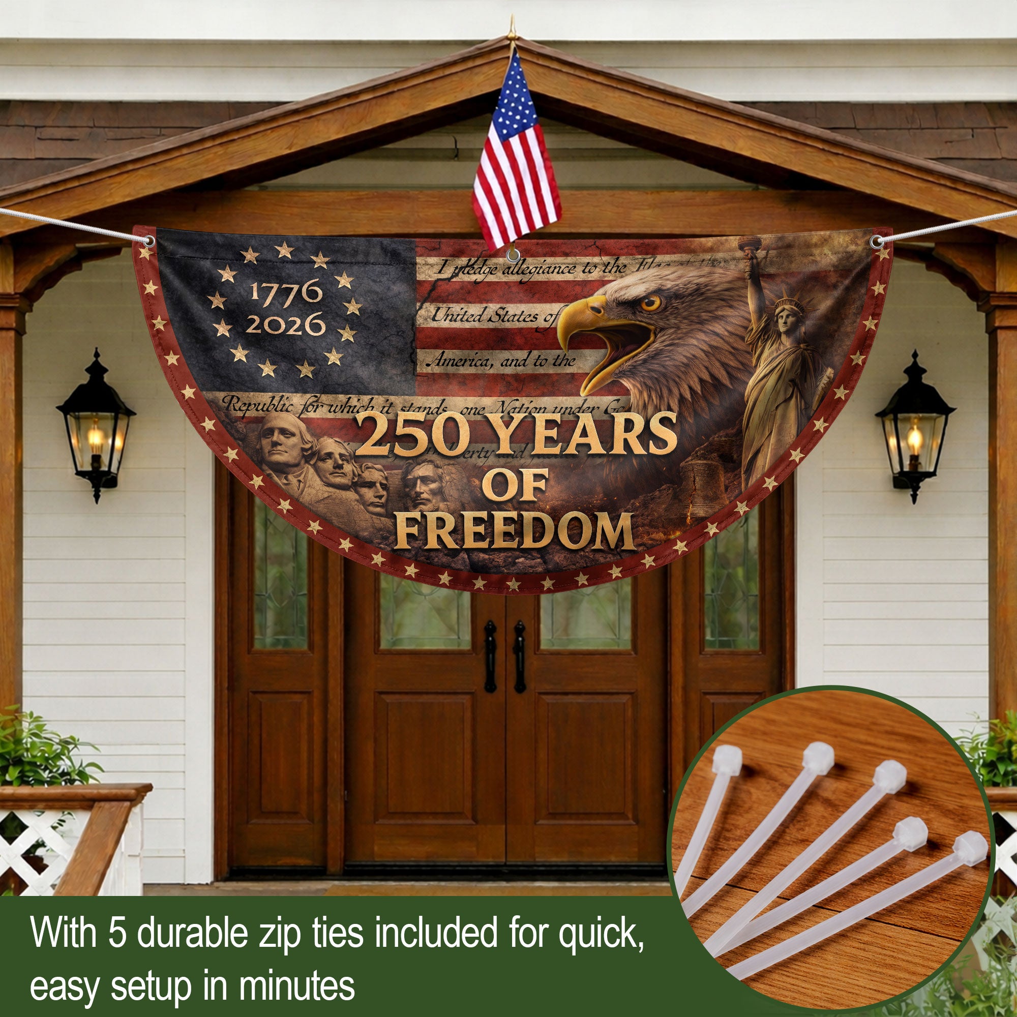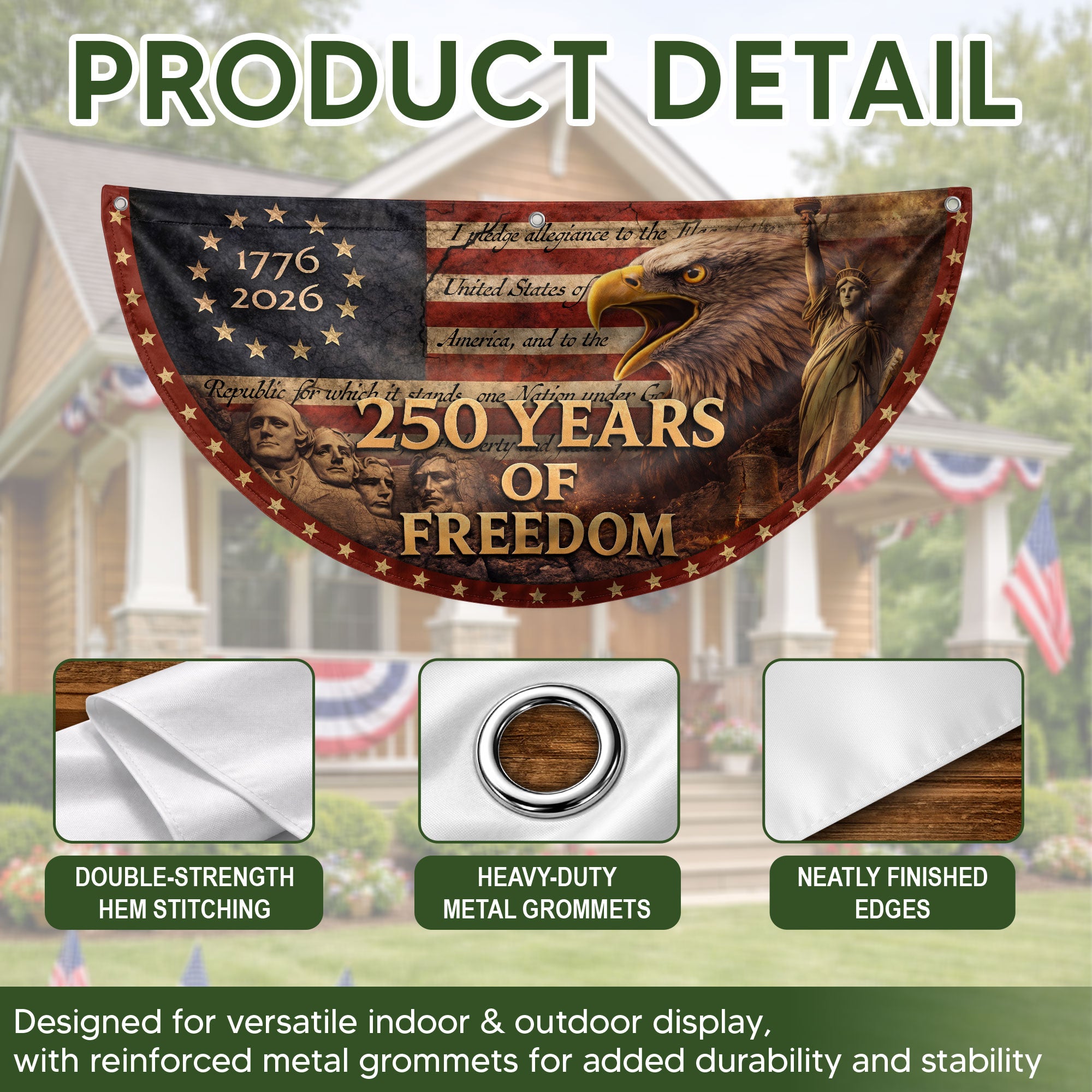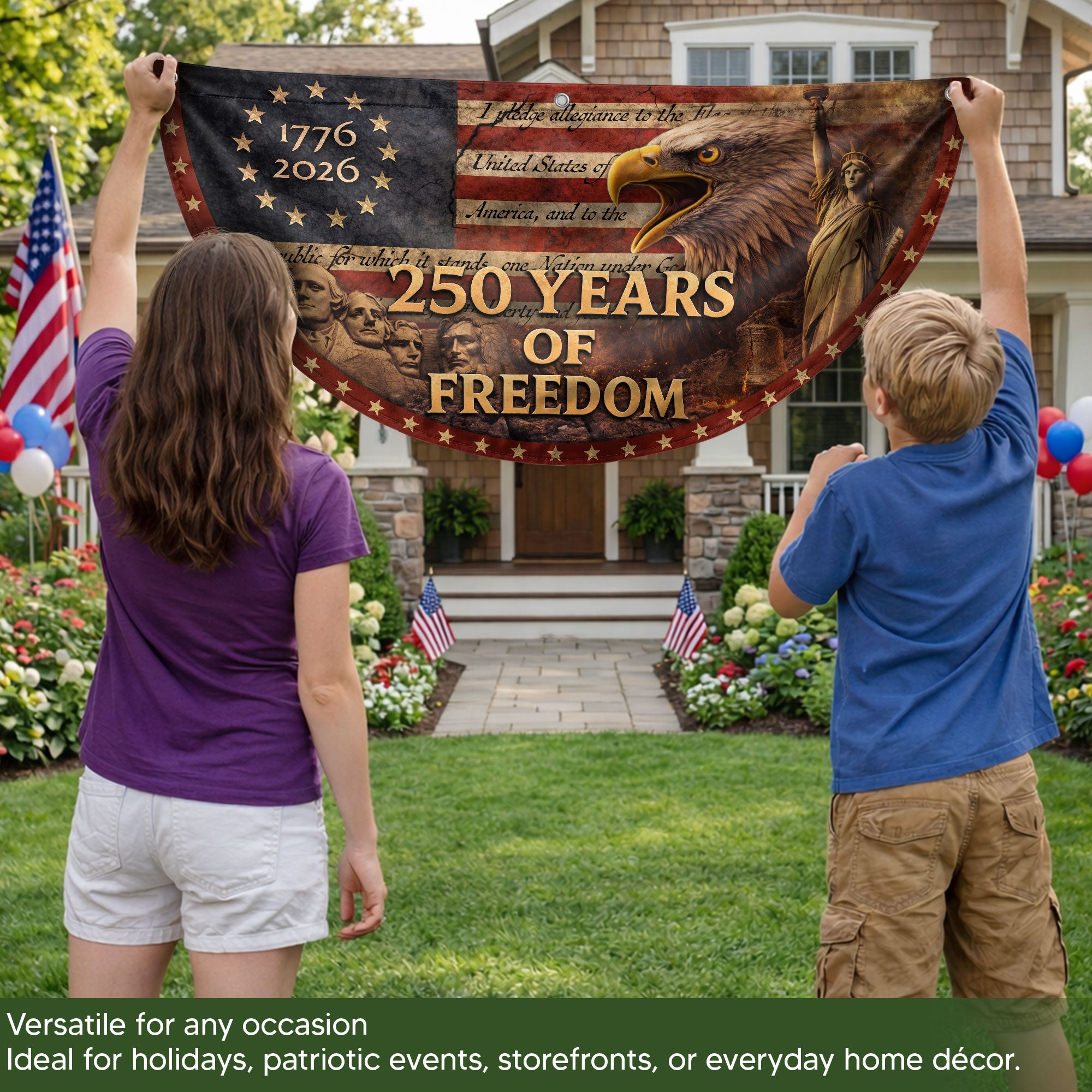 Celebrate America’s 250th anniversary with this striking Fence Flag featuring the USA Flag design spanning 1776-2026. Crafted for durability and vibrant display, it showcases balanced colors and elegant styling that highlight the historic message of ‘250 Years of Freedom.’ Perfect for front door decoration, yard displays, or patriotic events, this American Freedom Banner creates a warm, welcoming vibe and honors national pride. Easy to attach to fences, porches, or railings, it’s ideal for Independence Day celebrations, historical commemorations, or everyday displays of patriotism. Made with high-quality materials to withstand outdoor conditions while maintaining sharp details and fade-resistant colors.