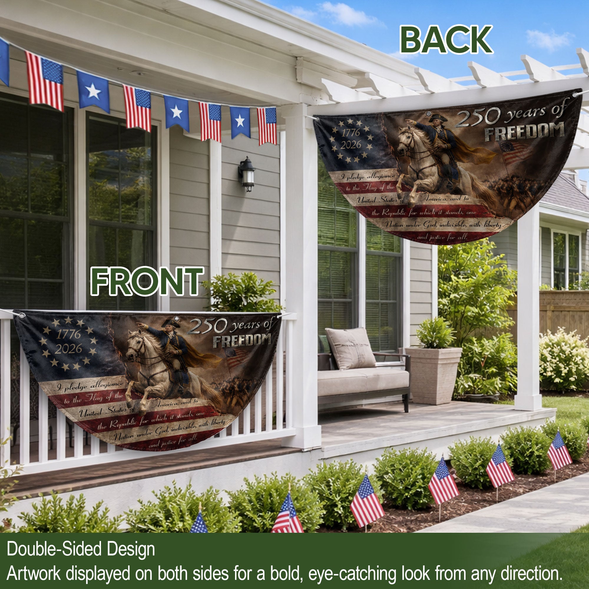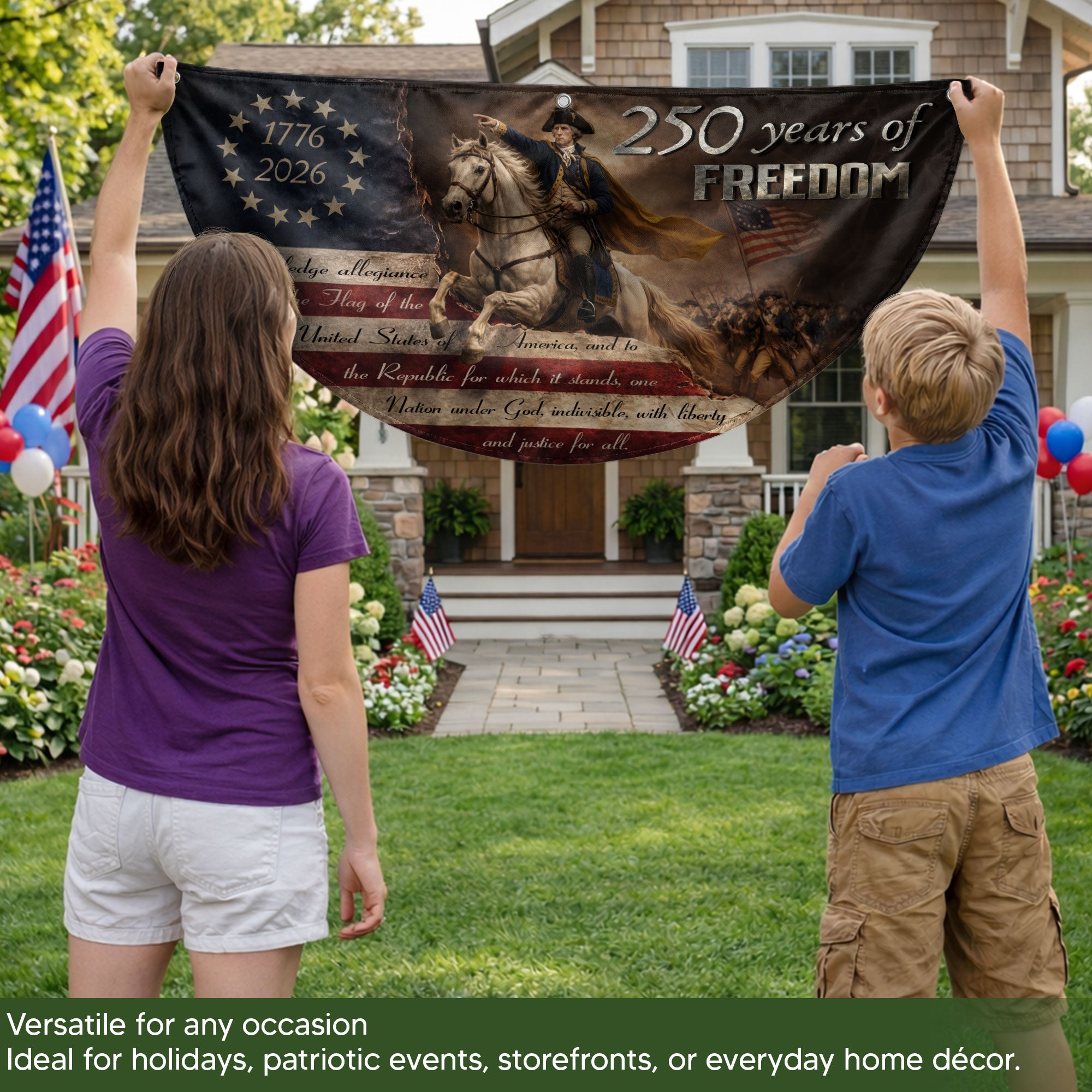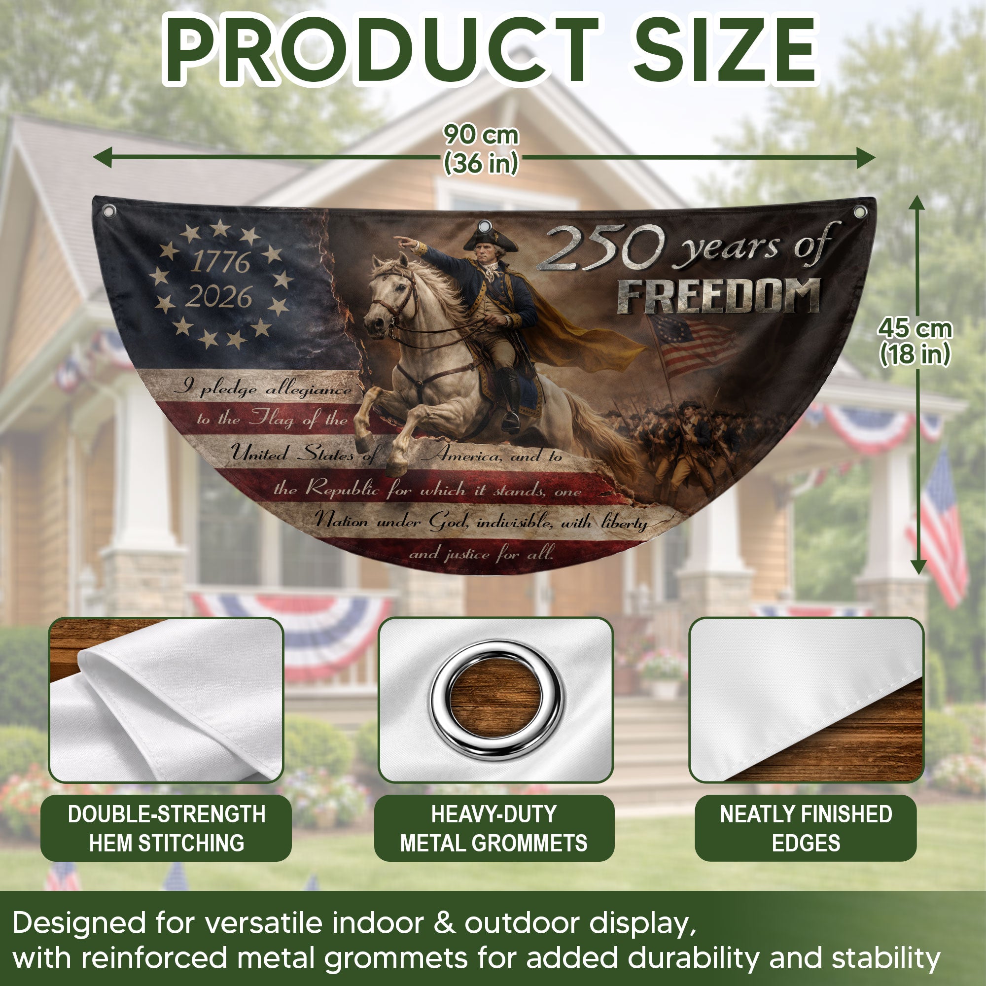 Celebrate America’s 250th anniversary with this durable fence flag featuring George Washington leading the Continental Army. The design includes 13 stars representing the original colonies, the full Pledge of Allegiance, and the bold inscription ‘250 Years of Freedom’ spanning 1776-2026. Crafted for outdoor use, this patriotic banner is weather-resistant and perfect for fences, porches, or gardens. Display your pride in American heritage and independence during holidays, parades, or everyday. Easy to hang with reinforced edges and grommets for secure attachment. A timeless tribute to the nation’s founding.