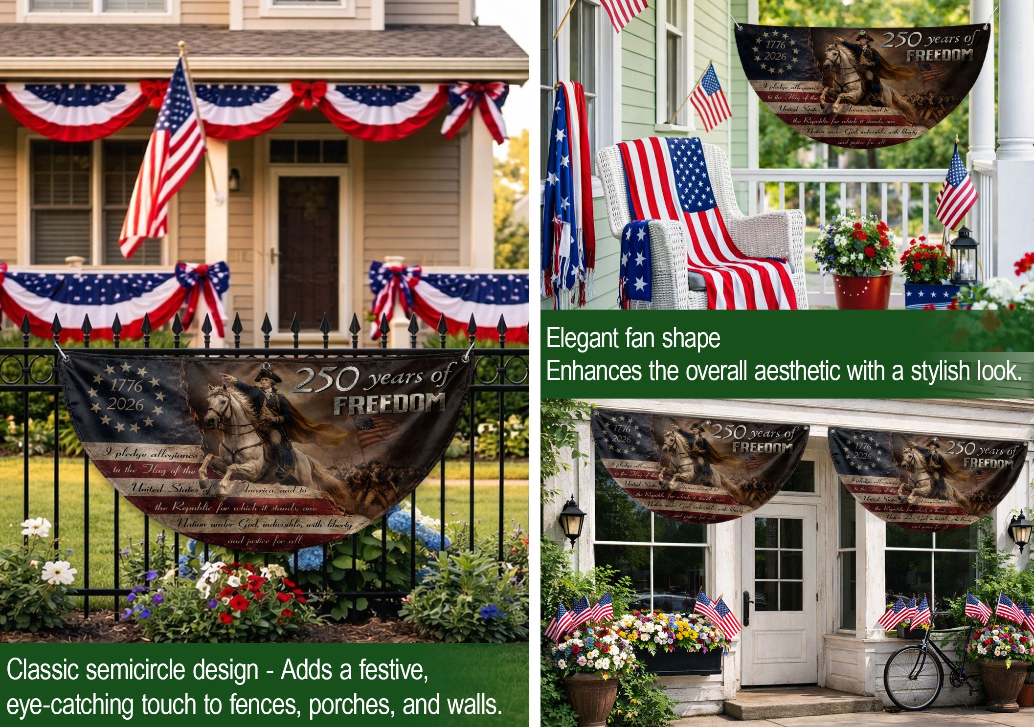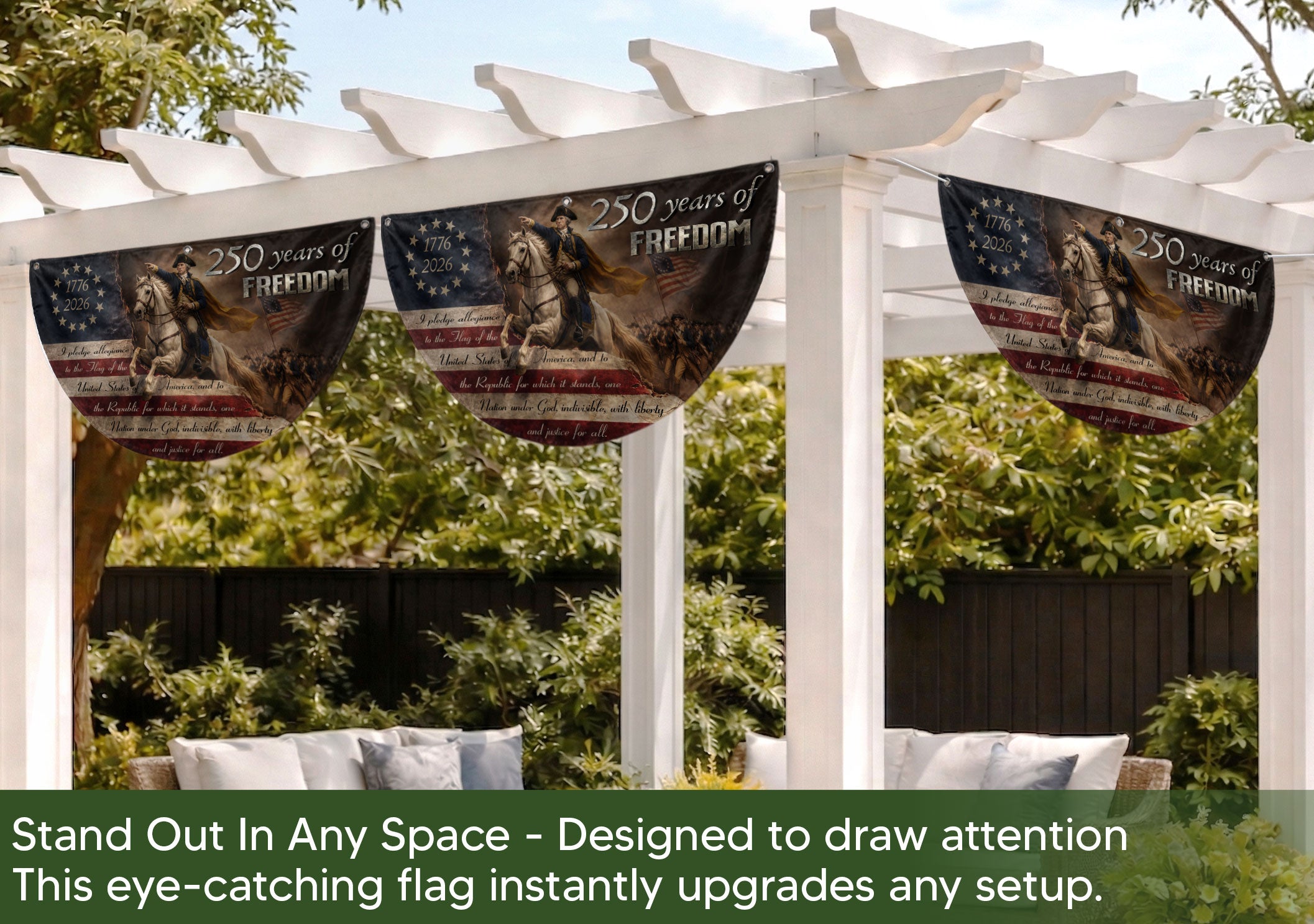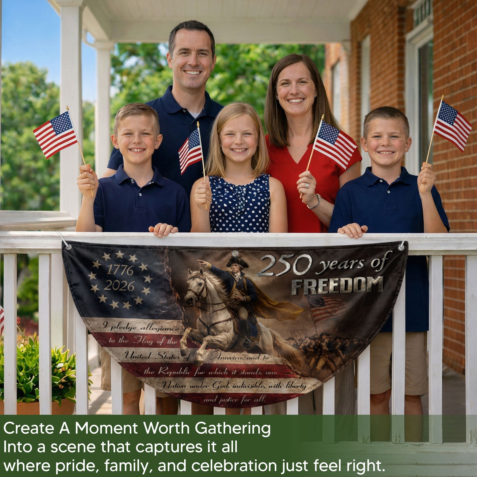 Celebrate America’s 250th anniversary with this durable fence flag featuring George Washington leading the Continental Army. The design includes 13 stars representing the original colonies, the full Pledge of Allegiance, and the bold inscription ‘250 Years of Freedom’ spanning 1776-2026. Crafted for outdoor use, this patriotic banner is weather-resistant and perfect for fences, porches, or gardens. Display your pride in American heritage and independence during holidays, parades, or everyday. Easy to hang with reinforced edges and grommets for secure attachment. A timeless tribute to the nation’s founding.