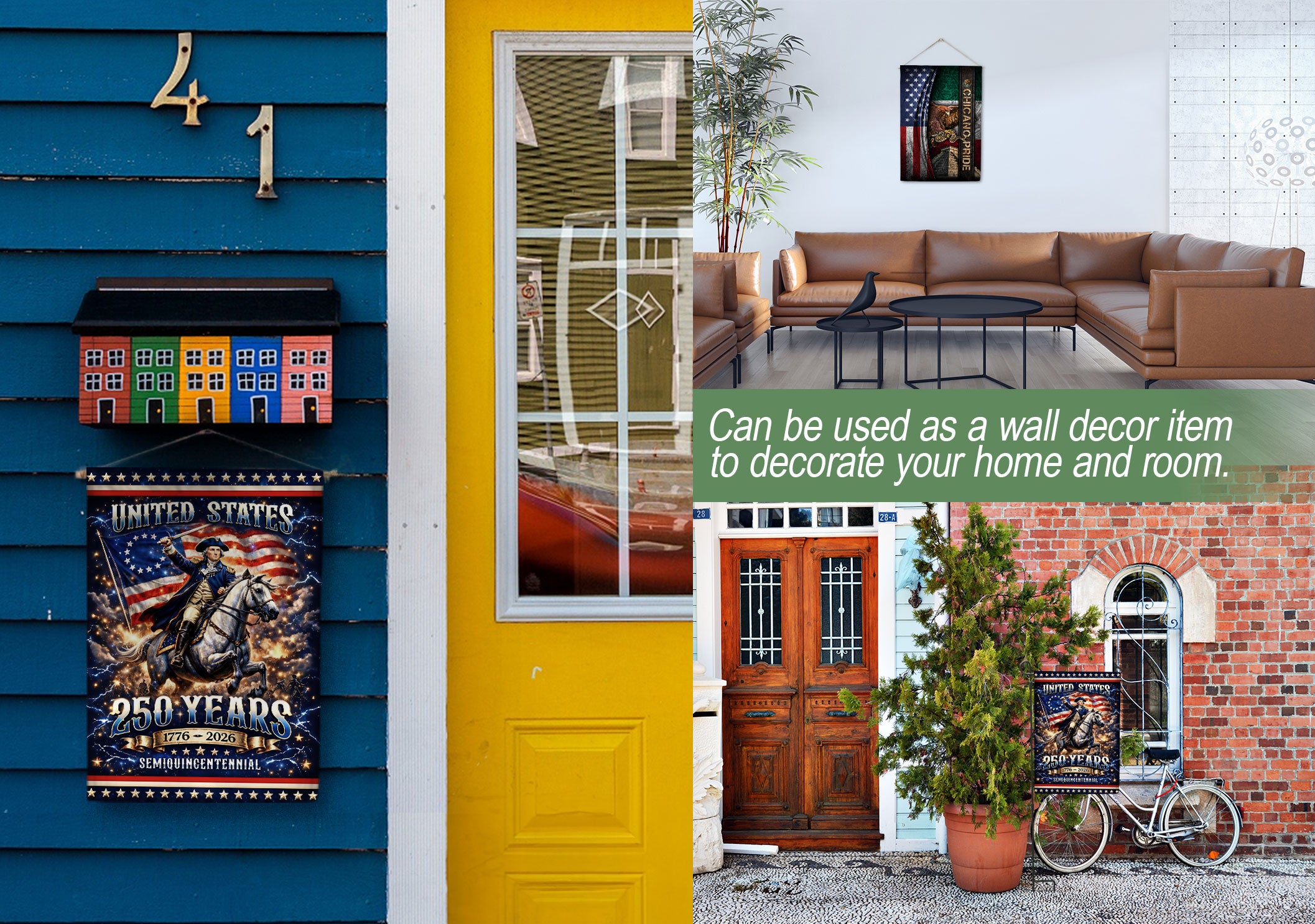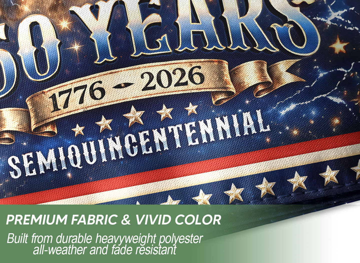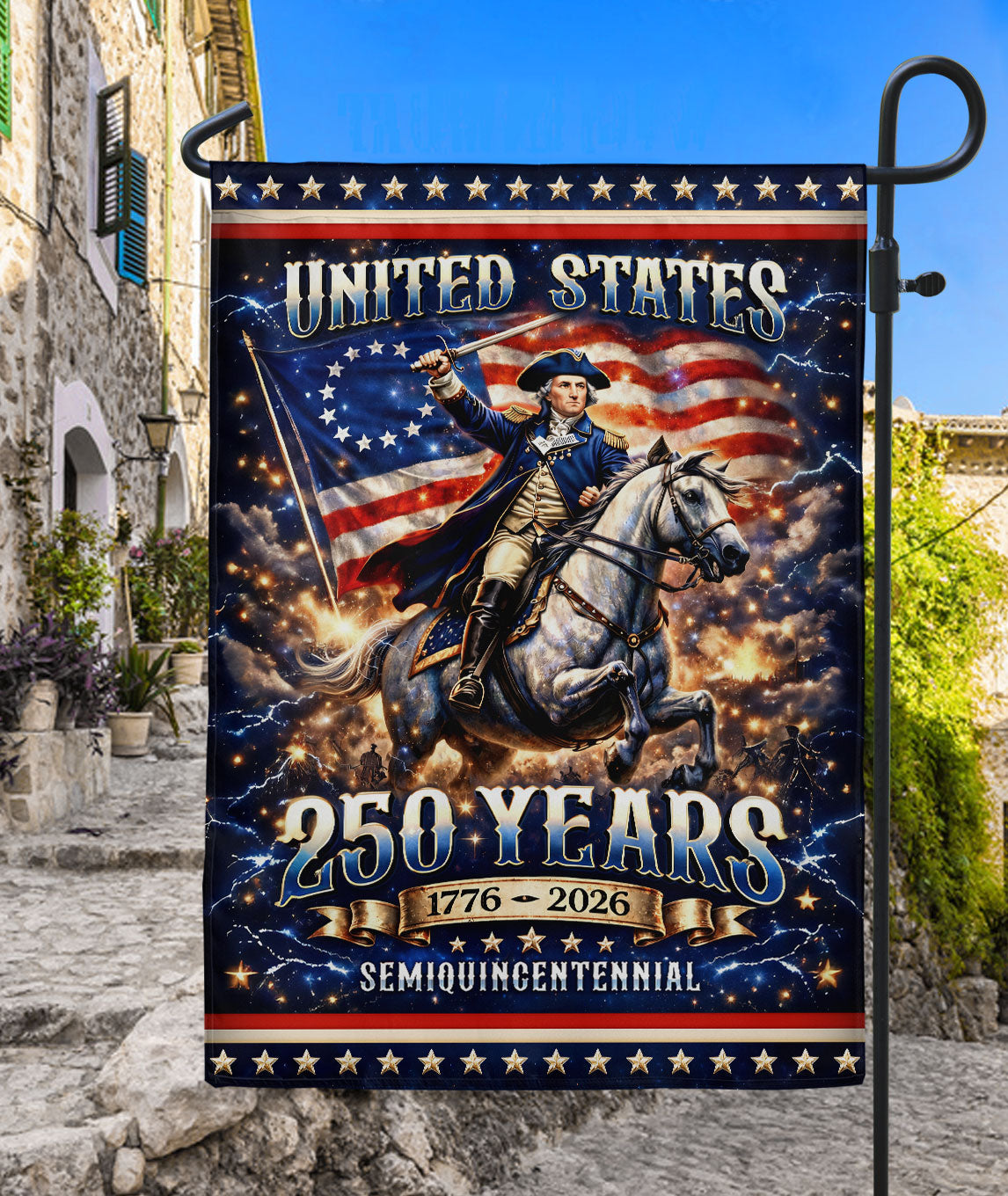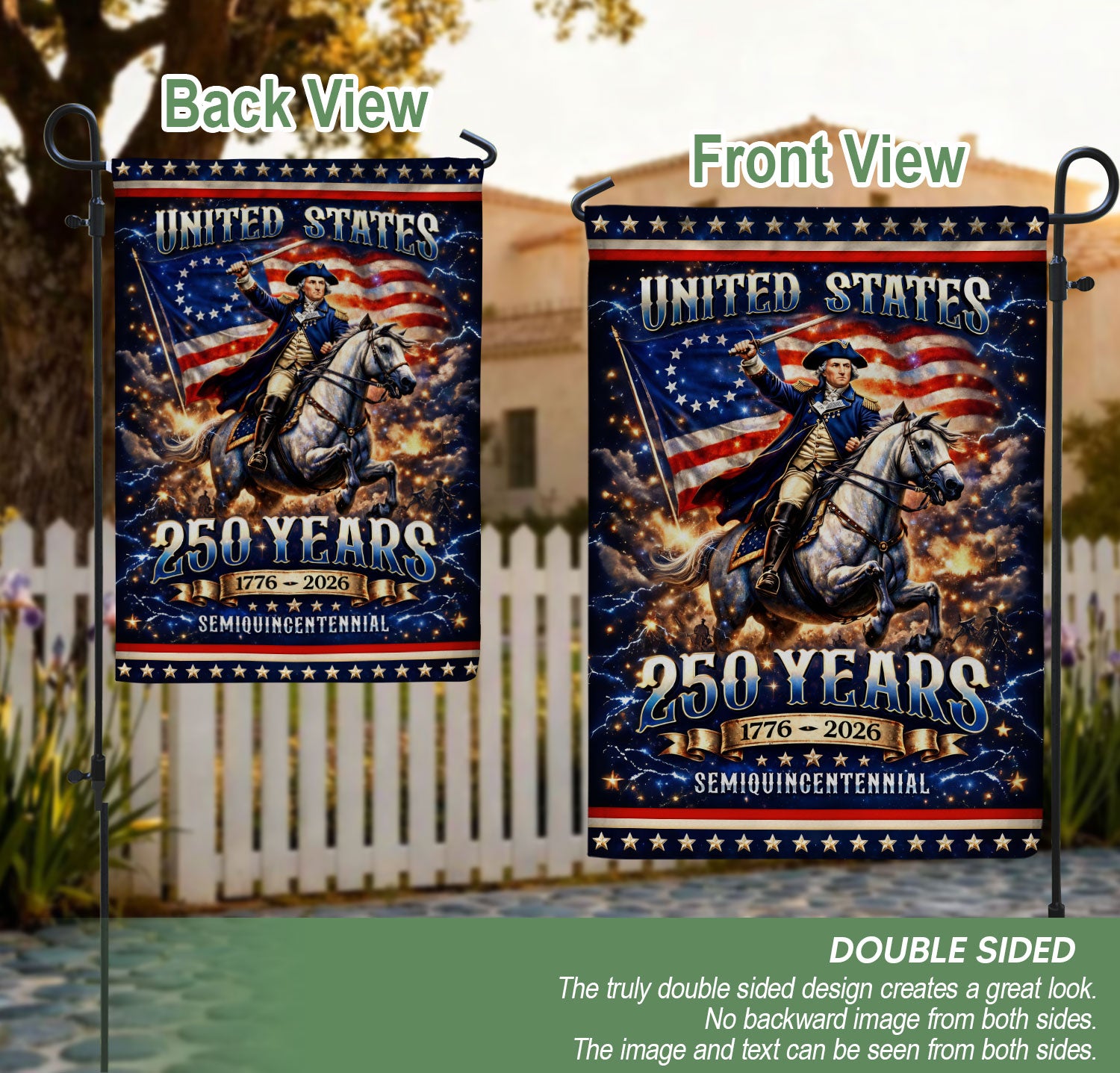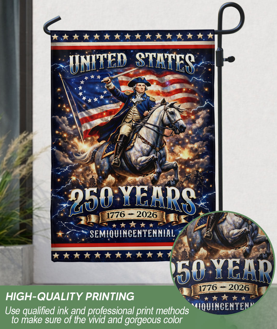 Celebrate the 250th anniversary of the United States from 1776 to 2026 with this striking double-sided house flag featuring George Washington as the Revolutionary War general on horseback. Crafted for outdoor durability, this flag honors the leadership, courage, and sacrifice that shaped the nation during the American Revolution. Perfect for displaying on your porch, garden flagpole, or home entrance to showcase patriotic pride. The high-quality, weather-resistant fabric ensures vibrant colors and clear details on both sides, making it ideal for holidays, historical commemorations, or everyday American heritage displays. Easy to hang and built to withstand the elements.