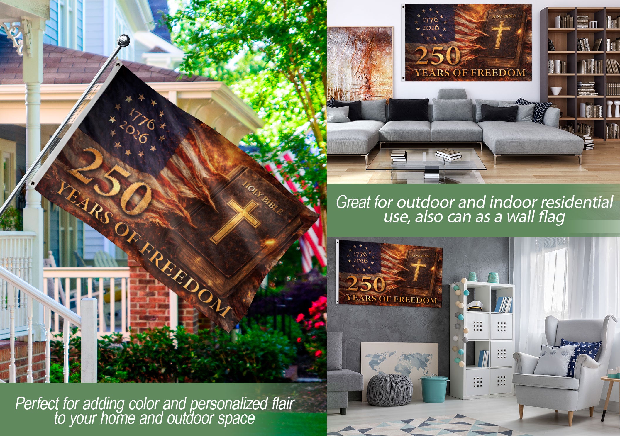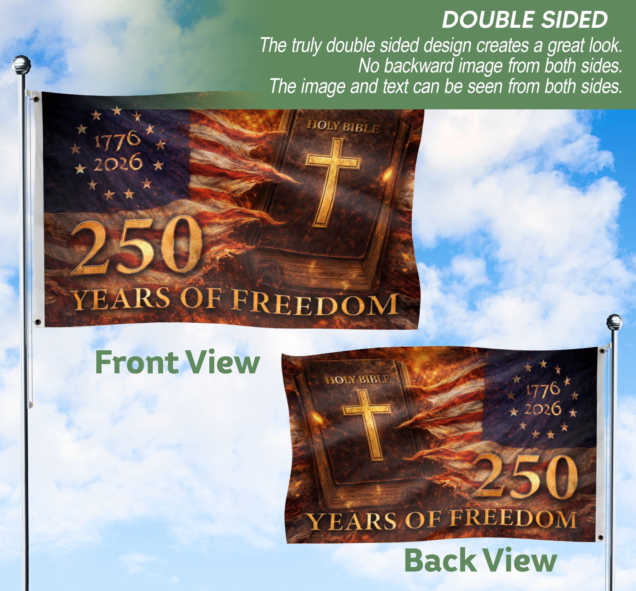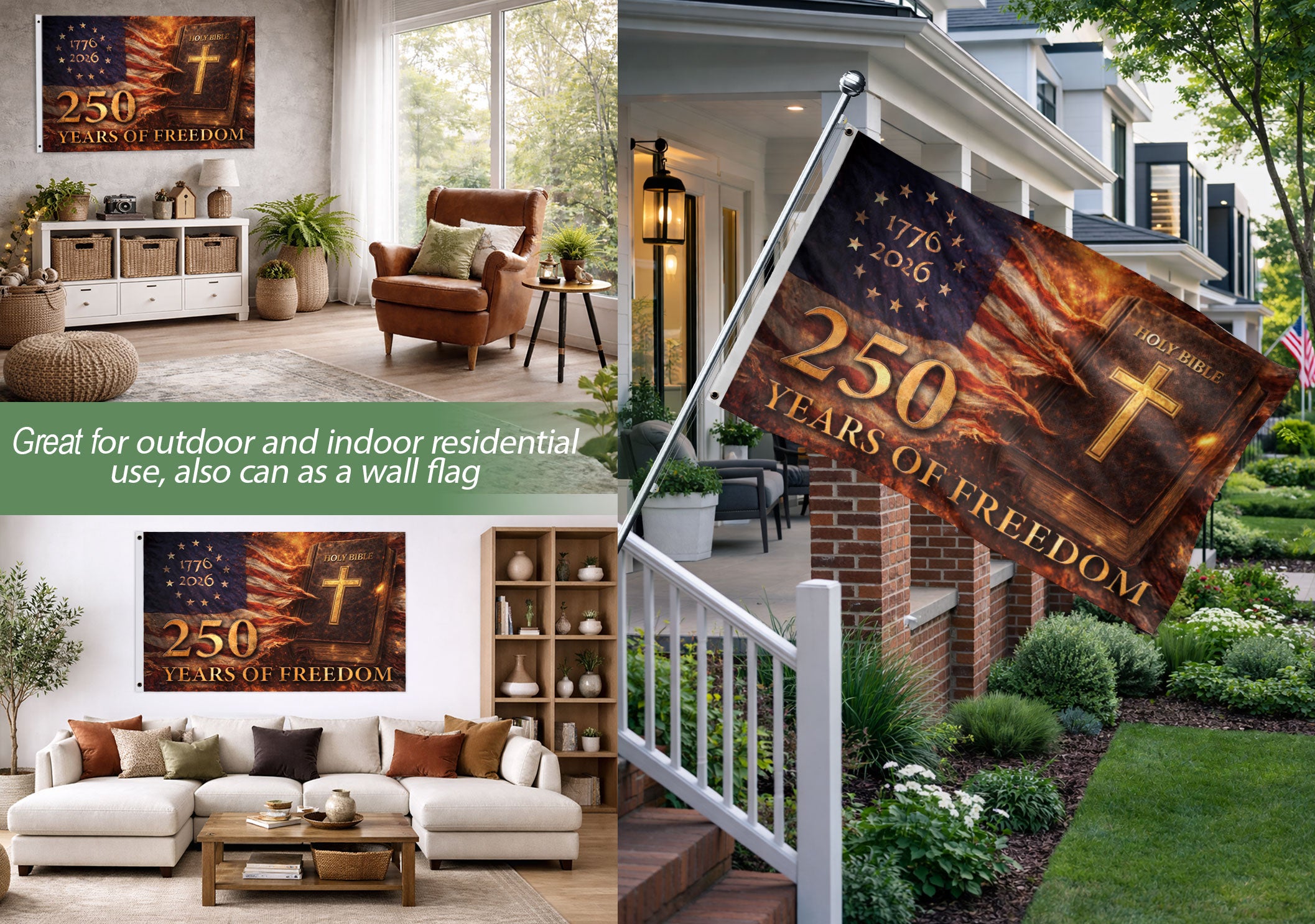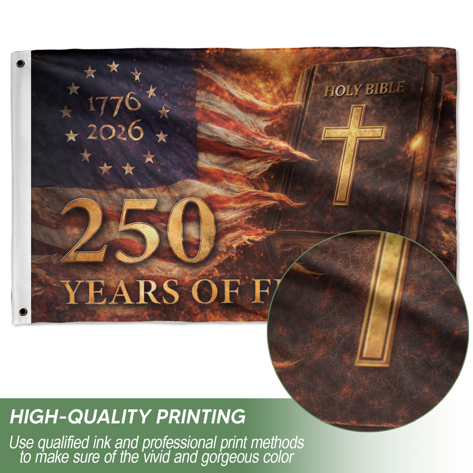 Celebrate 250 years of American freedom with this Holy Bible Christian house flag commemorating 1776-2026. The design showcases a weathered Holy Bible as the focal point, illuminated by a glowing golden cross. Patriotic stars and stripes form a dramatic backdrop, symbolizing ‘One Nation Under God.’ Perfect for displaying faith and national pride on porches, gardens, or homes during Independence Day, anniversaries, or everyday patriotism. Crafted for outdoor durability, this flag withstands weather while boldly proclaiming 250 years of liberty rooted in Christian values. Ideal for patriots, churches, and history enthusiasts seeking meaningful decor.