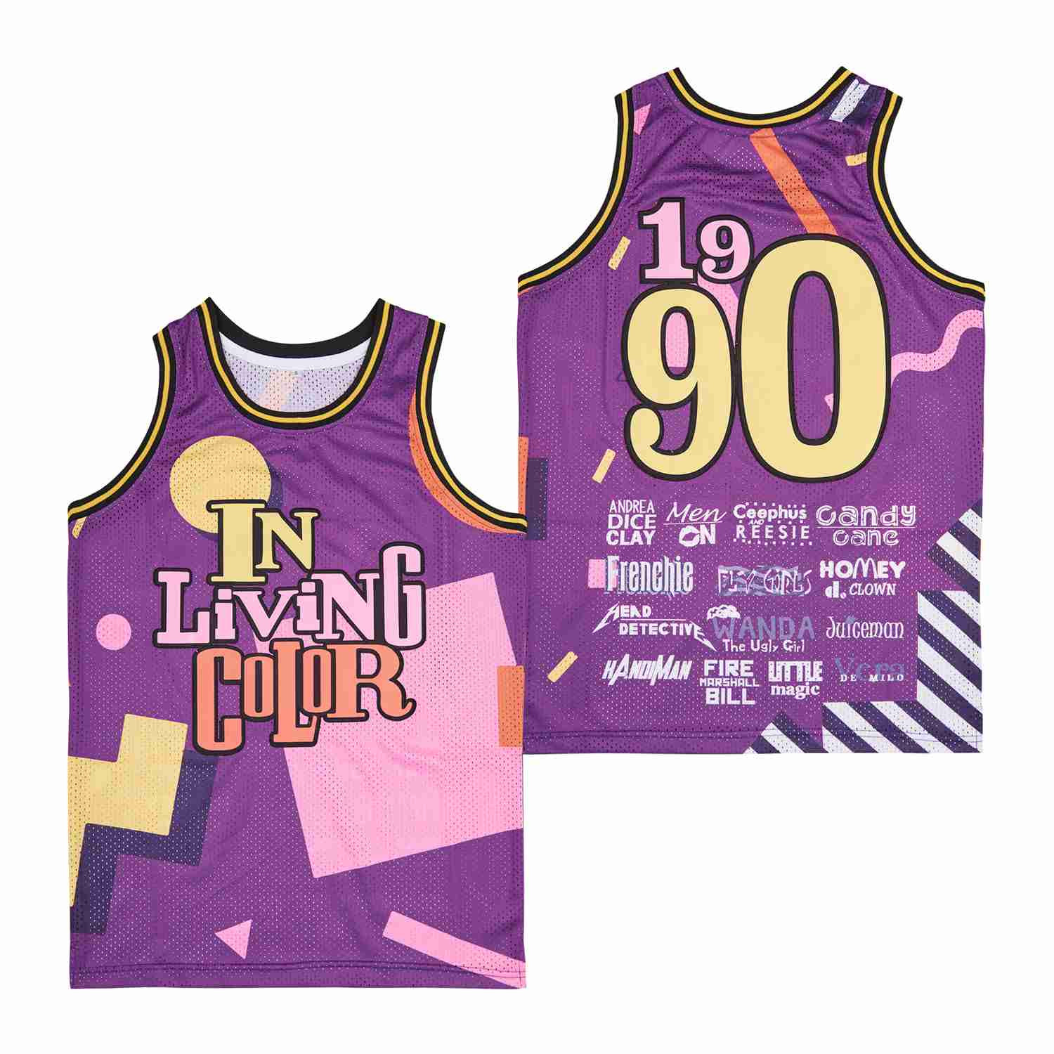 The In The Living Color 1990 Swingman Jersey in purple multicolor is a lightweight, breathable sports jersey perfect for fans, athletes, and casual wear. Crafted from 100% polyester, it offers superior comfort, durability, and moisture-wicking properties to keep you cool during workouts, training sessions, or everyday activities. The classic swingman fit provides a versatile silhouette that pairs easily with shorts, jeans, or athletic gear. Unisex design suits adults of all sizes from S to 3XL. Ideal for fan-inspired outfits, basketball enthusiasts, or anyone seeking stylish athletic apparel. New condition, not affiliated with any professional sports teams or leagues.