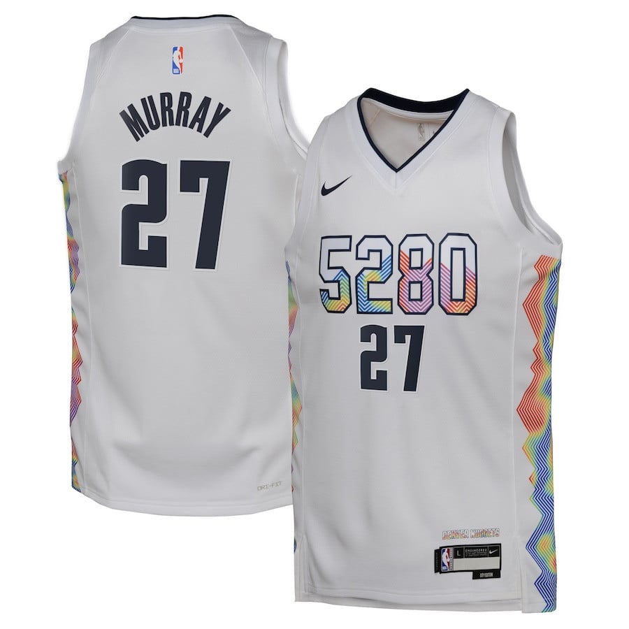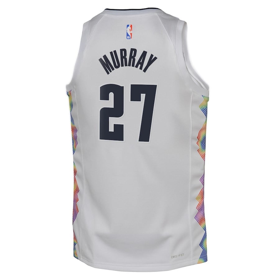 Show your Denver Nuggets fandom with this Jamal Murray #27 Youth Swingman Jersey from the 2024/25 City Edition collection. Featuring a crisp white design, this lightweight, breathable 100% polyester jersey ensures comfort during games, practices, or casual wear. The classic fit offers durability and style for young fans, making it perfect for cheering on the Nuggets or everyday athletic activities. Player name and number heat-pressed for long-lasting wear. Available in youth sizes S to 3XL. New condition, multicolor accents. Ideal for basketball enthusiasts seeking authentic-inspired fan gear.