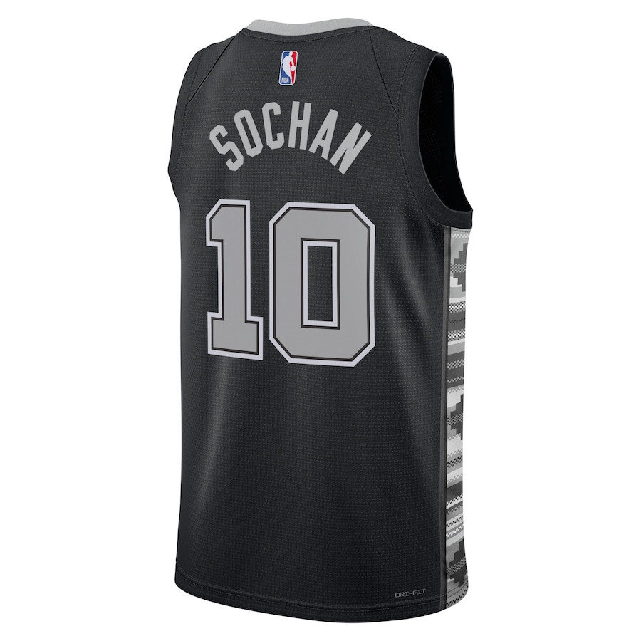 Elevate your fan gear with the Jeremy Sochan 10 San Antonio Spurs Unisex Swingman Jersey in Statement Edition Black. This lightweight, breathable sports jersey is crafted from 100% polyester for optimal comfort and durability during workouts, training sessions, or casual everyday wear. The classic fit and clean design feature bold team graphics, player name, and number, making it perfect for Spurs supporters. Suitable for adults in sizes S to 3XL, this unisex jersey offers a versatile style that pairs easily with shorts, jeans, or athletic wear. Stay cool and show your team pride with this high-quality, fan-inspired athletic apparel. New condition, multicolor accents on black base.