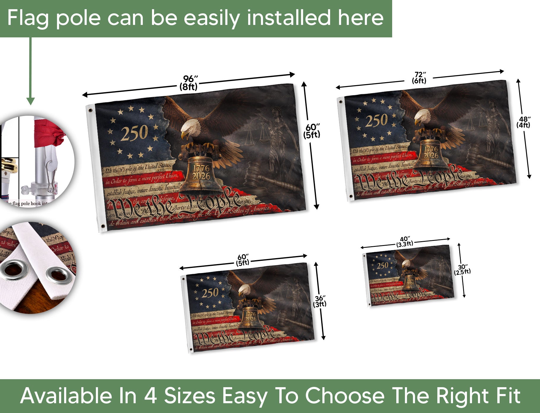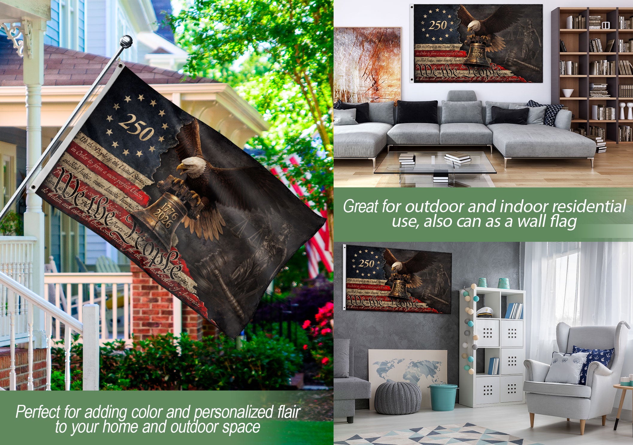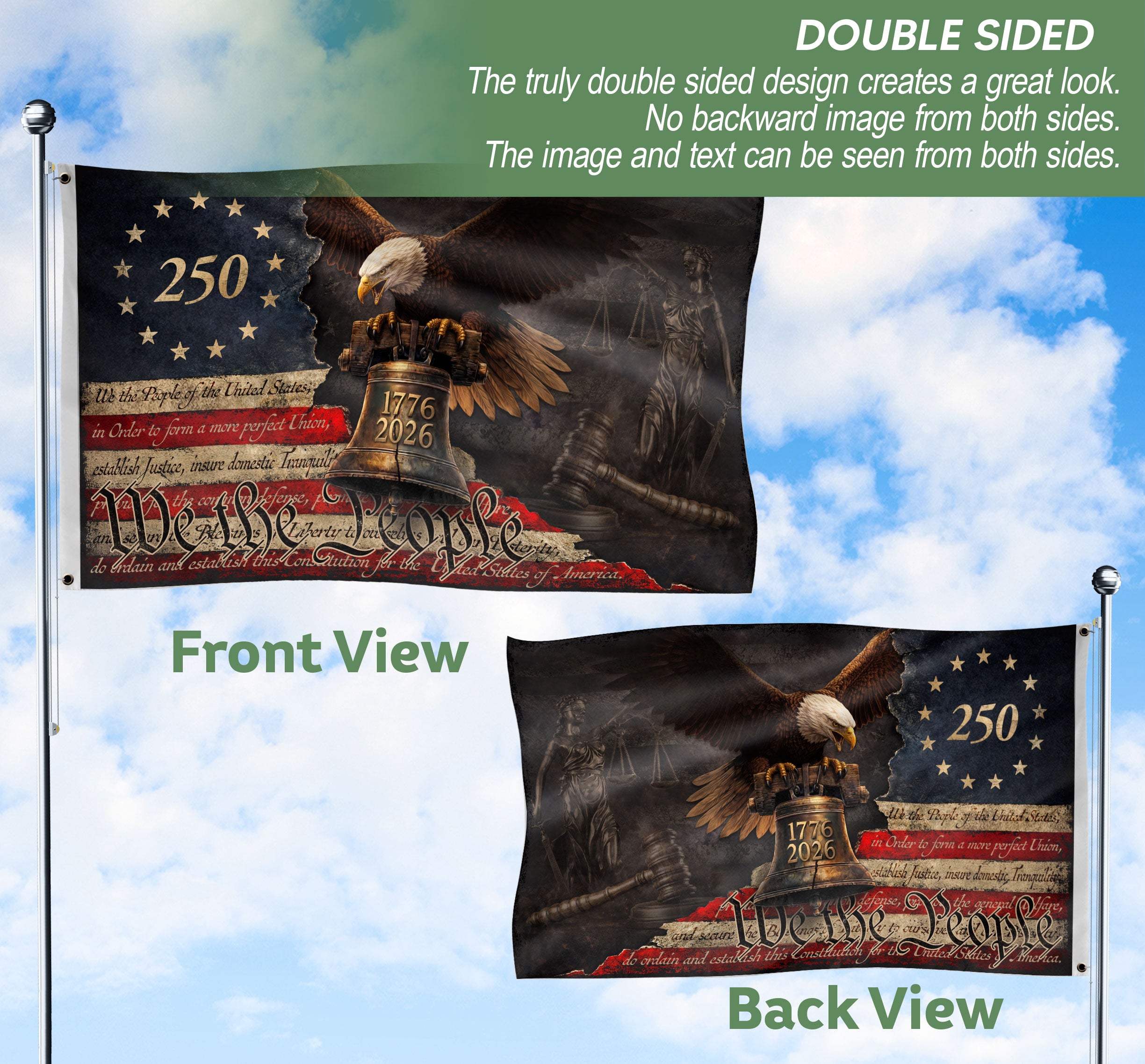 Celebrate 250 years of American freedom with this striking Justice Gavel Eagle House Flag. The design boldly features a majestic bald eagle, Lady Justice with her gavel, and the Statue of Liberty against a dramatic flag backdrop. Prominently displaying ‘We The People’ and the milestone years 1776-2026, this house flag serves as a powerful tribute to the United States’ enduring legacy of liberty and independence. Crafted for outdoor display, it’s perfect for patriotic holidays like the 4th of July, Memorial Day, or Veterans Day. Hang it on your porch, garage, or flagpole to showcase your pride in the land of the free. Durable construction ensures it withstands the elements while maintaining vibrant colors and sharp details. Ideal for history enthusiasts, patriots, and anyone honoring America’s 250th anniversary.