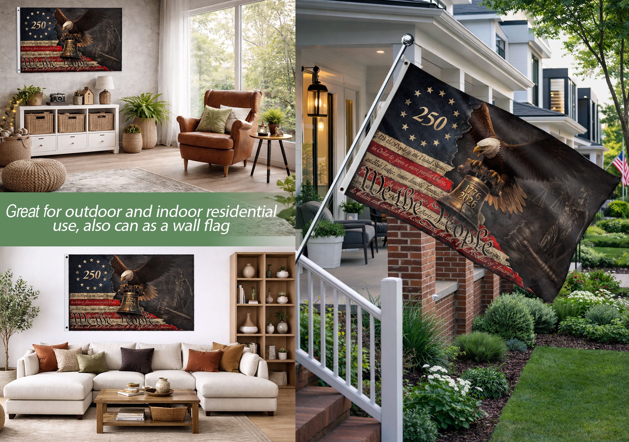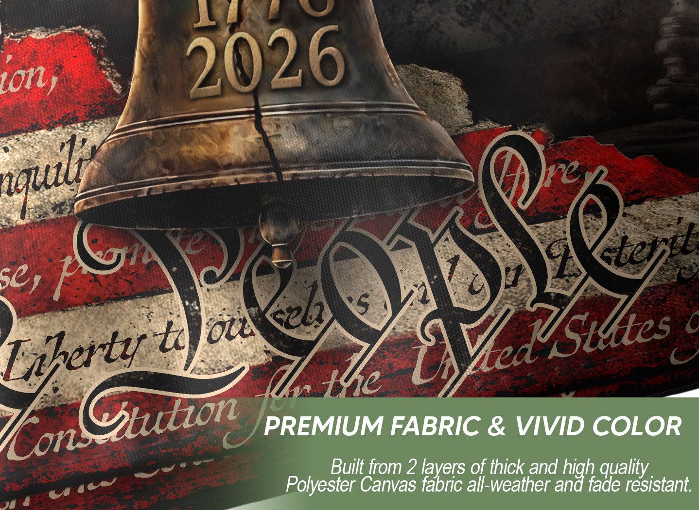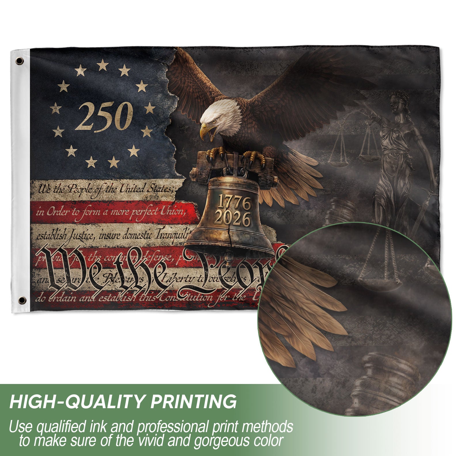 Celebrate 250 years of American freedom with this striking Justice Gavel Eagle House Flag. The design boldly features a majestic bald eagle, Lady Justice with her gavel, and the Statue of Liberty against a dramatic flag backdrop. Prominently displaying ‘We The People’ and the milestone years 1776-2026, this house flag serves as a powerful tribute to the United States’ enduring legacy of liberty and independence. Crafted for outdoor display, it’s perfect for patriotic holidays like the 4th of July, Memorial Day, or Veterans Day. Hang it on your porch, garage, or flagpole to showcase your pride in the land of the free. Durable construction ensures it withstands the elements while maintaining vibrant colors and sharp details. Ideal for history enthusiasts, patriots, and anyone honoring America’s 250th anniversary.