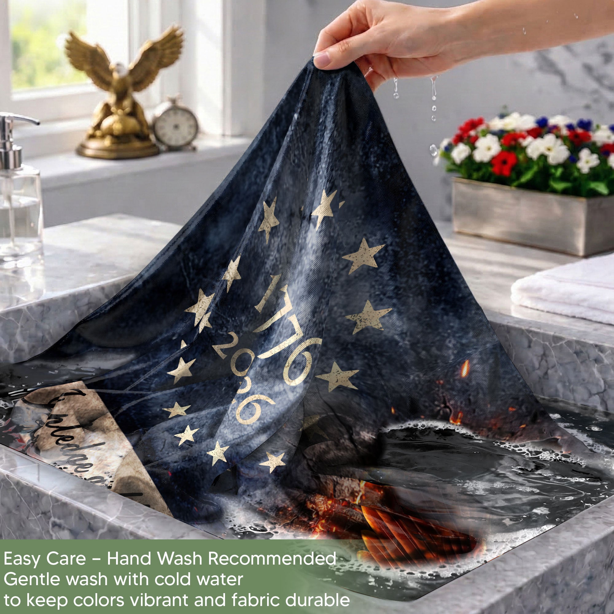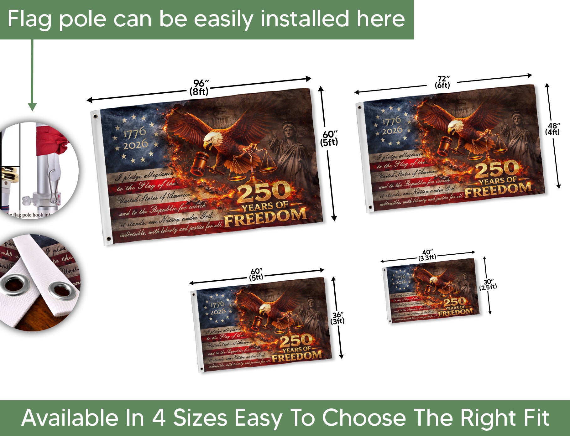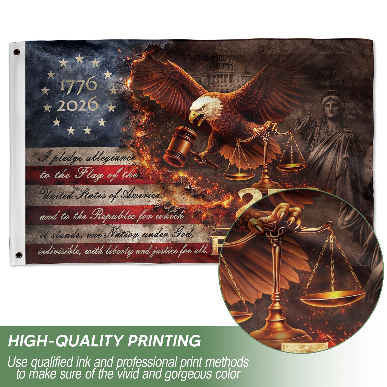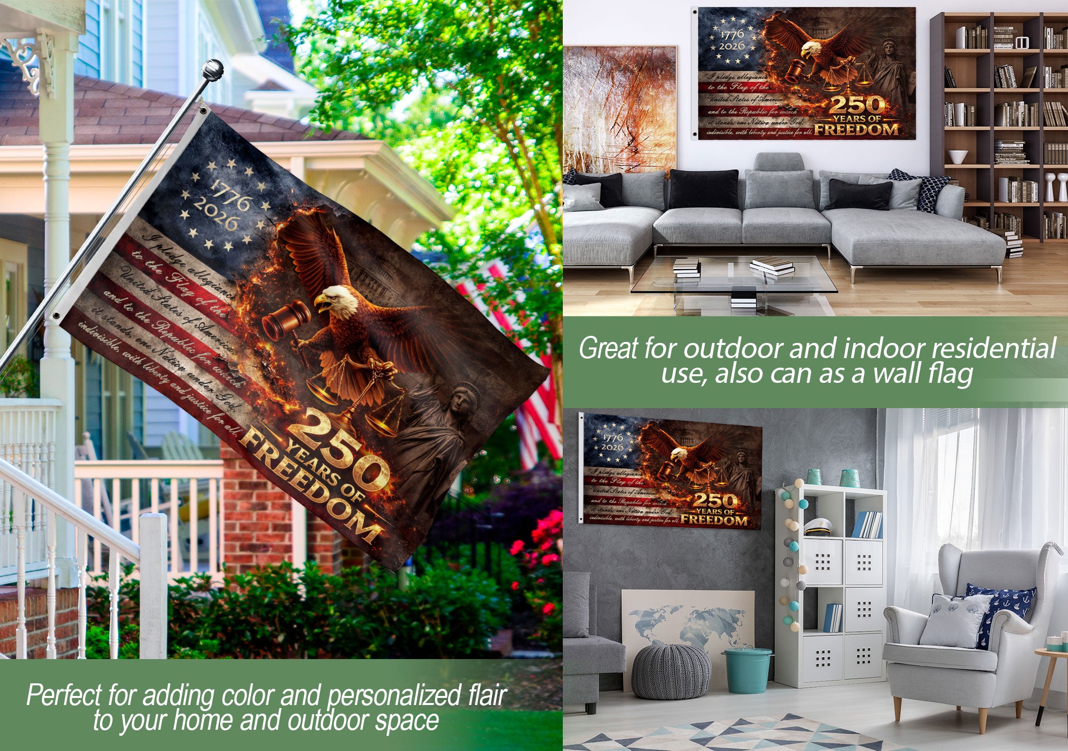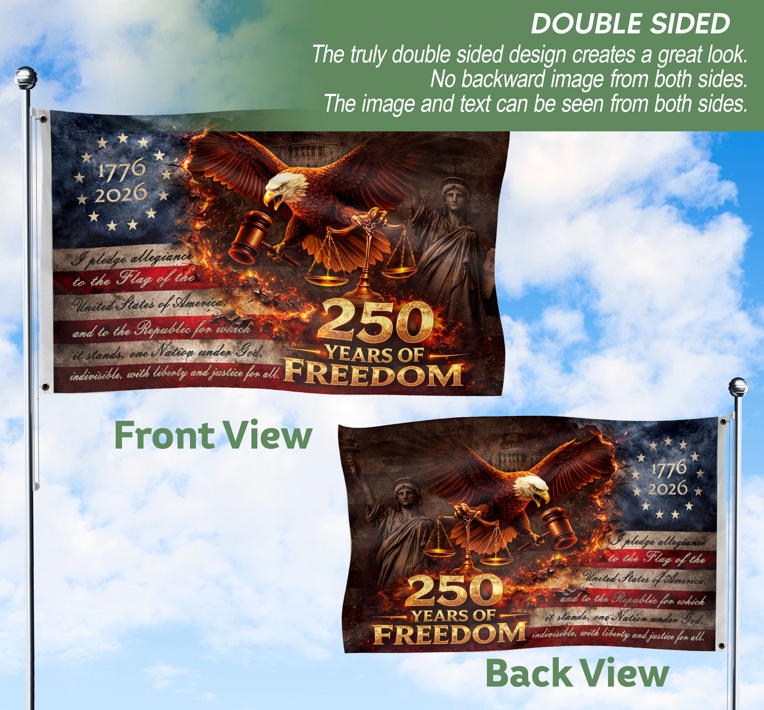 Celebrate America’s 250th anniversary from 1776 to 2026 with this striking Justice Gavel Eagle house flag. Featuring a majestic bald eagle with outspread wings clutching a judicial gavel and scales of justice, set against a dramatic fire-accented backdrop of stars and stripes. The bold ‘We The People’ design embodies patriotic freedom and national pride. Perfect for displaying on your porch, garden, or home to honor the semiquincentennial milestone. Crafted for outdoor durability, this house flag withstands weather while showcasing iconic American symbols.