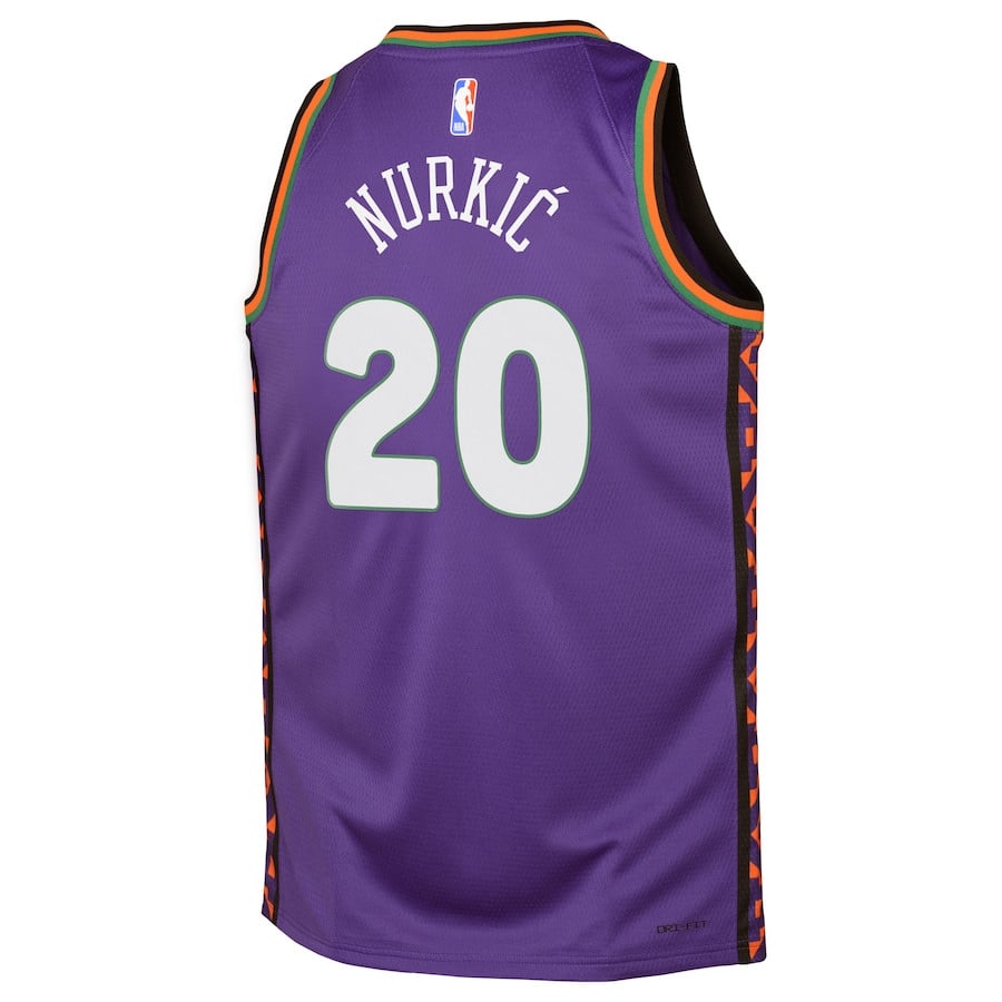 Experience the thrill of Phoenix Suns fandom with this Jusuf Nurkic #20 2024/25 Swingman Youth Jersey in City Edition Purple. Crafted from 100% lightweight polyester, this breathable jersey ensures comfort and coolness during games, training, or casual wear. The classic fit and clean design make it perfect for young fans to show their support. Ideal for basketball enthusiasts, everyday outfits, or team spirit displays. Features authentic styling inspired by the NBA City Edition, available in youth sizes S to 3XL. Durable construction for long-lasting wear. Note: This is a generic sports apparel item, not affiliated with any professional teams or leagues.